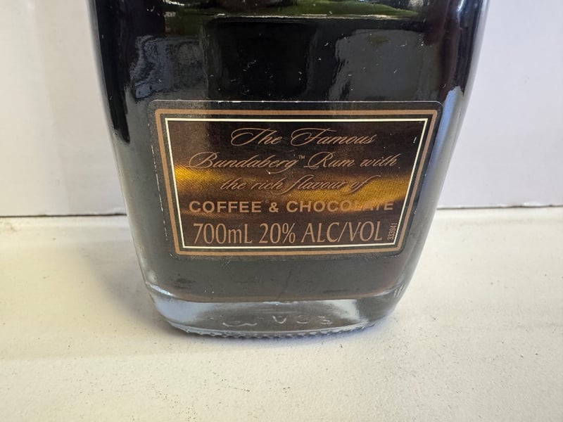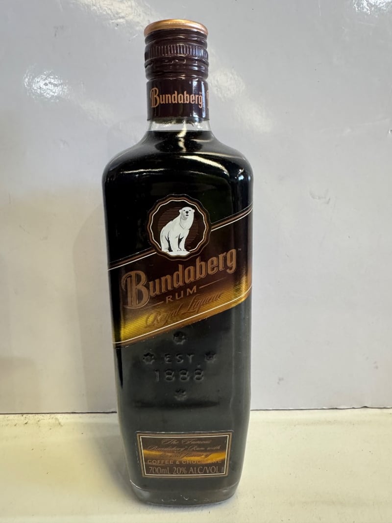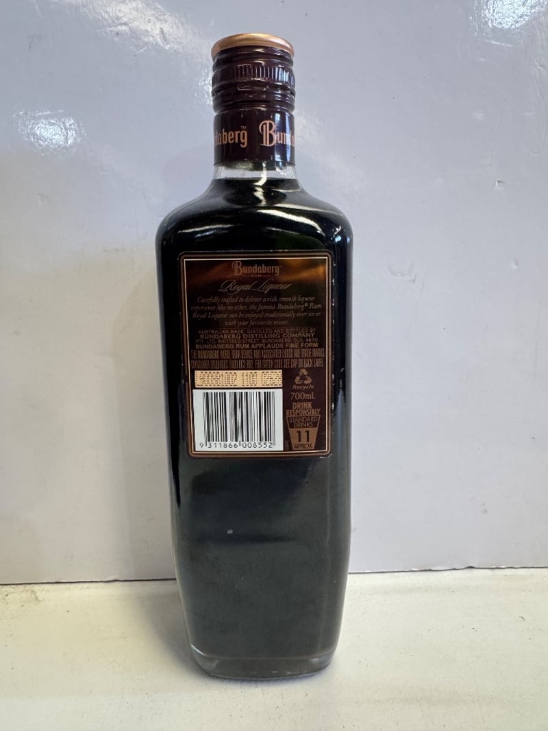 Bundaberg Rum Royal Liqueur, a premium coffee and chocolate flavoured rum liqueur. This 700mL bottle contains 20% alcohol by volume and features the iconic polar bear emblem characteristic of Bundaberg's branding. The bottle displays elegant labelling with gold accents on a dark glass vessel, established 1882. This is a spirits liqueur combining the rich flavours of coffee and chocolate in a smooth rum base, suitable for sipping or mixing in cocktails.
