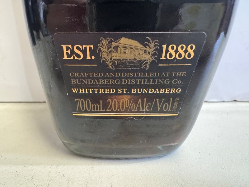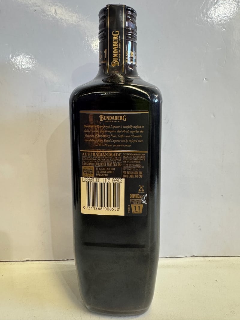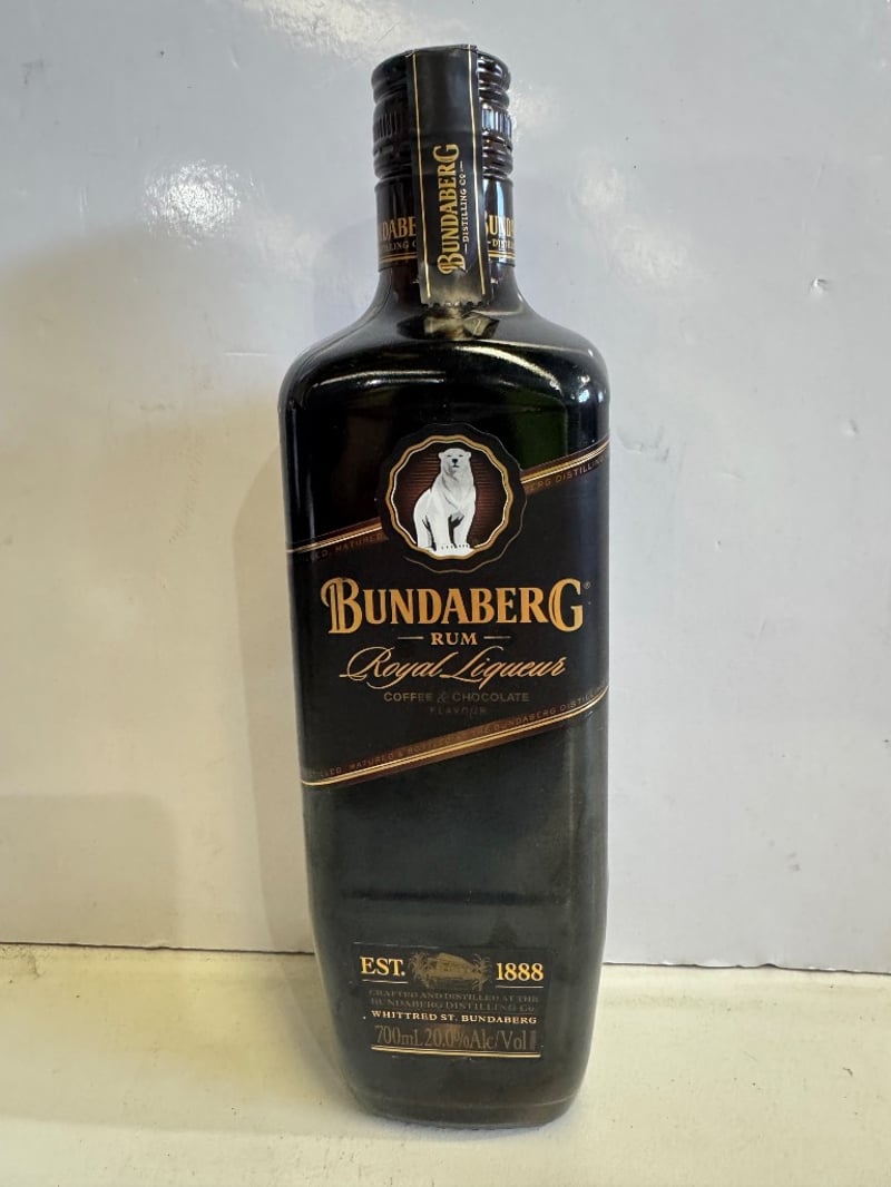 Bundaberg Rum Royal Liqueur, a premium Australian-made spirit from the Bundaberg Distilling Co. located in Whittred St, Bundaberg. This 700ml bottle features a distinctive black glass container with gold embossed labelling. Established in 1888, this coffee and chocolate flavoured rum liqueur is crafted to deliver a rich, elegant taste. The bottle exhibits the classic Bundaberg branding with their iconic polar bear emblem. Alcohol