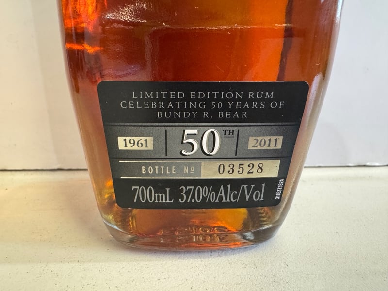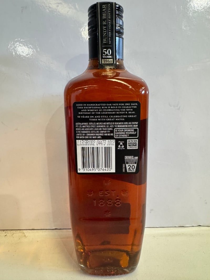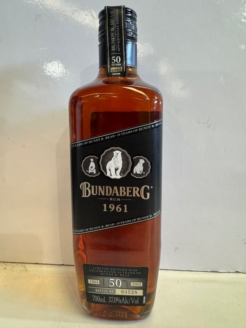 Bundaberg Rum 1961 Limited Edition 50 Years Celebration bottle, vintage Australian rum distilled and bottled by Bundaberg Distilling Company. This commemorative release celebrates 50 years of Bundy R. Bear, aged in handcrafted oak vats for 1961 days. 700mL bottle at 37.0% ABV, bottled in 2011. Bottle number 03528 from the limited edition run. Rich amber liquid with deep mahogany hues. Established 1888 embossed on base. Includes original black label with gold embossed bear imagery and detailed back label describing aging process. Highly collectible Australian spirits item representing significant distillery heritage.