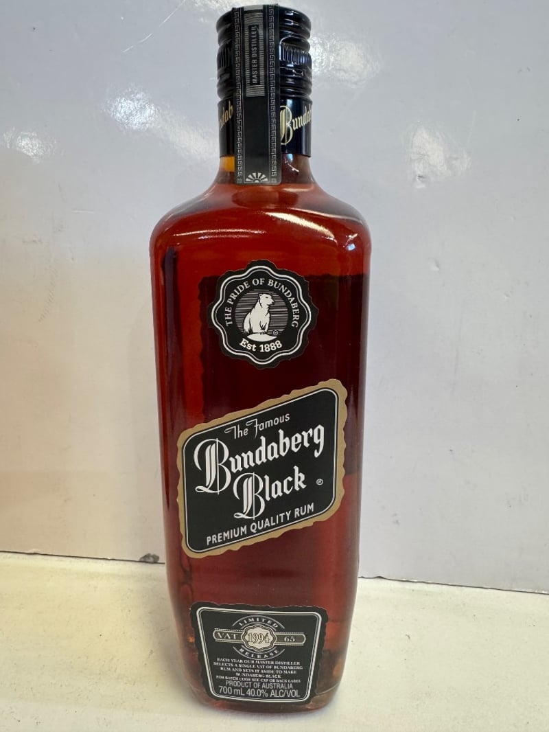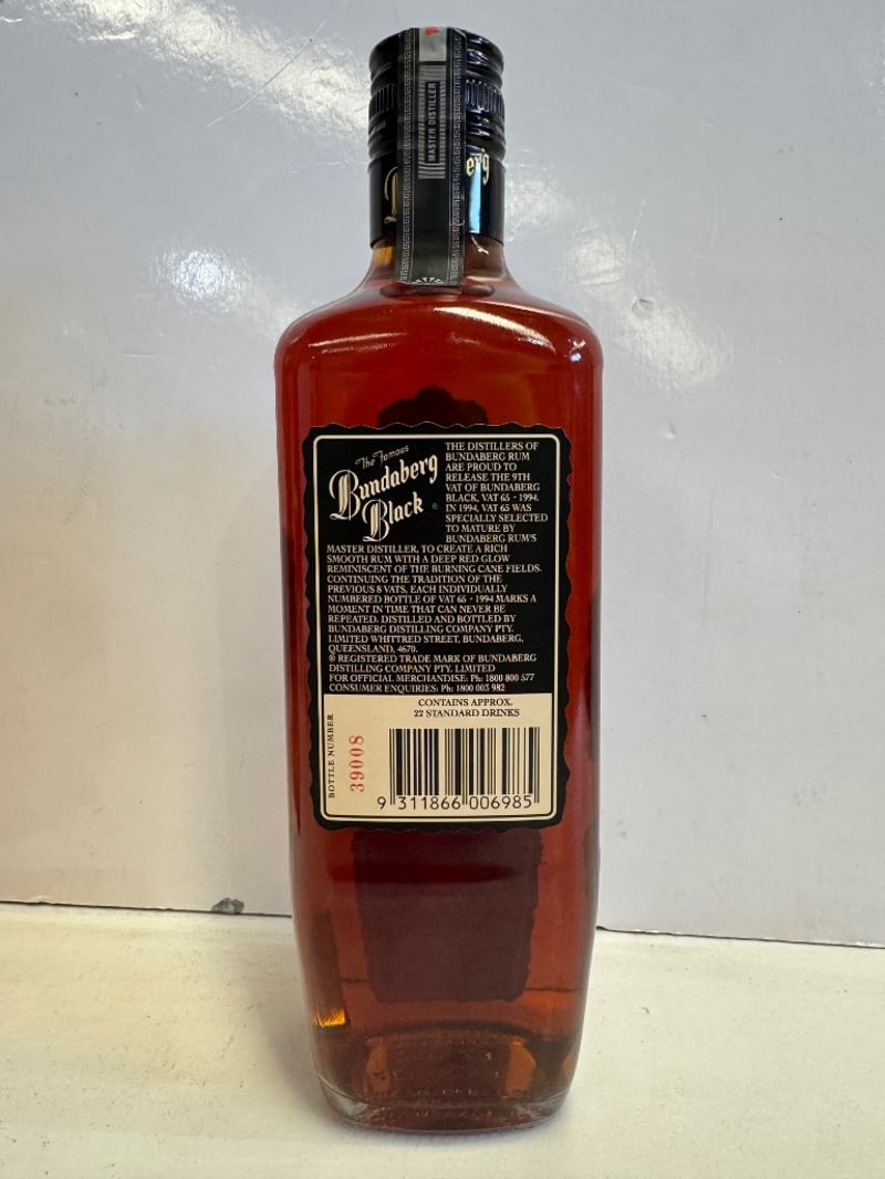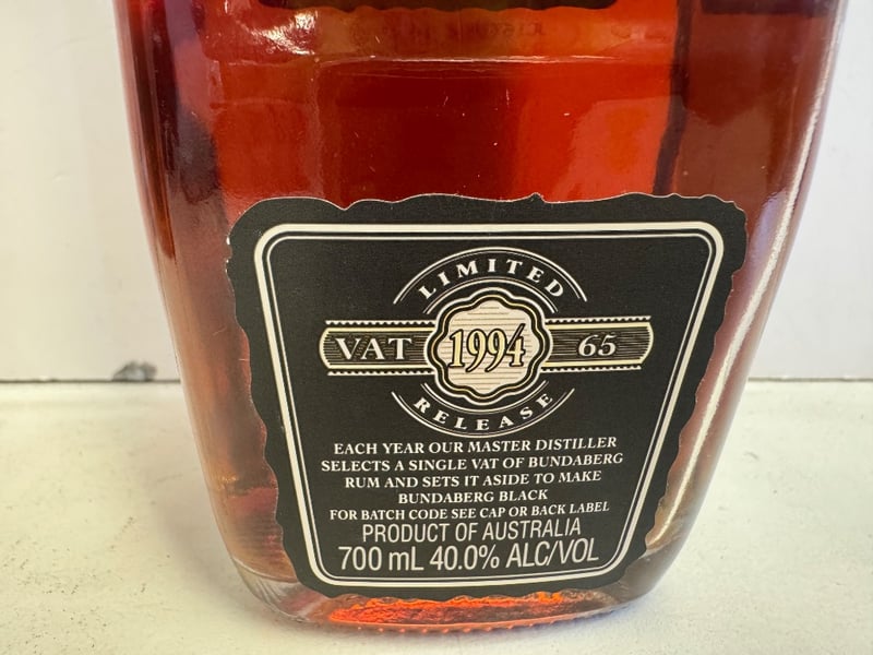 Bundaberg Black Premium Quality Rum, VAT 65 Limited Release 1994. Australian rum distilled and bottled by Bundaberg Distilling Company PTY Limited, Queensland. This is a special vatted release from 1994, representing a single vat of Bundaberg rum selected by the master distiller and set aside specifically for the Black range. The bottle contains 700ml at 40.0% alcohol by volume. Features the classic Bundaberg label with the iconic bear logo established 1888. The distinctive deep amber liquid visible through the glass indicates maturation and quality. Back label provides full provenance and production details. This collectible Australian rum represents a premium vintage bottling from the renowned Bundaberg distillery.