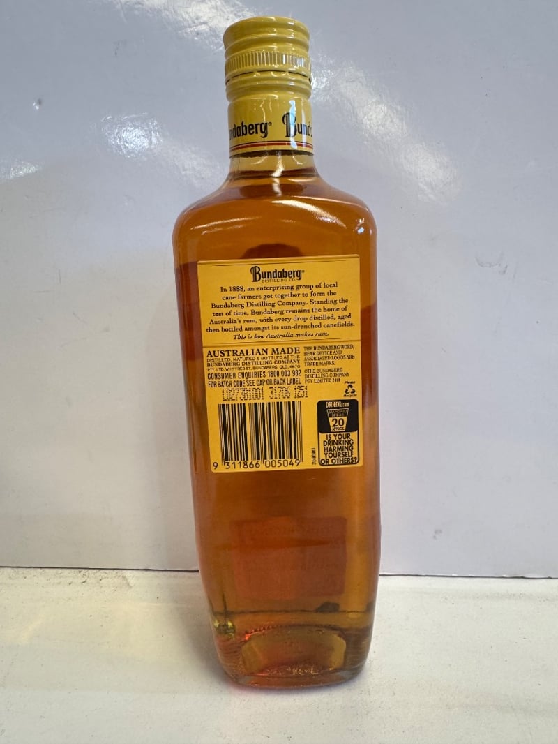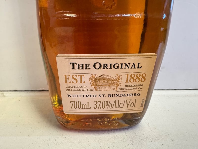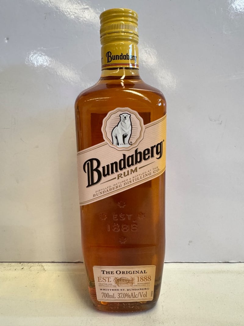 Bundaberg Rum "The Original" 700ml bottle, 37.0% alcohol by volume, established 1888. Australian-made rum from Whittred St. Bundaberg distillery. Classic gold foil-wrapped cap with vintage label design featuring the iconic polar bear emblem. Full bottle with amber/golden spirit visible. Label includes production details, barcode, and Australian Standard drink information. Vintage packaging suggests this is from an earlier production run. Ideal for collectors of Australian spirits or rum enthusiasts seeking authentic heritage distillery product.