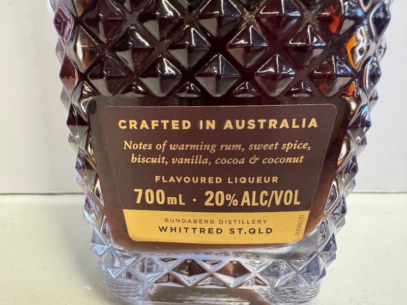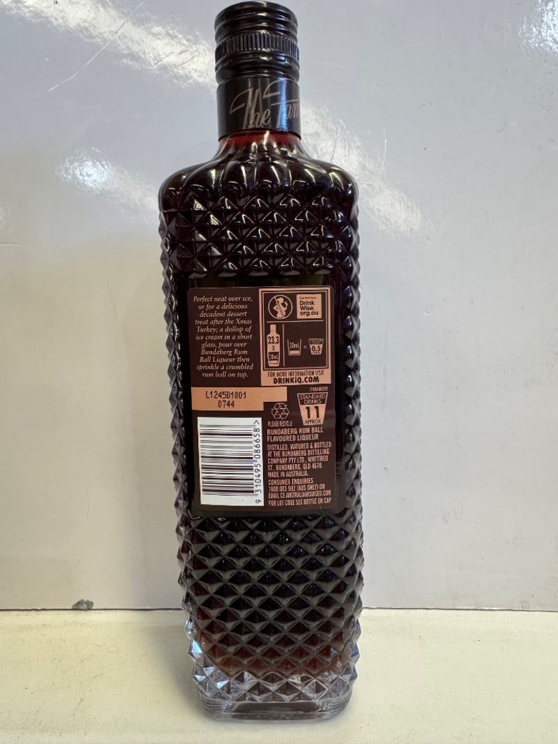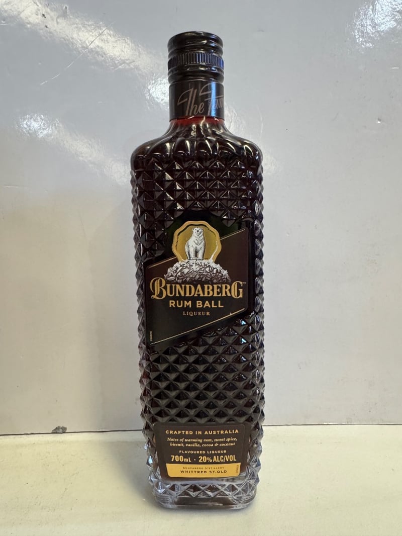 Bundaberg Rum Ball Liqueur is an Australian-crafted flavoured rum liqueur produced by Bundaberg Distillery in Whittred, Queensland. This 700ml bottle contains 20% alcohol by volume and features a distinctive dark glass vessel with embossed diamond pattern detailing. The liqueur exhibits notes of warming rum, sweet spice, biscuit, vanilla, cocoa, and coconut. The bottle is sealed with a black screw cap and bears the characteristic moulded branding and gold foil label. Ideal served neat over ice or as a dessert ingredient. Presented in excellent retail condition with intact labelling and professional presentation.