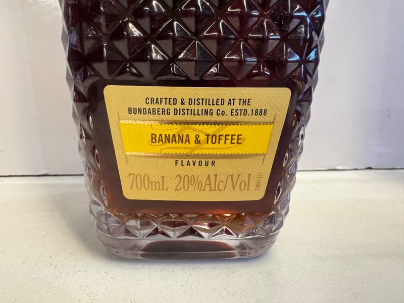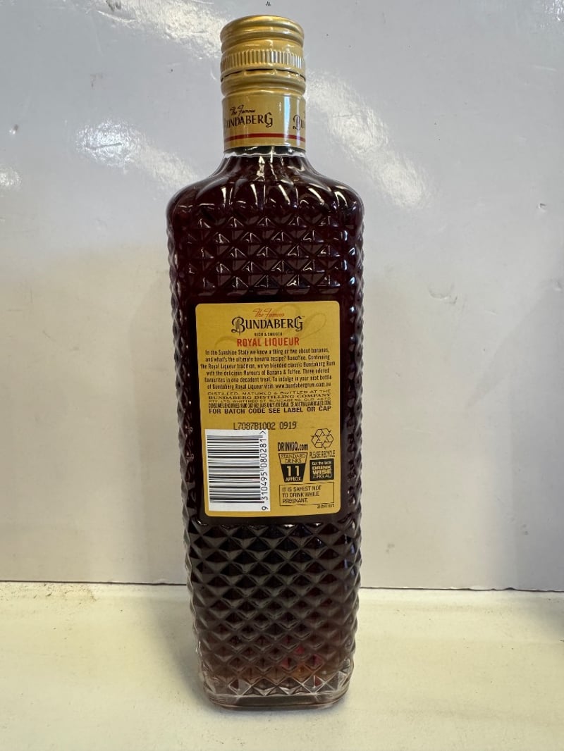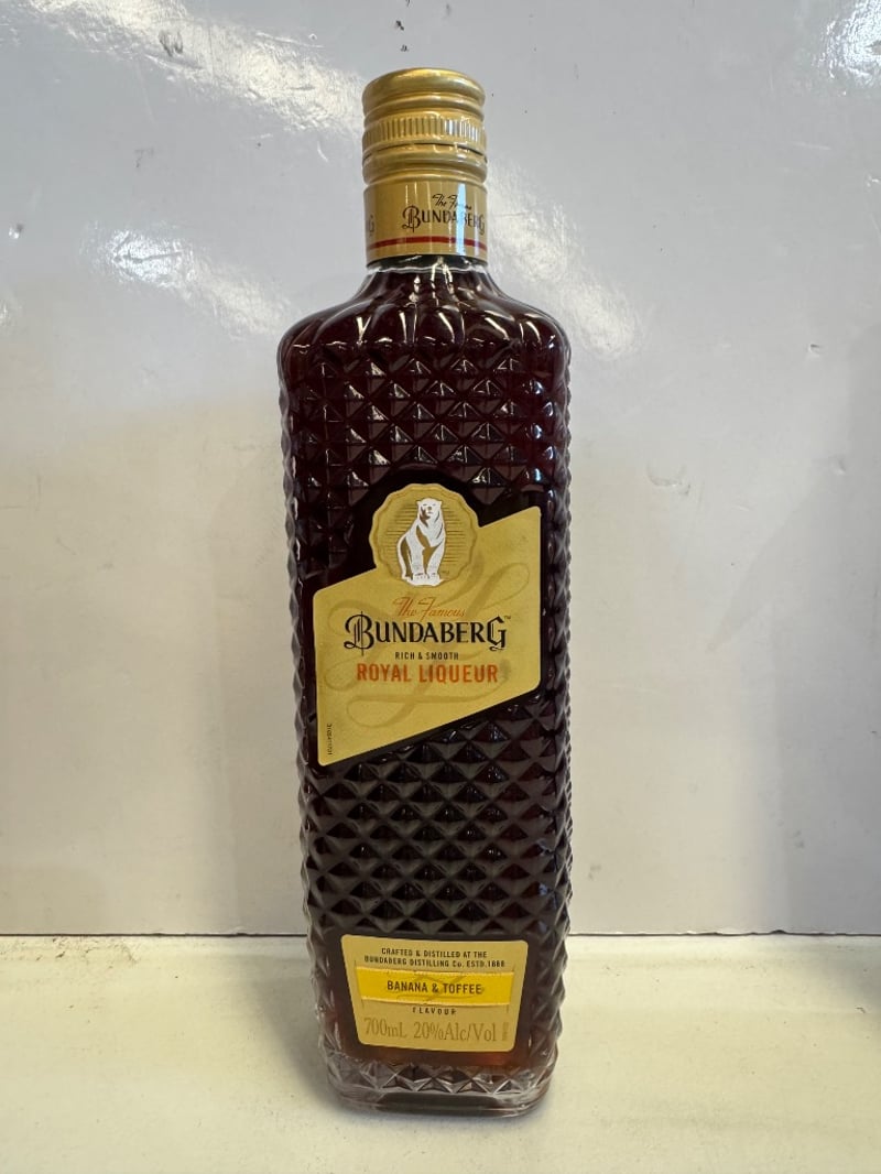 Bundaberg Royal Liqueur Banana & Toffee flavoured spirit. 700ml bottle containing 20% alc/vol. Crafted and distilled at the Bundaberg Distilling Co., established 1888. Features distinctive quilted dark glass bottle with gold foil-sealed cap and yellow brand label. Rich and smooth banana and toffee flavour profile. Batch code L7057B102 0919 visible on rear label. Appears unopened with original labelling intact.