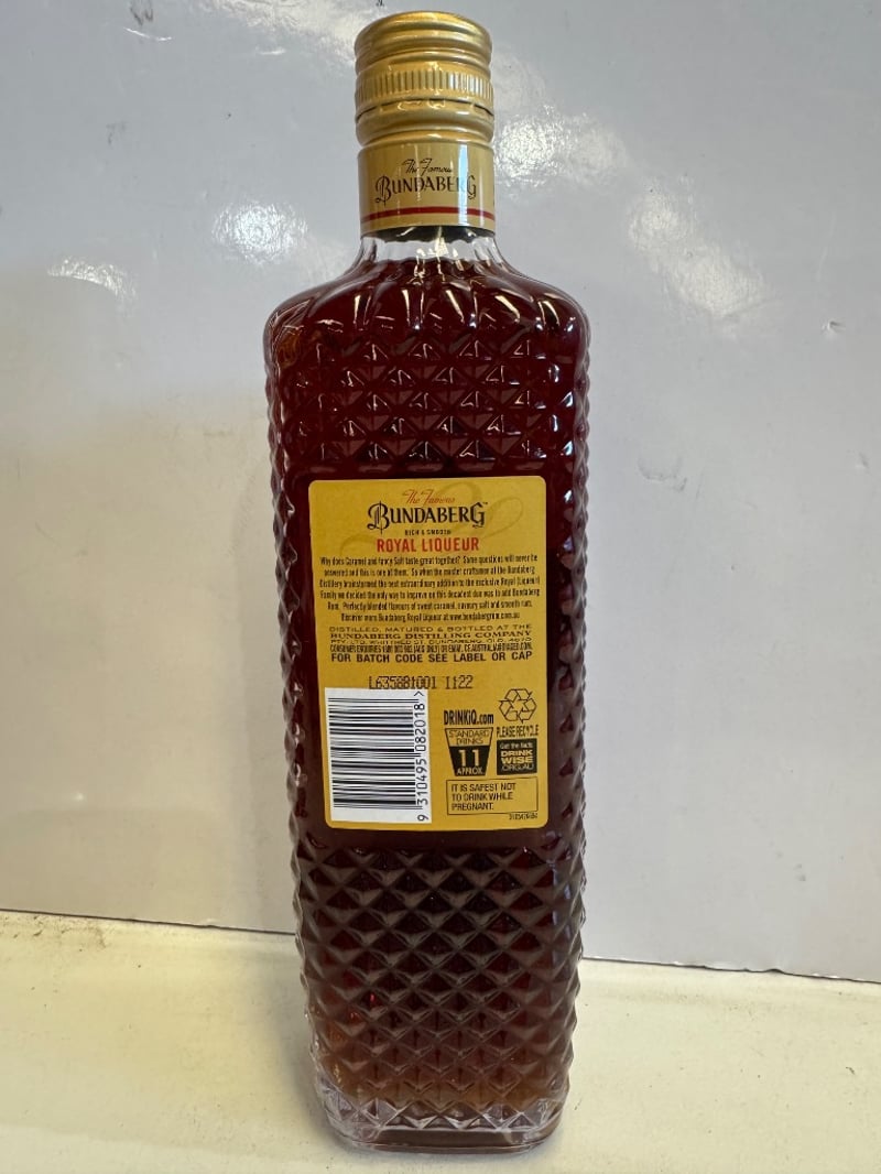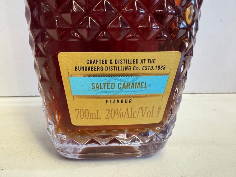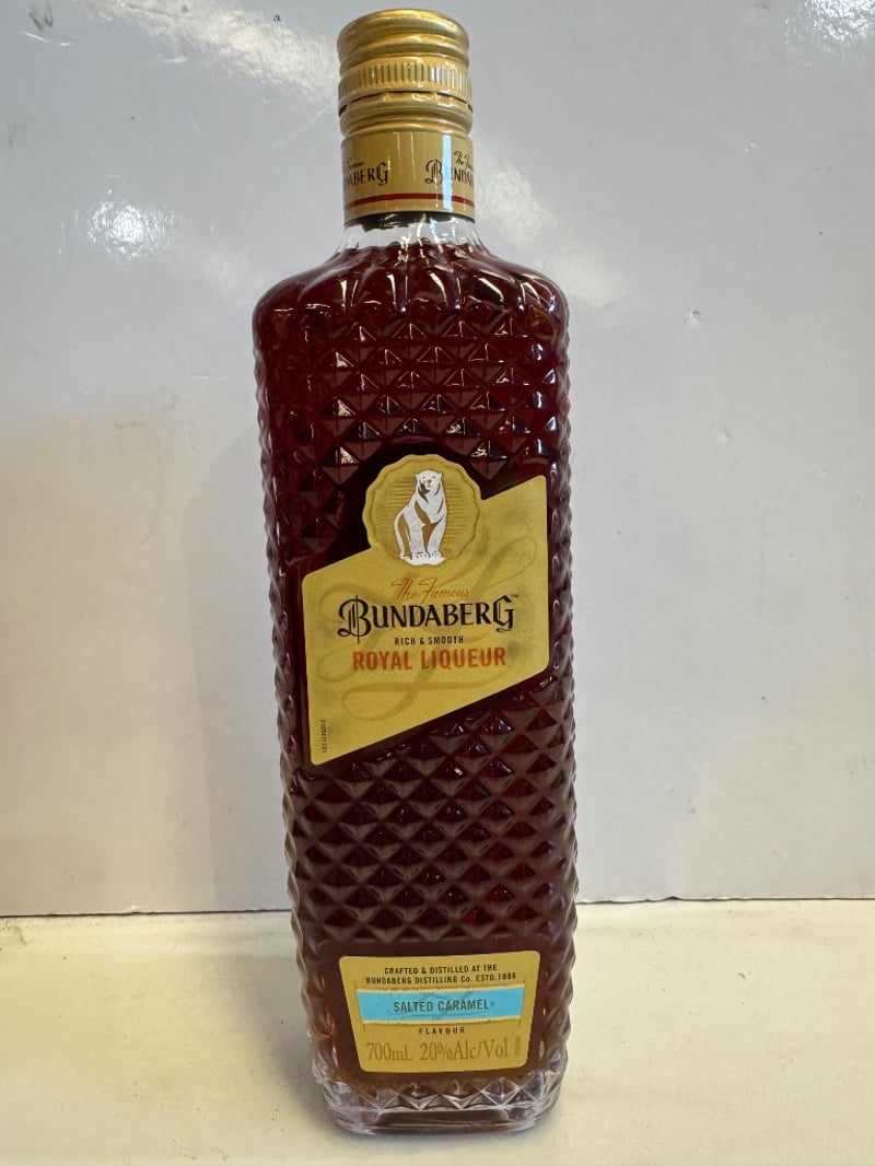 Bundaberg Royal Liqueur Salted Caramel 700mL bottle, 20% alcohol by volume. Crafted and distilled by Bundaberg Distilling Co., established 1888. Features distinctive deep burgundy quilted glass bottle with gold foil capsule seal. Label displays "Rich & Smooth" designation with salted caramel flavour specification. Batch code L6536801 1122 visible on reverse. Full sealed condition with intact labelling. Australian-produced premium spirit liqueur renowned for its distinctive sweet and savoury caramel profile.