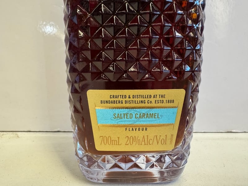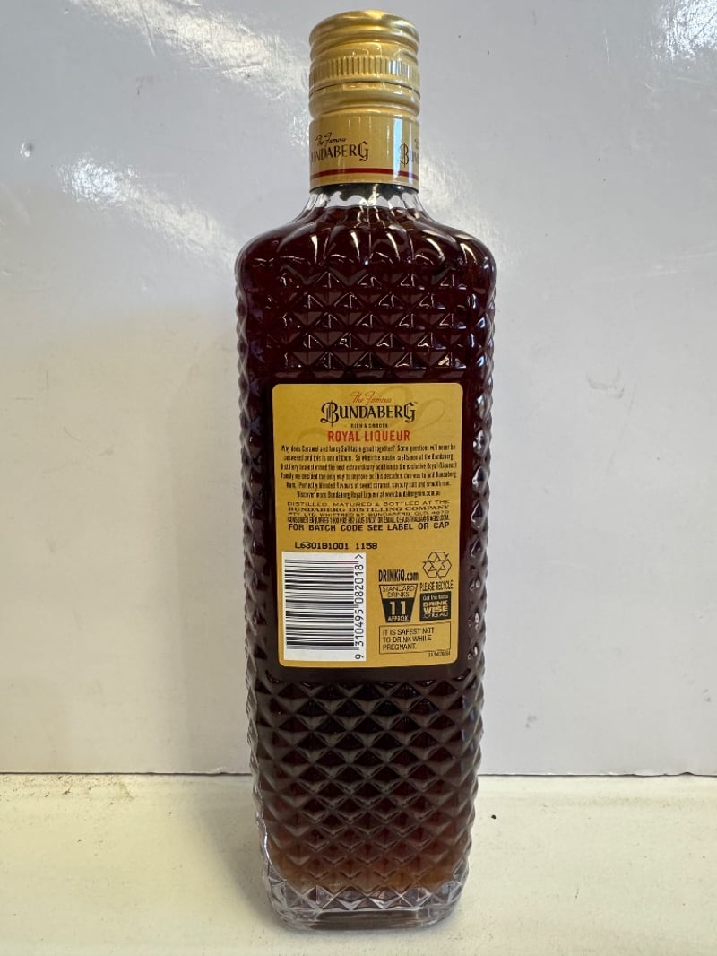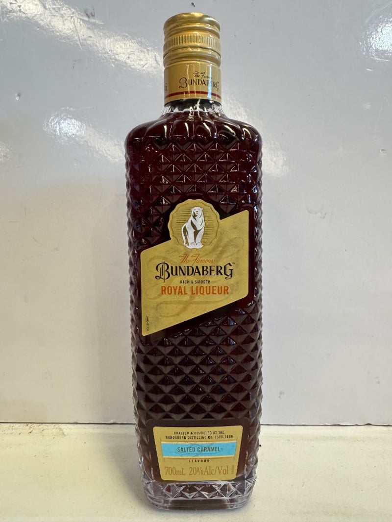 Bundaberg Royal Liqueur Salted Caramel, 700mL bottle at 20% ABV. This premium Australian spirit is crafted and distilled by the Bundaberg Distilling Company, established 1888. Features the iconic polar bear emblem on a gold label against a distinctive deep burgundy faceted glass bottle with geometric diamond pattern. The salted caramel flavour variant offers a rich, smooth liqueur profile. Bottle includes full labelling with batch code information visible on reverse. A classic Australian spirits offering in excellent presentation condition.