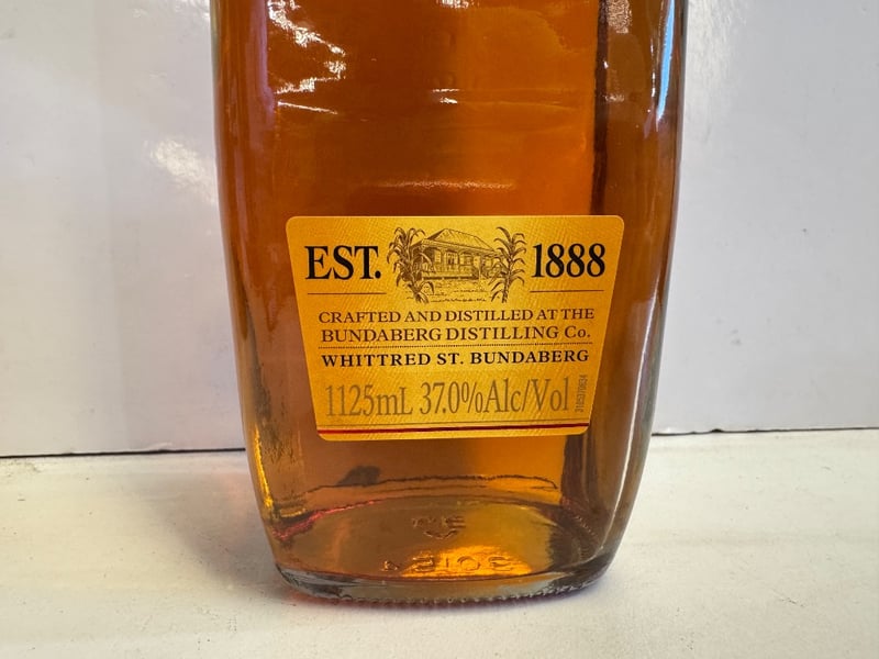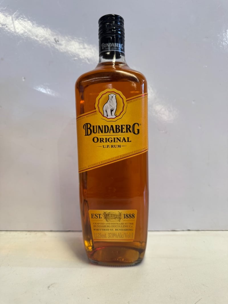 Bundaberg Original U.P. Rum, a premium Australian spirit established 1888. This 1125ml bottle features 37.0% alcohol by volume and is crafted and distilled at the Bundaberg Distilling Company in Whittred Street, Bundaberg, Queensland. The bottle displays the iconic polar bear motif on the label, characteristic of this heritage Australian rum brand. The spirit shows a rich amber hue typical of quality rum production. This vintage bottle represents classic Australian rum-making heritage and craftsmanship from one of the country's most recognised distilleries.