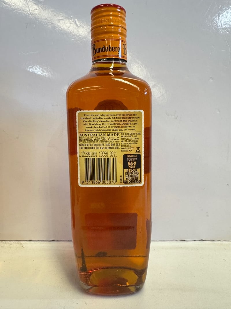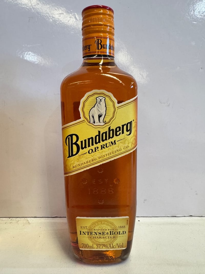 Bundaberg O.P. Rum, 700ml bottle, 57.7% alcohol by volume. Established 1888, crafted by Bundaberg Distilling Company, Australia. "Intense & Bold Character" expression, presented in original amber glass bottle with yellow and gold label featuring the iconic polar bear motif. Label indicates "Over Proof" designation. Back label details the heritage and distillation process, noting oak aging and strength characteristics typical of overproof Australian rum. Bottle appears to be in retail condition with intact labeling and sealed presentation. A classic Australian spirit representing over a century of distilling tradition.