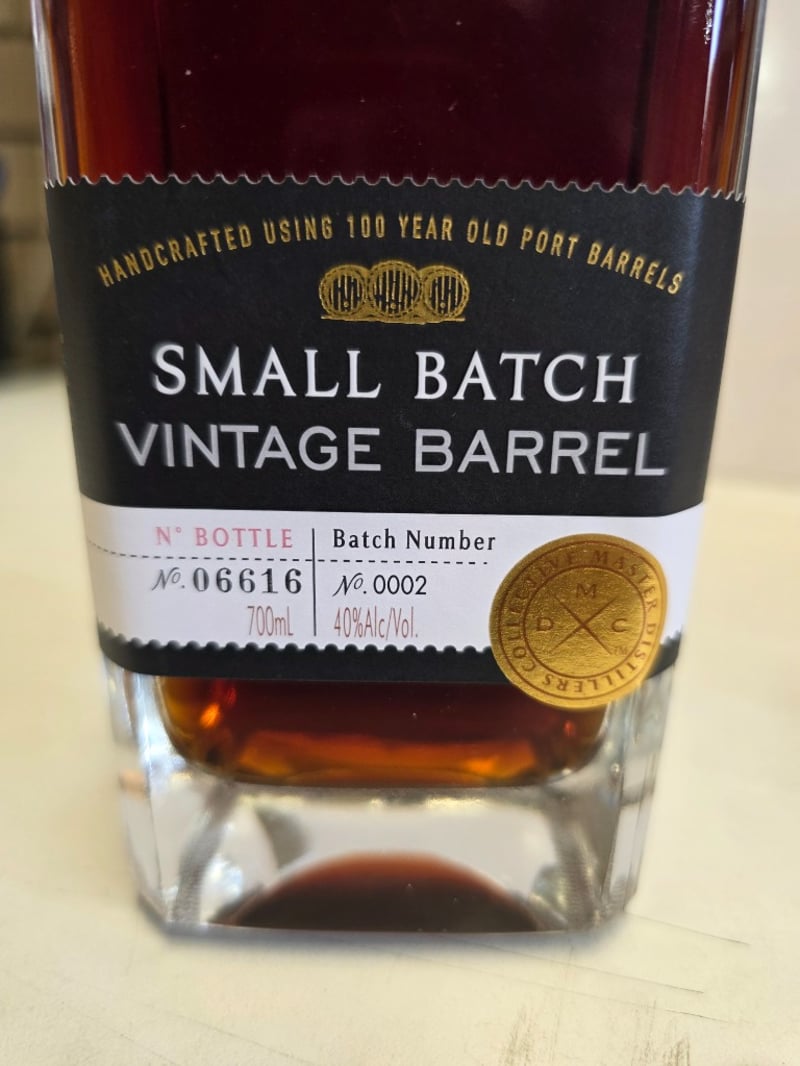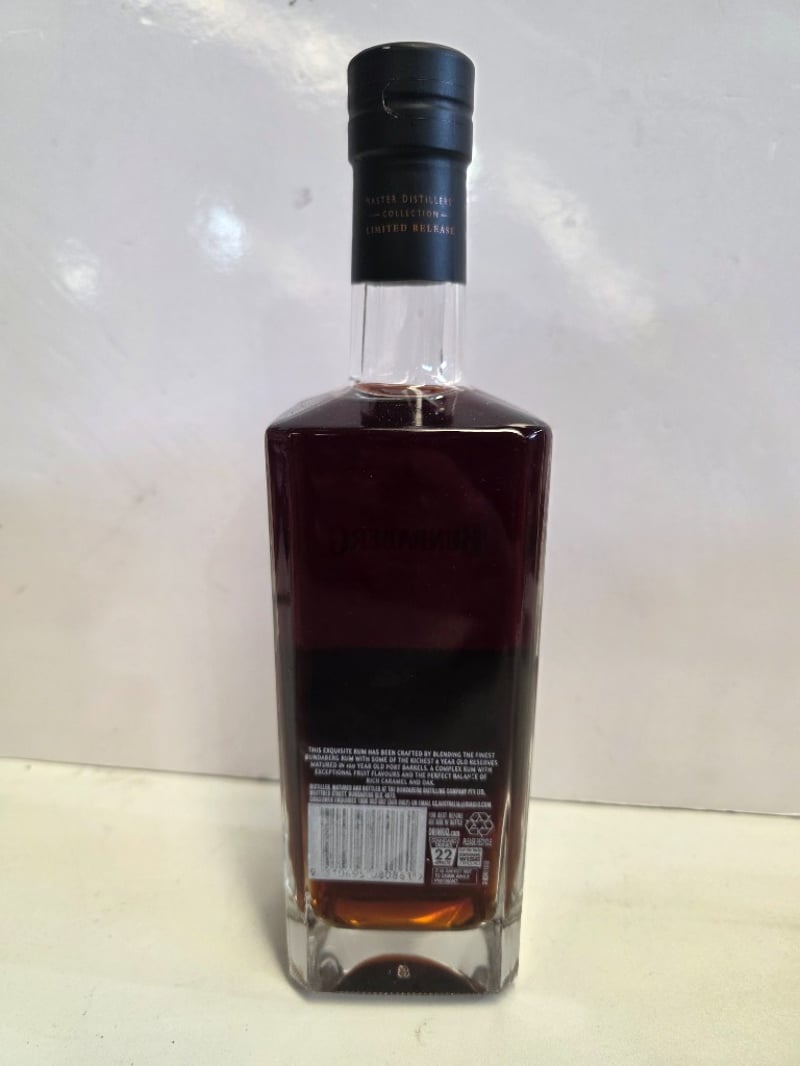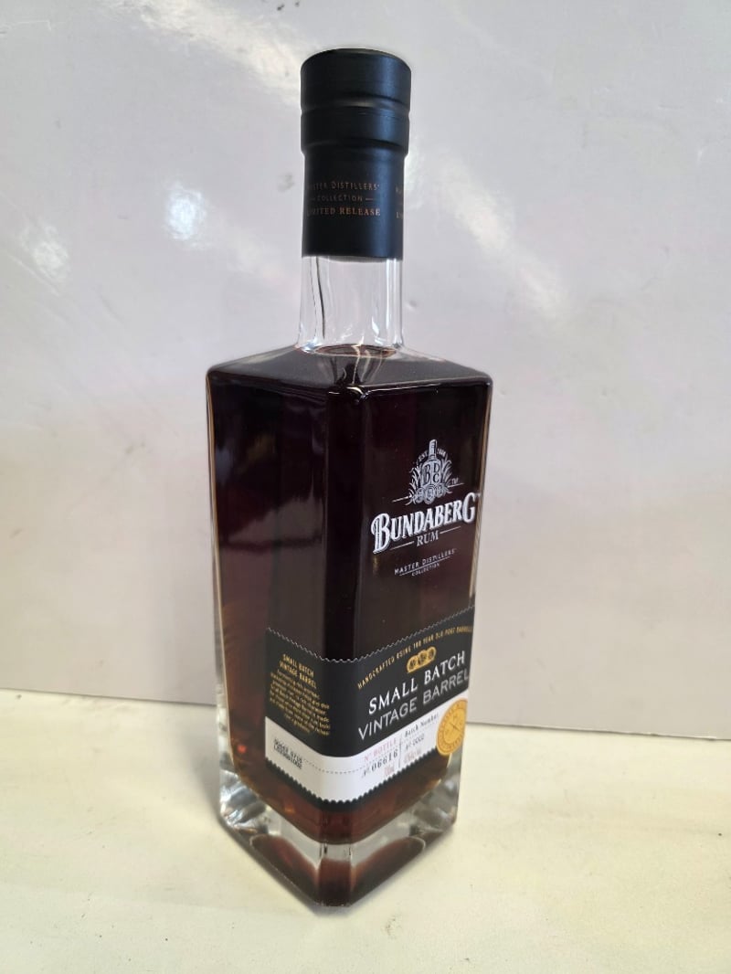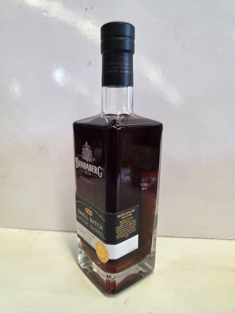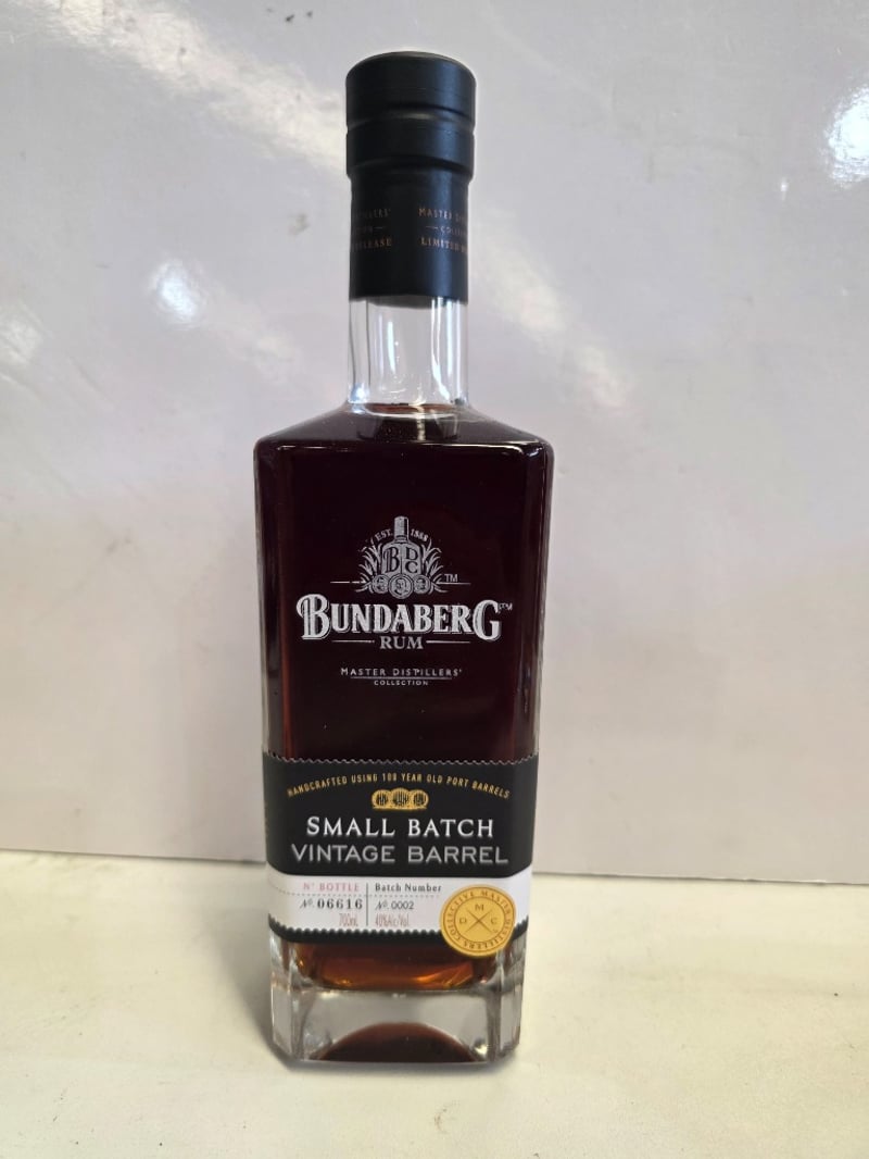 Bundaberg Rum Master Distillers' Collection Small Batch Vintage Barrel, 700mL bottle, 40% ABV. Handcrafted using 100-year-old Port barrels. Batch Number 0002, Bottle Number 06616. This premium Australian rum represents the distillery's commitment to small-batch excellence, aged and matured in heritage Port wine casks to impart complex flavour profiles. The bottle features a distinctive square glass design with black capsule closure and gold foil seal. Master Distillers' Collection designation indicates limited release status. Liquid level appears optimal with rich amber-to-mahogany colouration characteristic of Port barrel maturation. Presented in original packaging with detailed batch identification and alcohol content clearly marked.