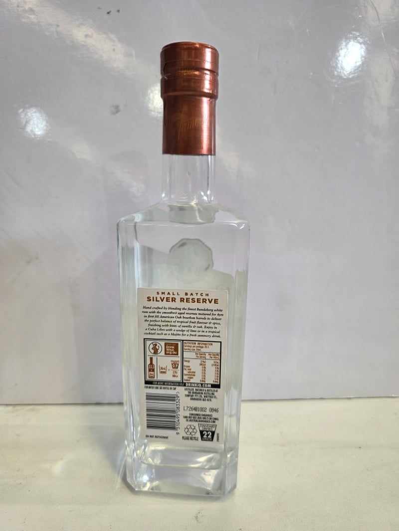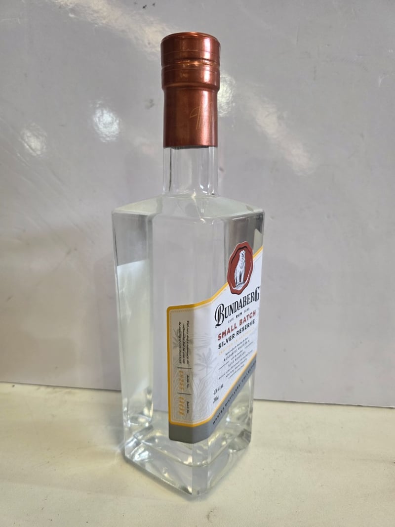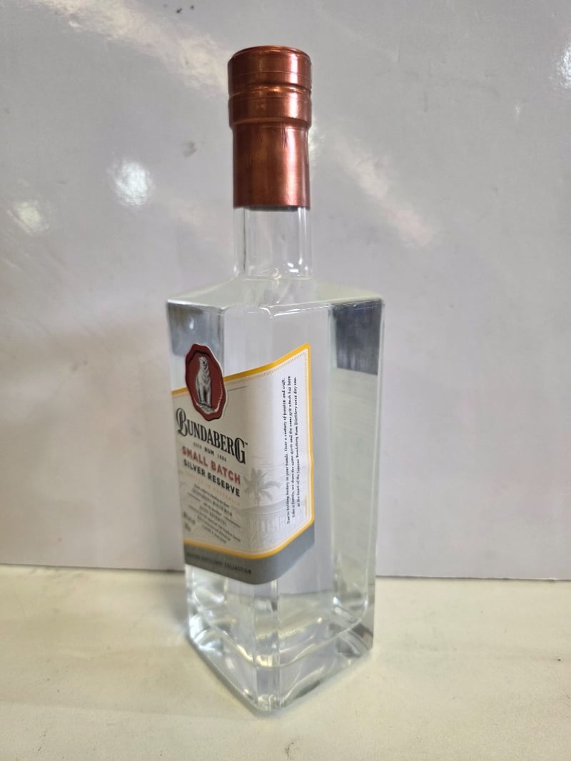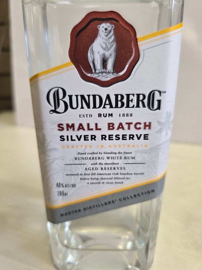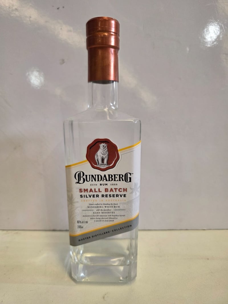 Bundaberg Small Batch Silver Reserve rum, 700ml bottle, 40% ABV. Crafted by blending fine Bundaberg white rum with aged reserves matured in first-fill American oak bourbon barrels, then charcoal filtered for a smooth finish. Established 1888, this Master Distillers' Collection expression features the iconic polar bear emblem on burgundy seal. Bottle displays clear liquid with copper foil-wrapped cap. Label indicates batch number 0256 with production details visible. Condition shows minimal wear consistent with display or light collection use.