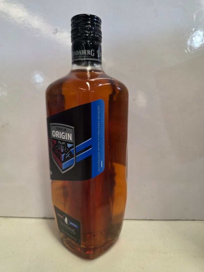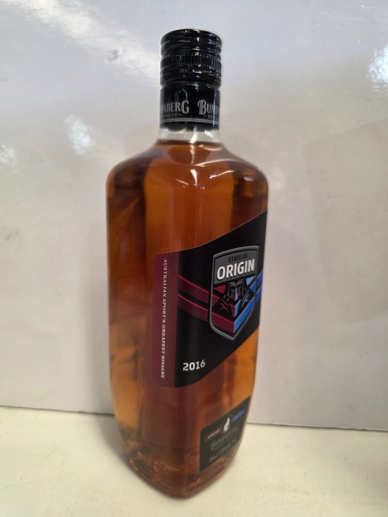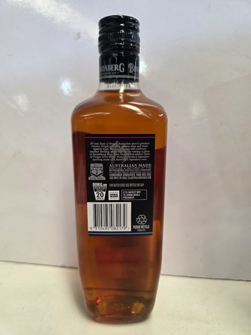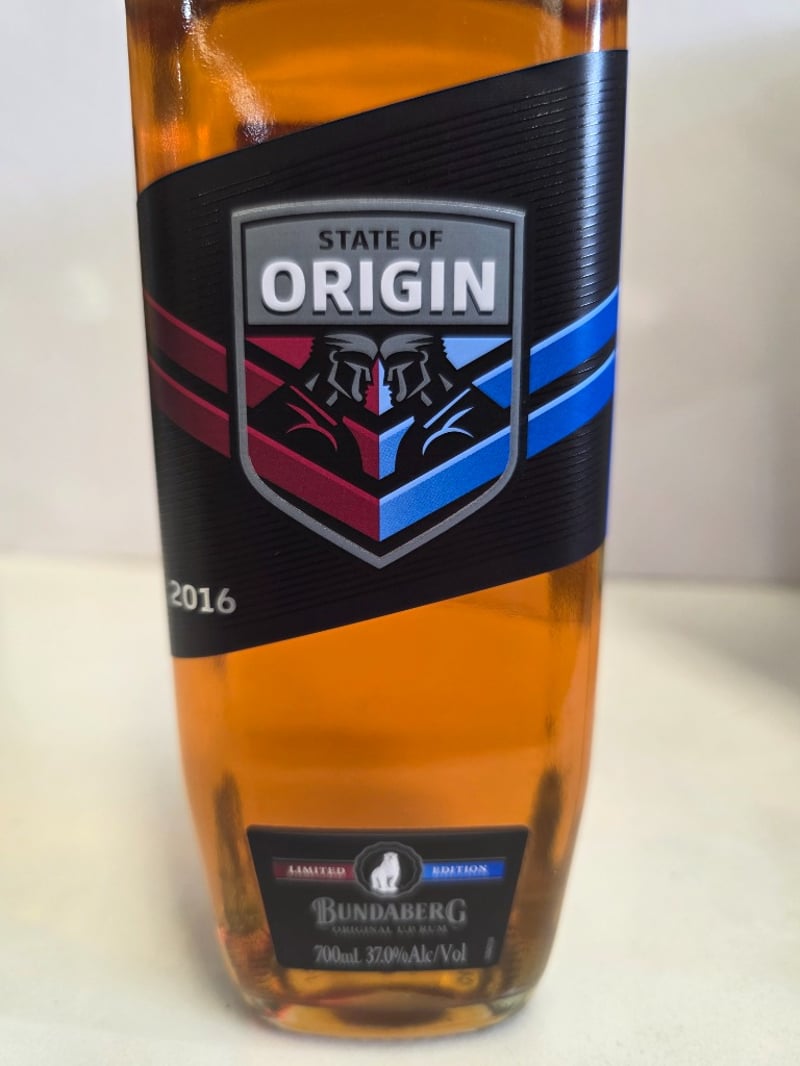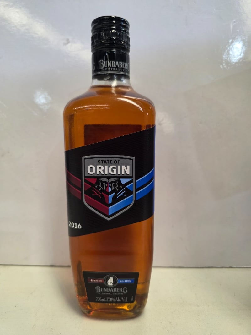 Bundaberg Distilling Co. 2016 State of Origin Limited Edition rum, 700ml bottle at 37.0% alcohol by volume. This commemorative release features the iconic State of Origin rugby league branding with red and blue team colours on black label. Australian-made spirit from the renowned Bundaberg Distillery. Bottle shows good fill level with amber-coloured liquid. Limited edition collectible with full labelling intact including barcode and product information on reverse. Cap seal present and secure.