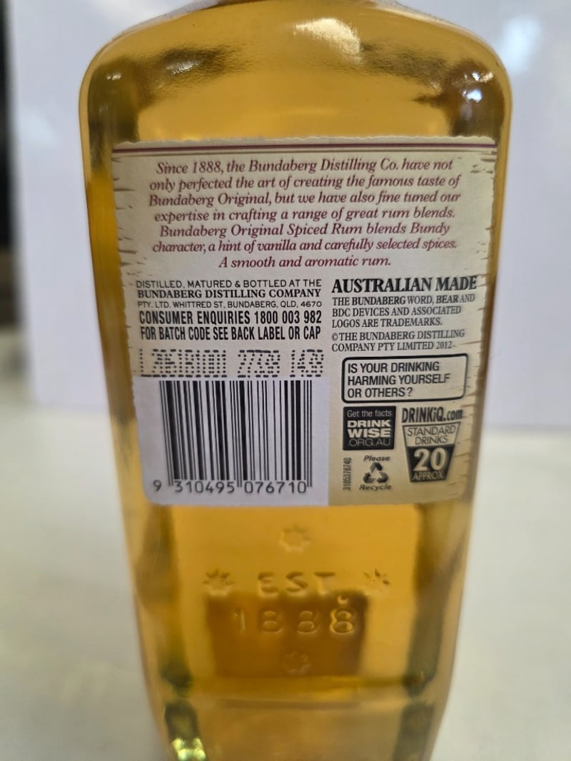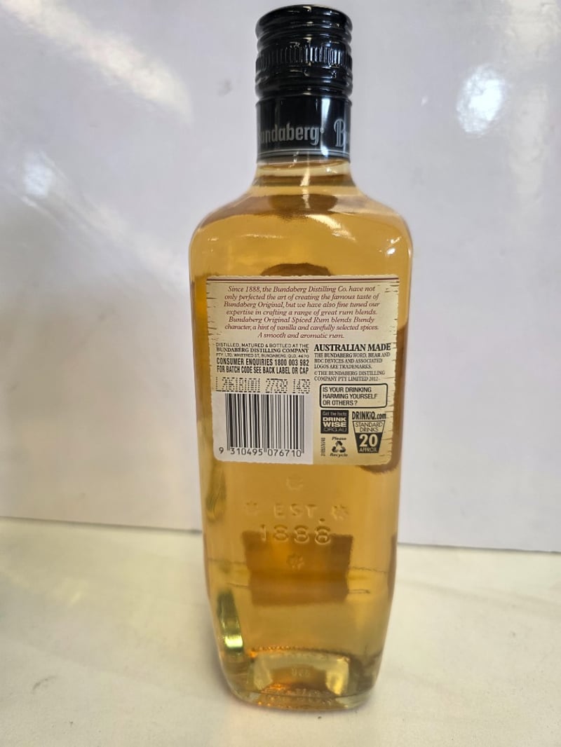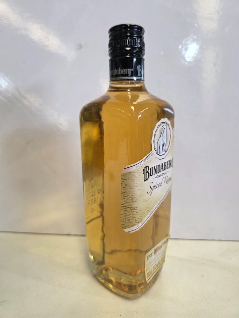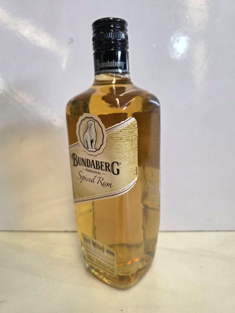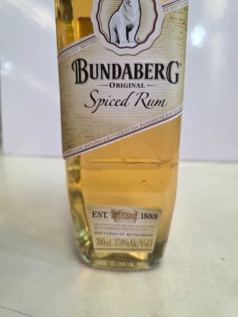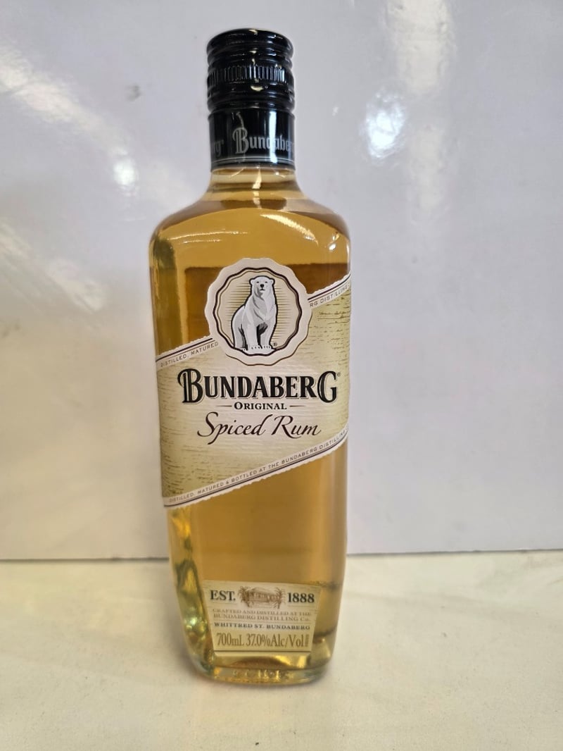 Bundaberg Original Spiced Rum, 700ml bottle, 37.0% alcohol by volume. Australian-made spirit distilled, matured and bottled at the Bundaberg Distilling Company, Whittred Street, Bundaberg, Queensland. Established 1888. The rum blends bundy character with hints of vanilla and carefully selected spices for a smooth, aromatic profile. Features the iconic polar bear logo on cream-coloured label. Bottle shows clear golden-amber liquid. Back label includes consumer enquiries contact number (1800 003 982), batch code reference, and standard drinks information (20 per bottle). Condition reflects age-appropriate wear consistent with storage.