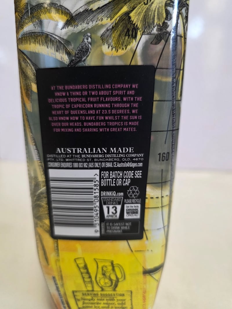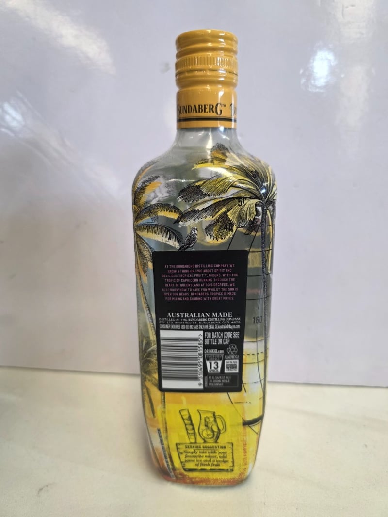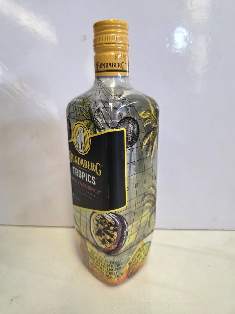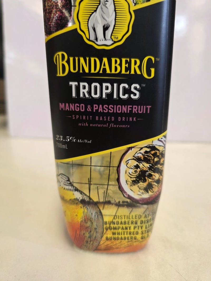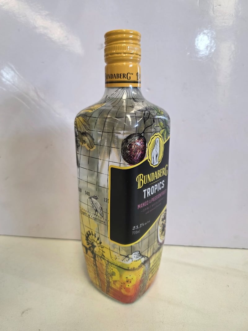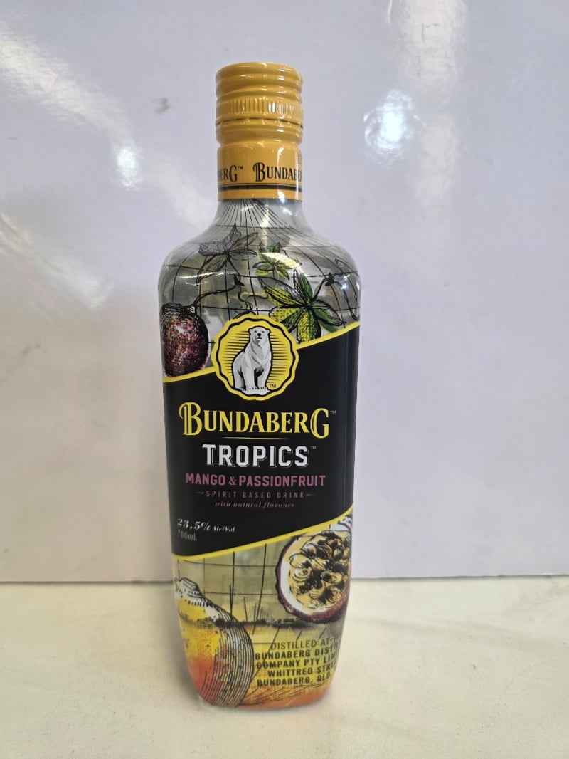 Bundaberg Tropics Mango & Passionfruit spirit-based drink, 700mL bottle, 23.5% alc/vol. Australian-made spirit featuring natural mango and passionfruit flavours, distilled at Bundaberg Distilling Company, Whittred Street, Bundaberg, Queensland. Features distinctive tropical-themed label with palm tree and passionfruit illustrations, gold foil cap with tamper seal intact. Bottle displays grid pattern overlay design with vibrant yellow, orange and purple gradient colouring. Back label includes brand narrative and product information. Batch code visible on cap. Suitable for mixing and sharing. Unopened, sealed condition.