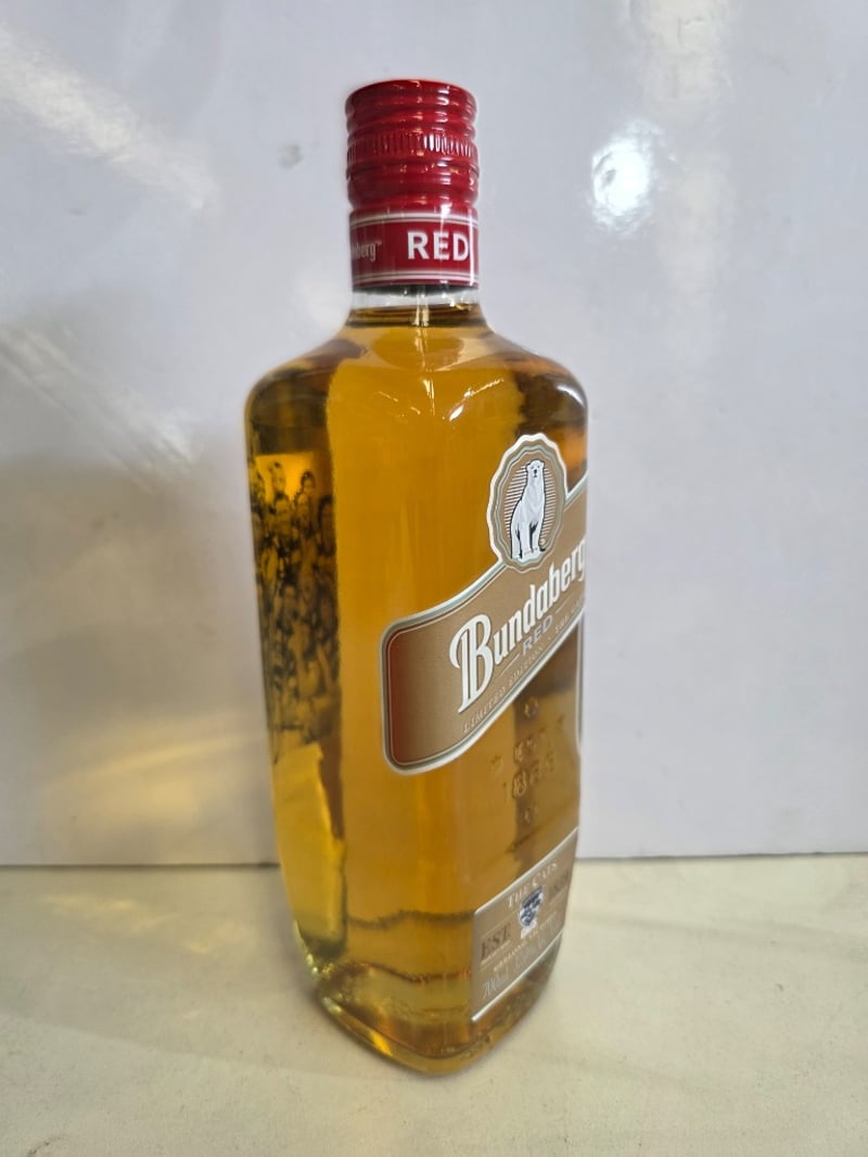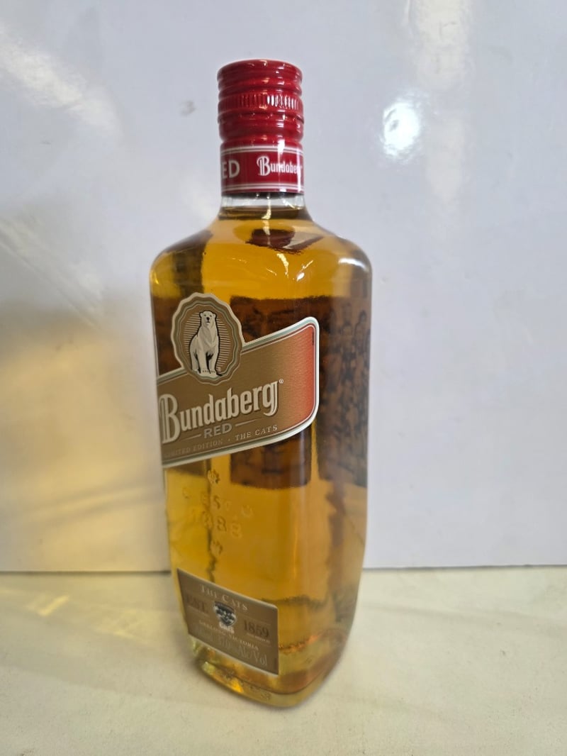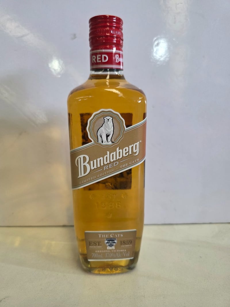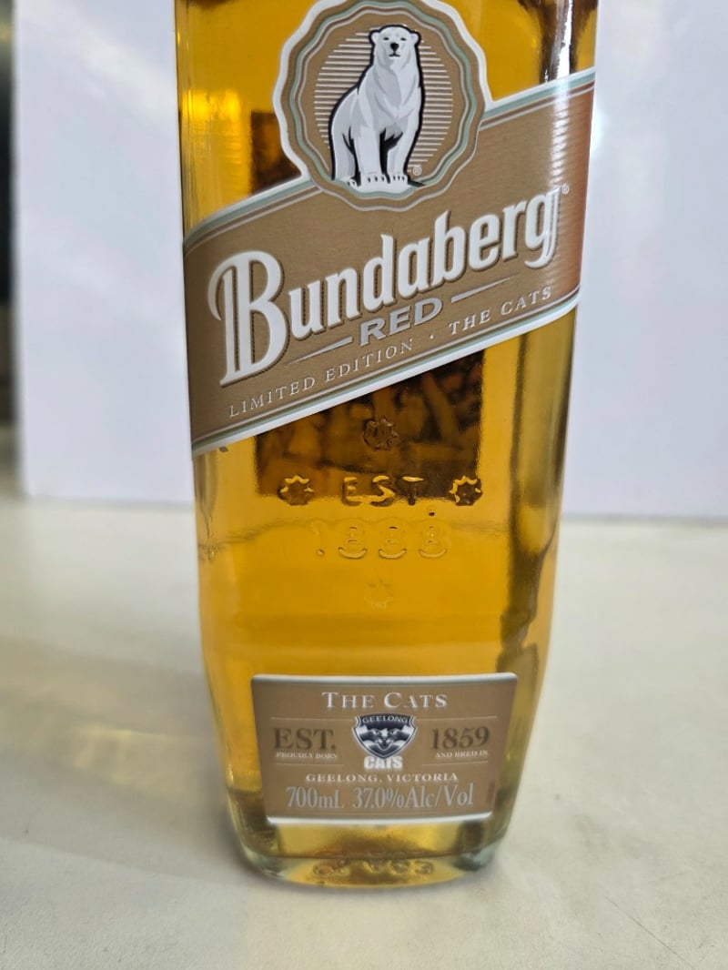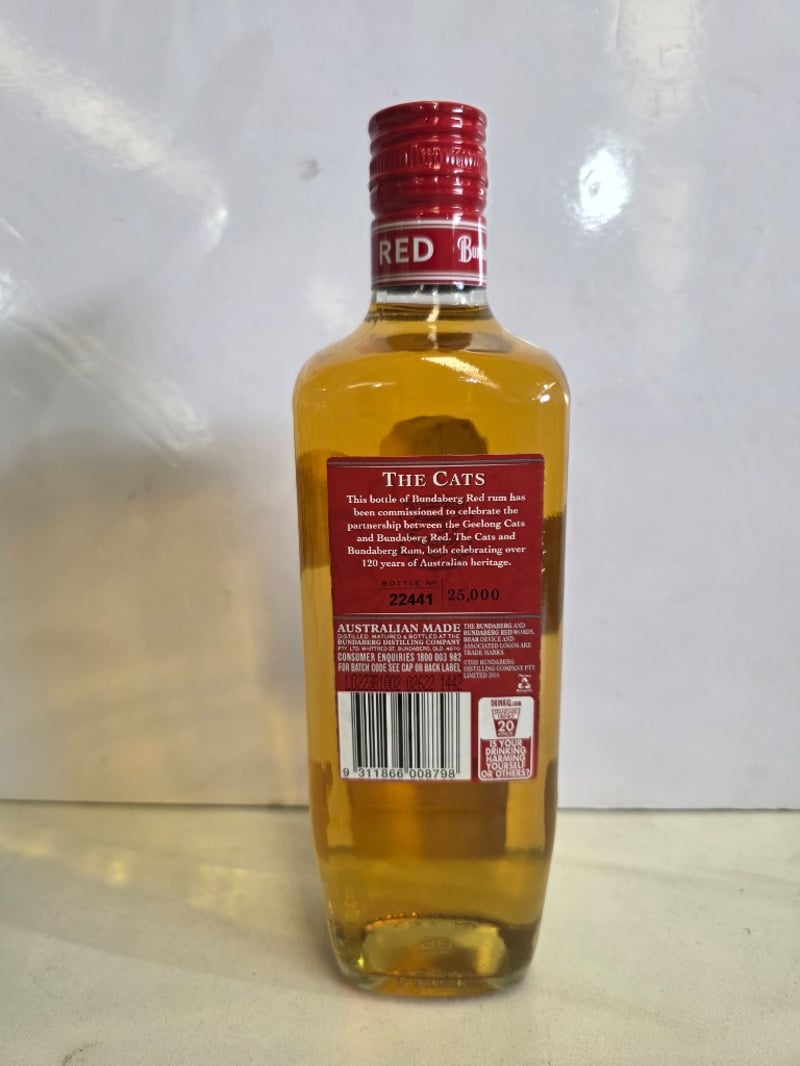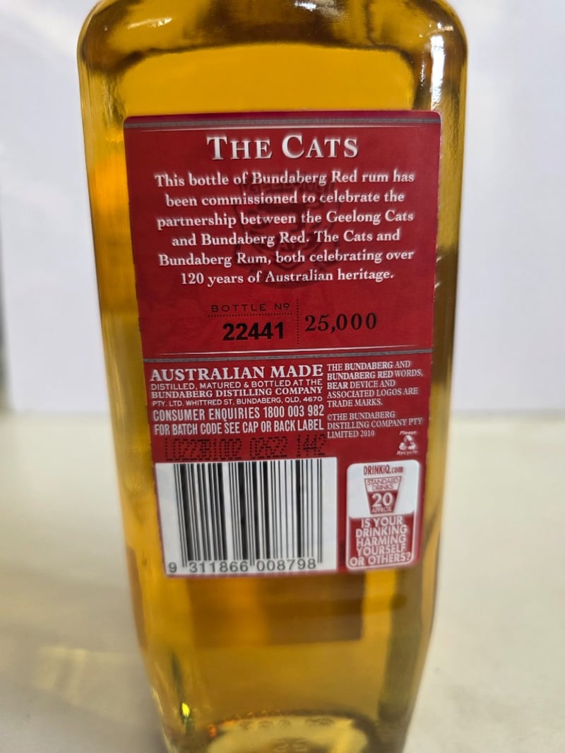 Bundaberg Red Limited Edition "The Cats" Rum - A commemorative 700ml bottle (37% ABV) celebrating the partnership between the Geelong Cats AFL club and Bundaberg Red. This special release bottle is numbered 22441 of 25,000 units, distilled, matured and bottled by Bundaberg Distilling Company in Whittred Street, Bundaberg, Queensland. The bottle features the iconic polar bear logo on tan and cream label with red foil-sealed cap. The reverse label details the heritage collaboration between both brands, celebrating over 120 years of Australian heritage. Condition shows minor sediment and natural aging patina consistent with spirit storage. Australian-made rum in excellent collectible condition.