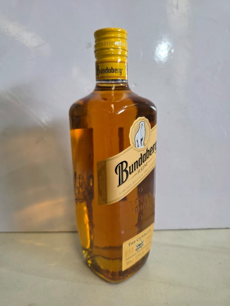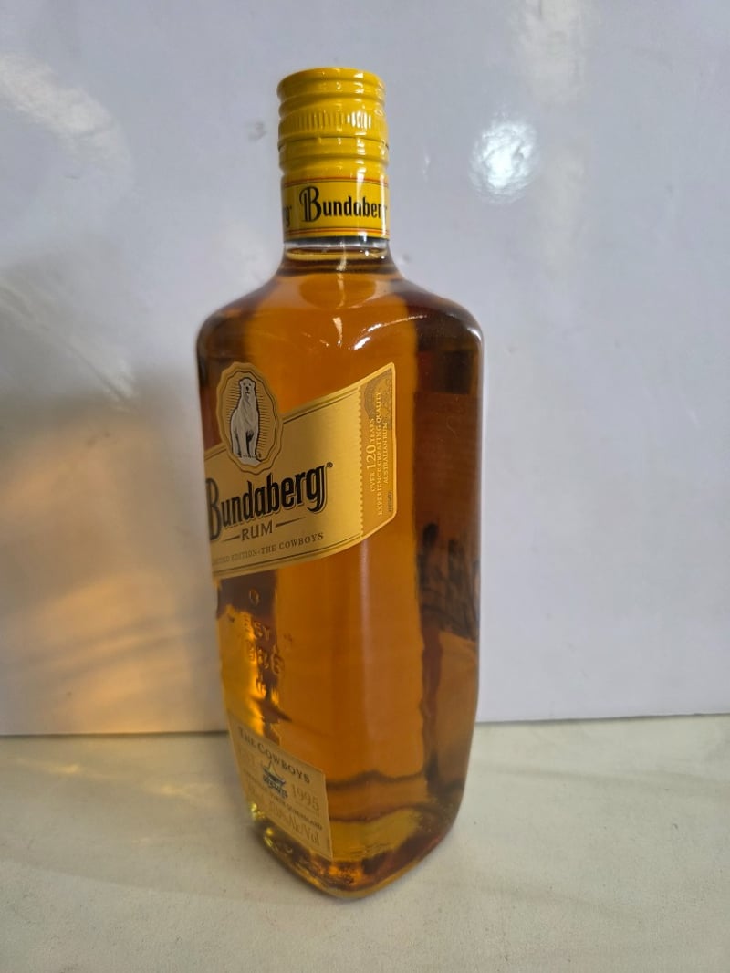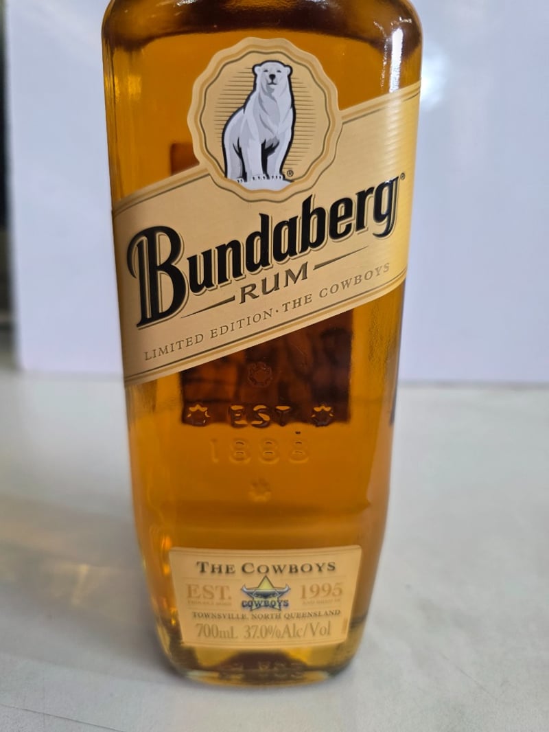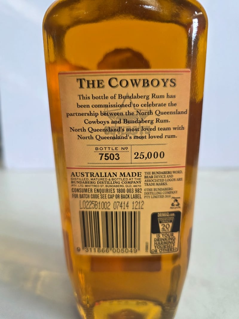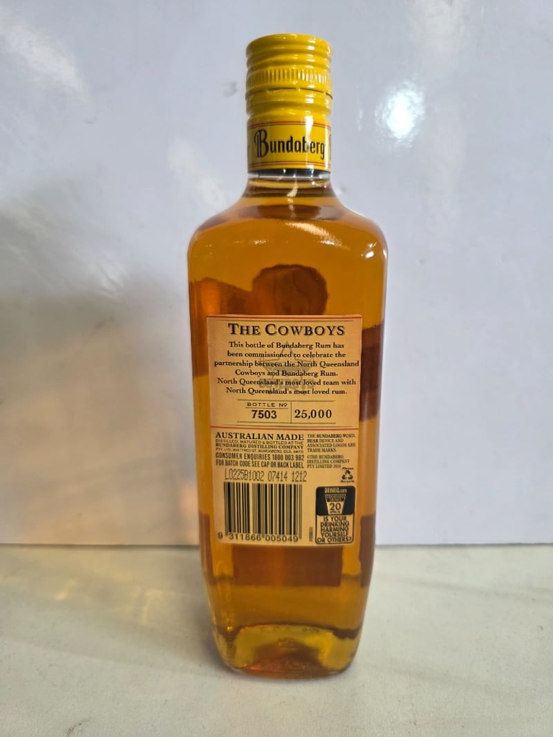 Bundaberg Rum Limited Edition "The Cowboys" Commemorative Bottle. This is a special release rum from the Bundaberg Distilling Company, Whittred Street, Bundaberg, Queensland, commissioned to celebrate the partnership between the North Queensland Cowboys NRL team and Bundaberg Rum. Bottle number 7503 of 25,000 total bottles produced. The rum is Australian-made, distilled, matured and bottled at the Bundaberg Distillery. 700ml bottle containing 37.0% alcohol by volume. Features the iconic Bundaberg polar bear logo and "The Cowboys" branding with establishment date of 1995. Back label includes full production details and responsible drinking messaging. The bottle presents in excellent condition with clear amber liquid visible and intact labelling throughout.
