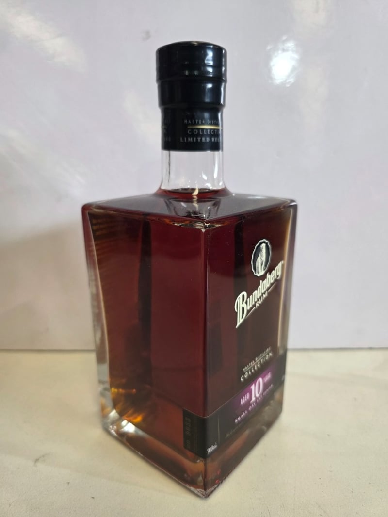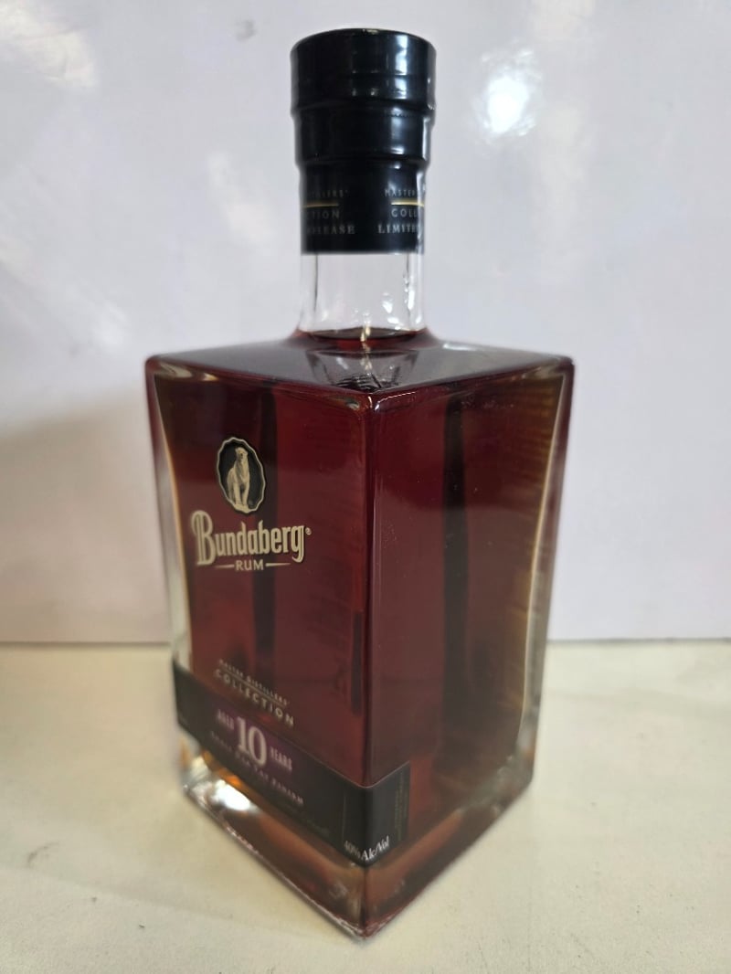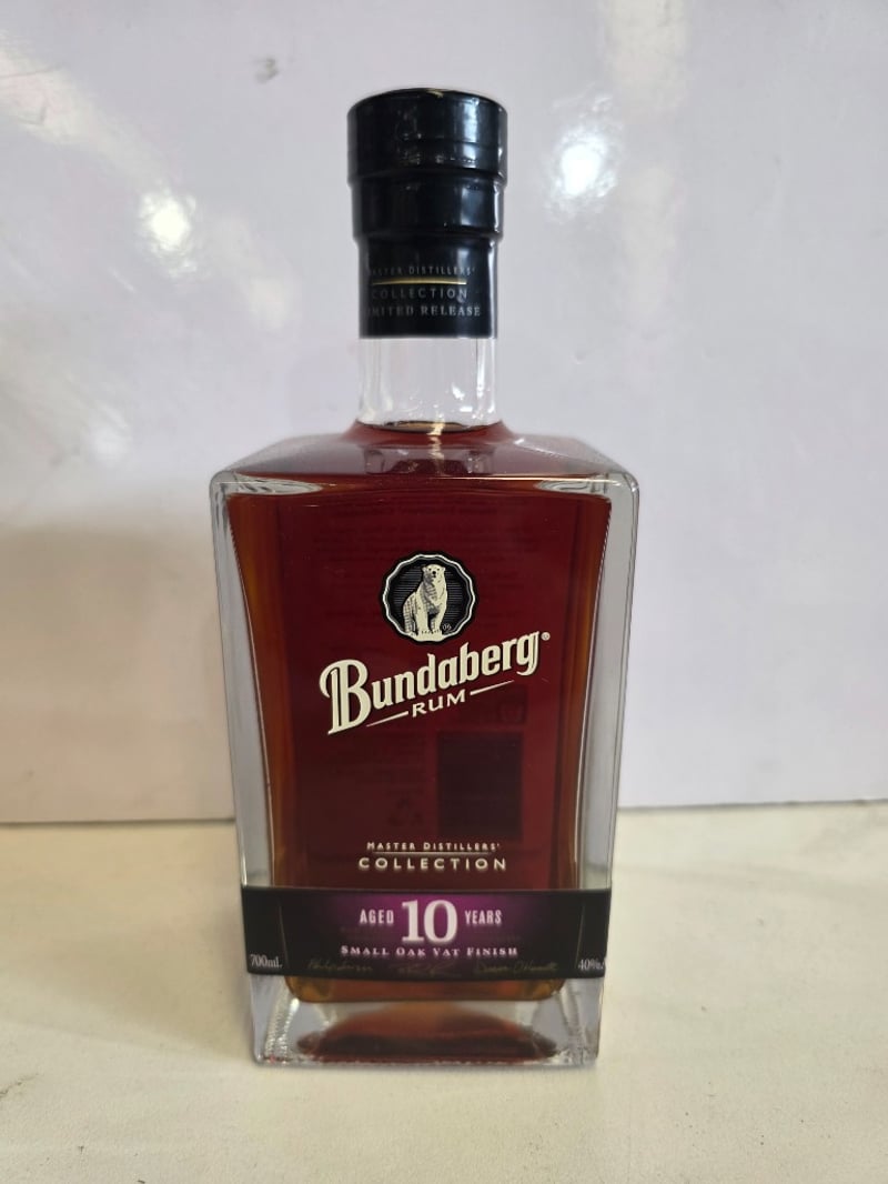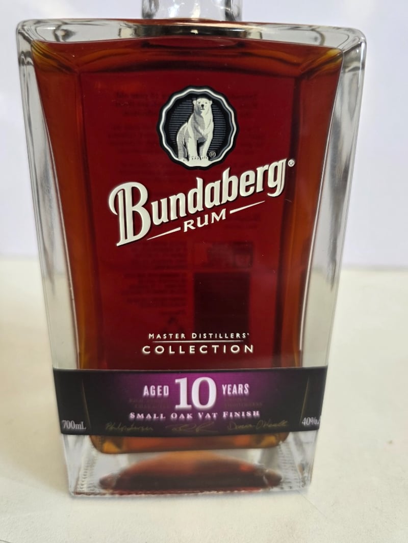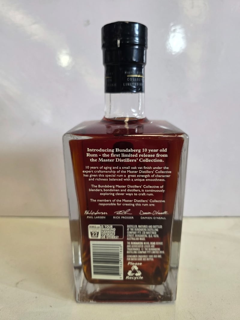 Bundaberg Rum Master Distillers' Collection Aged 10 Years Limited Release. This premium Australian rum represents the first limited edition release from Bundaberg's Master Distillers' Collective. Aged for 10 years with small oak vat finish, this spirit showcases exceptional craftsmanship and complexity. The bottle features the iconic polar bear emblem and displays deep amber-to-burgundy coloration indicative of extended oak maturation. 700mL capacity at 40% ABV. Includes detailed back label describing the Master Distillers' Collective philosophy and production credentials. This is a collectible expression from Australia's renowned Bundaberg Distillery, combining traditional distillation methods with contemporary blending expertise. The limited release designation and master distillers' signatures enhance its desirability for rum enthusiasts and collectors.