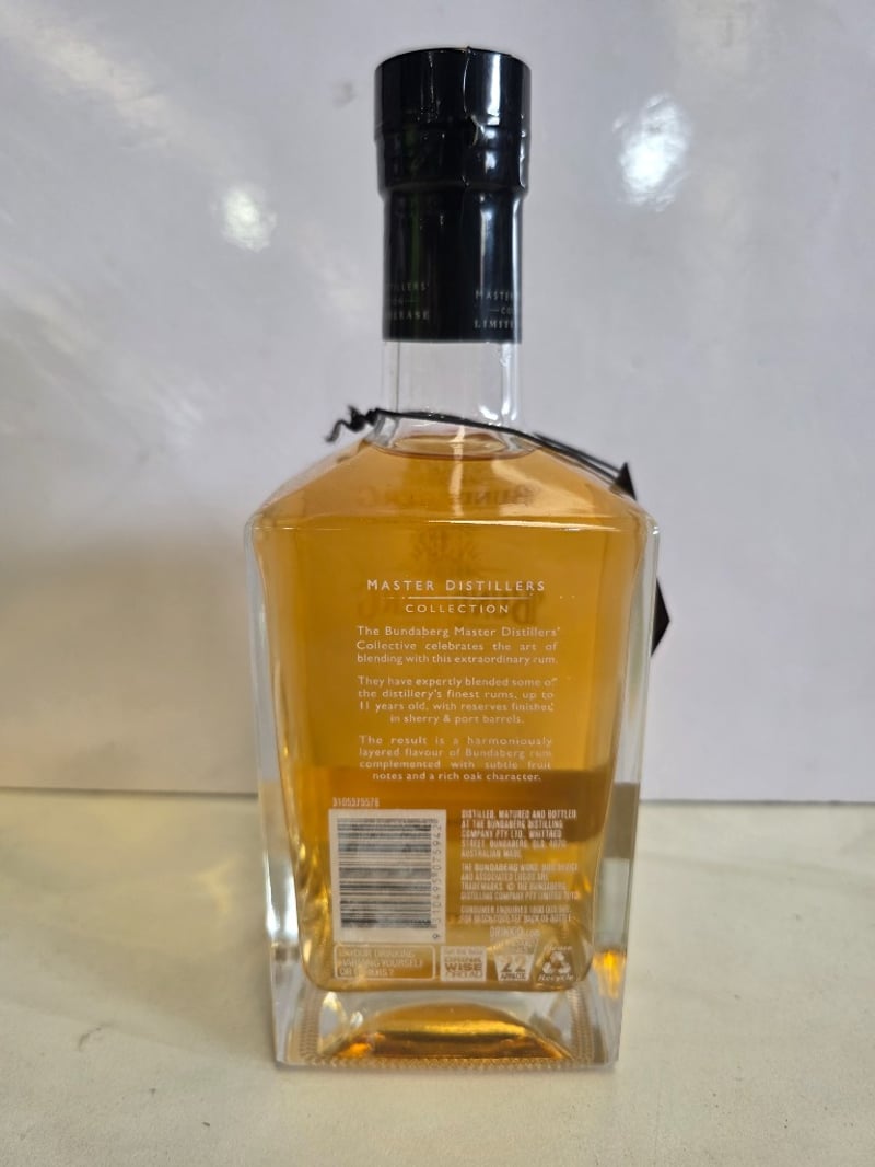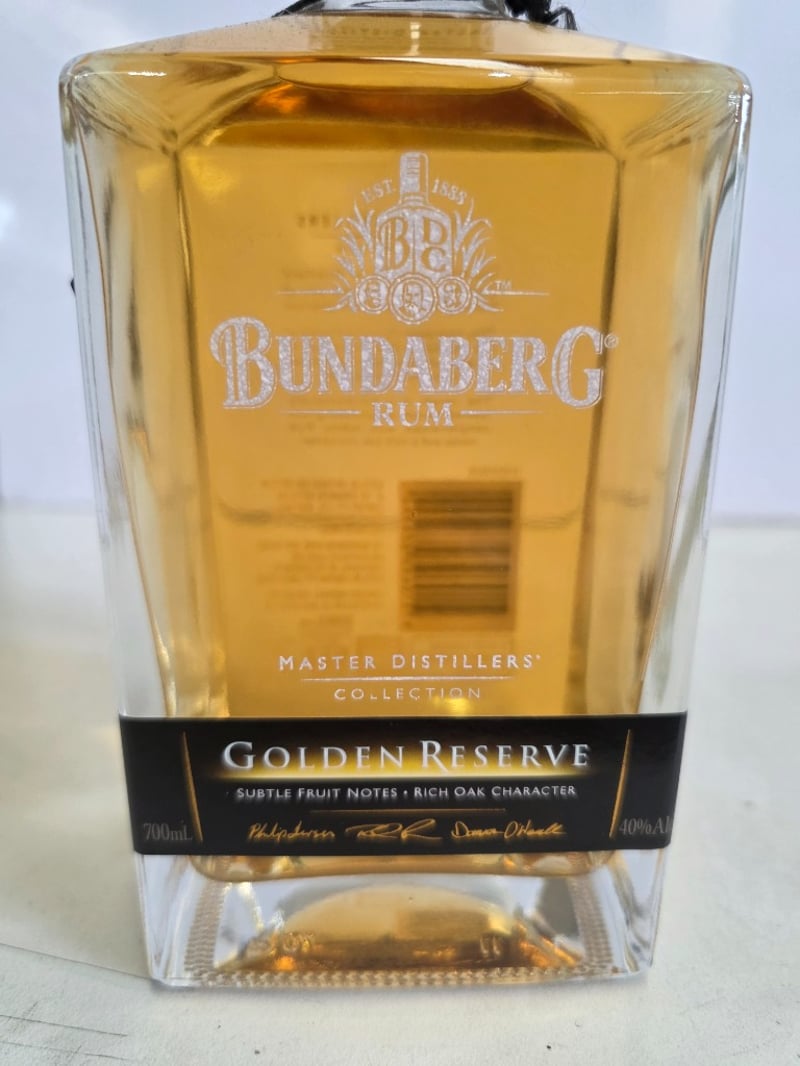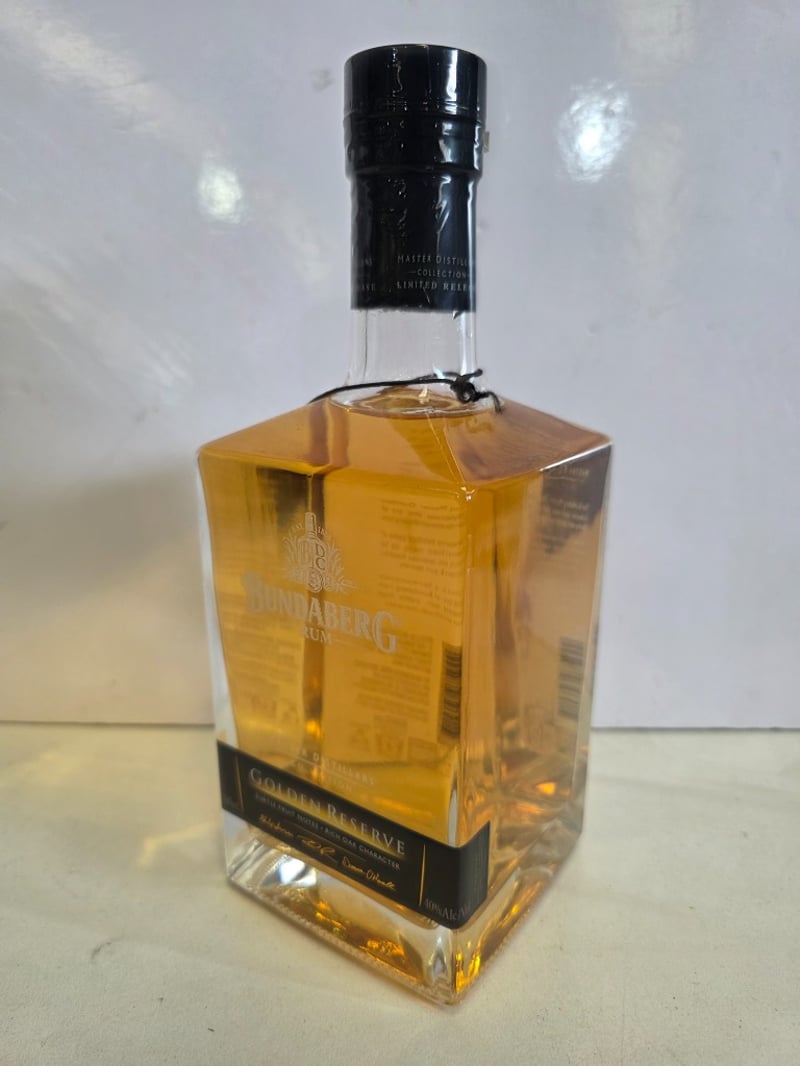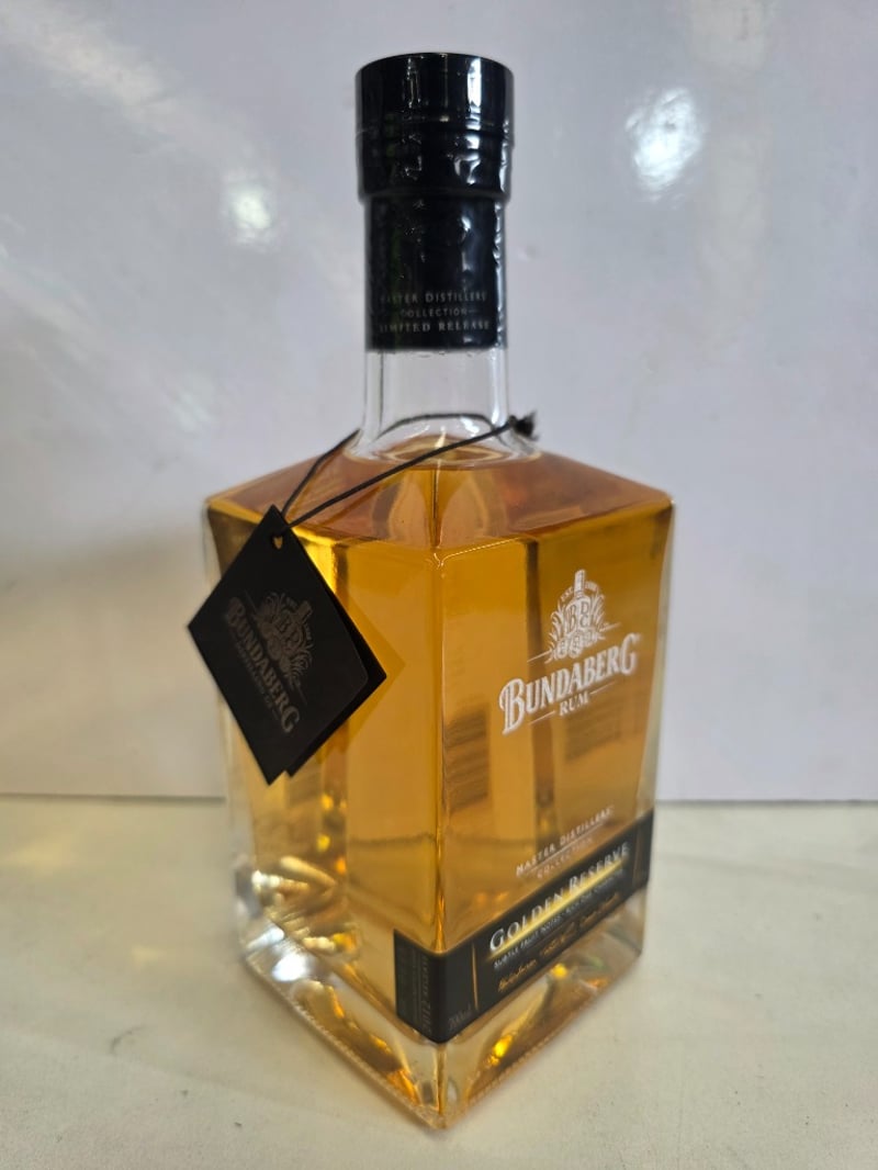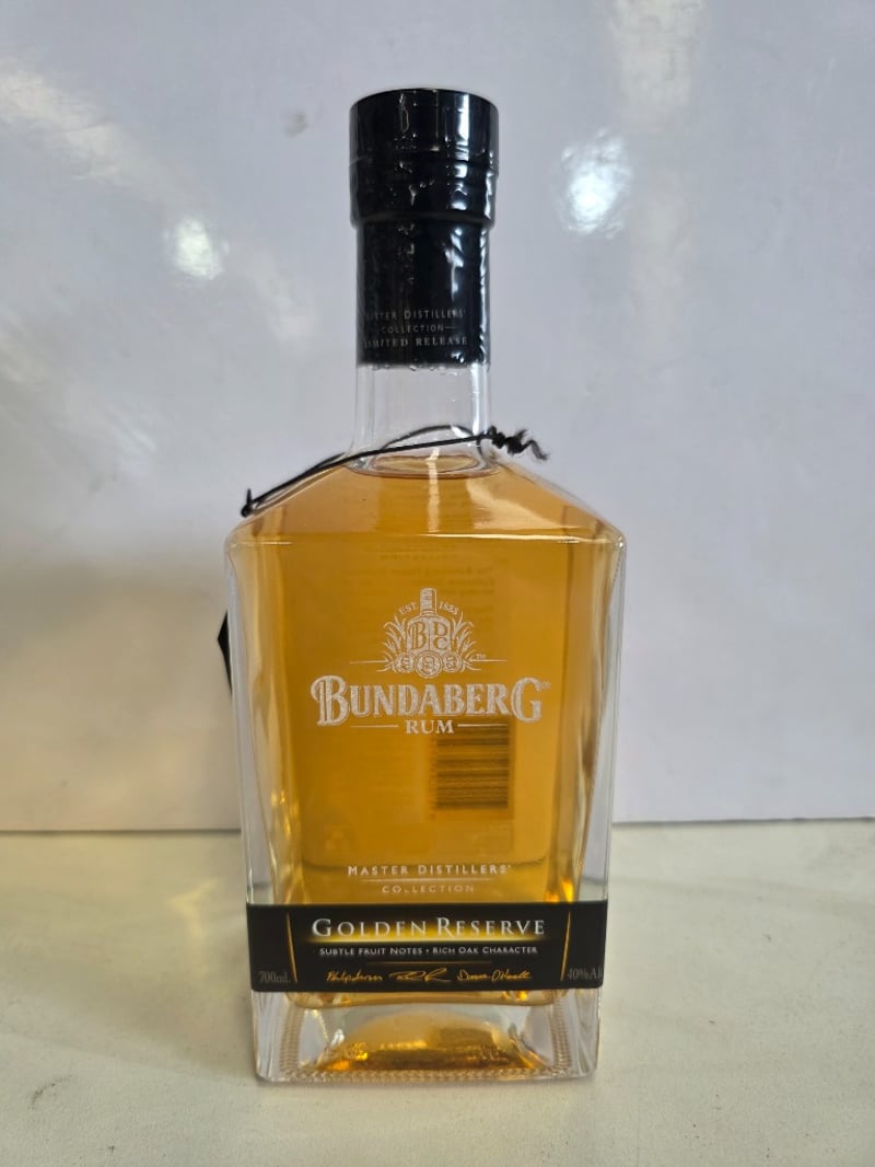 Bundaberg Rum Master Distillers' Collection Golden Reserve, 700ml bottle at 40% ABV. This premium Australian rum features subtle fruit notes and rich oak character, expertly blended from the distillery's finest rums aged up to 11 years old with reserves finished in sherry and port barrels. The bottle presents in excellent condition with original black capsule seal, black label band, and attached authentication tag marked "0648" with bottling date 29/12/2018. The liquid level appears full, and the presentation reflects the Master Distillers' Collection's premium positioning within Bundaberg's range.