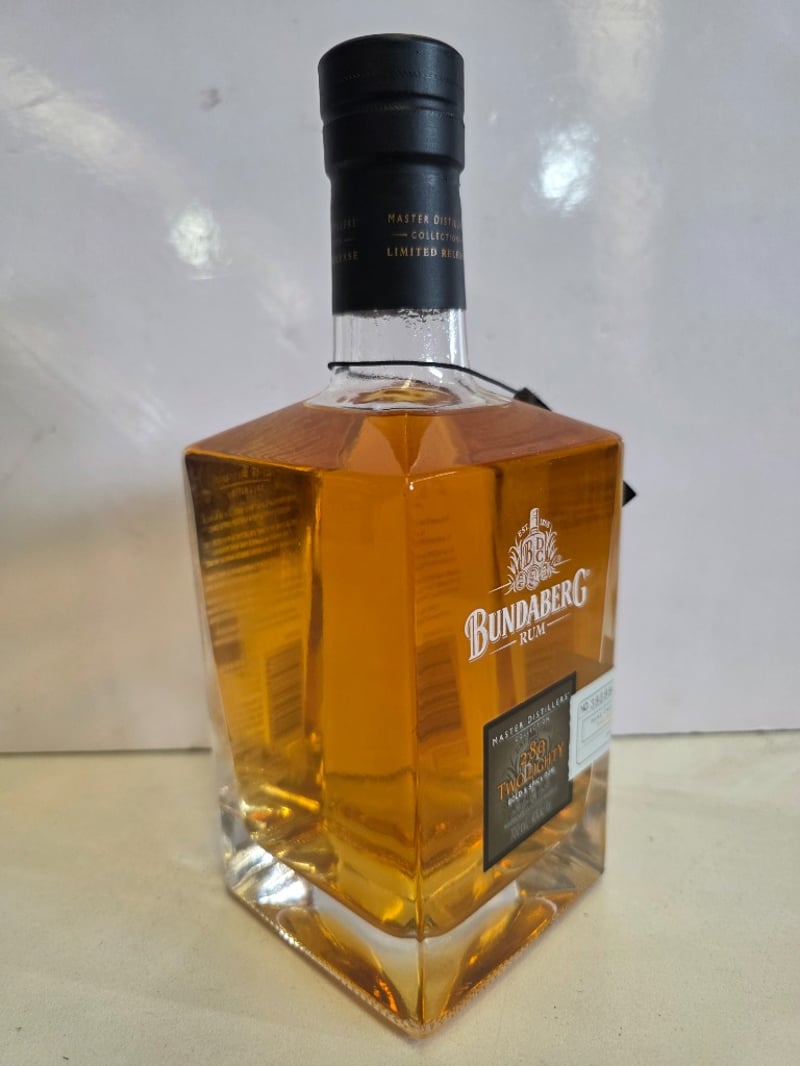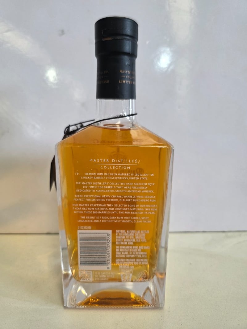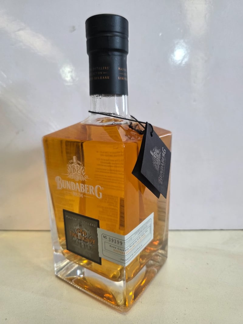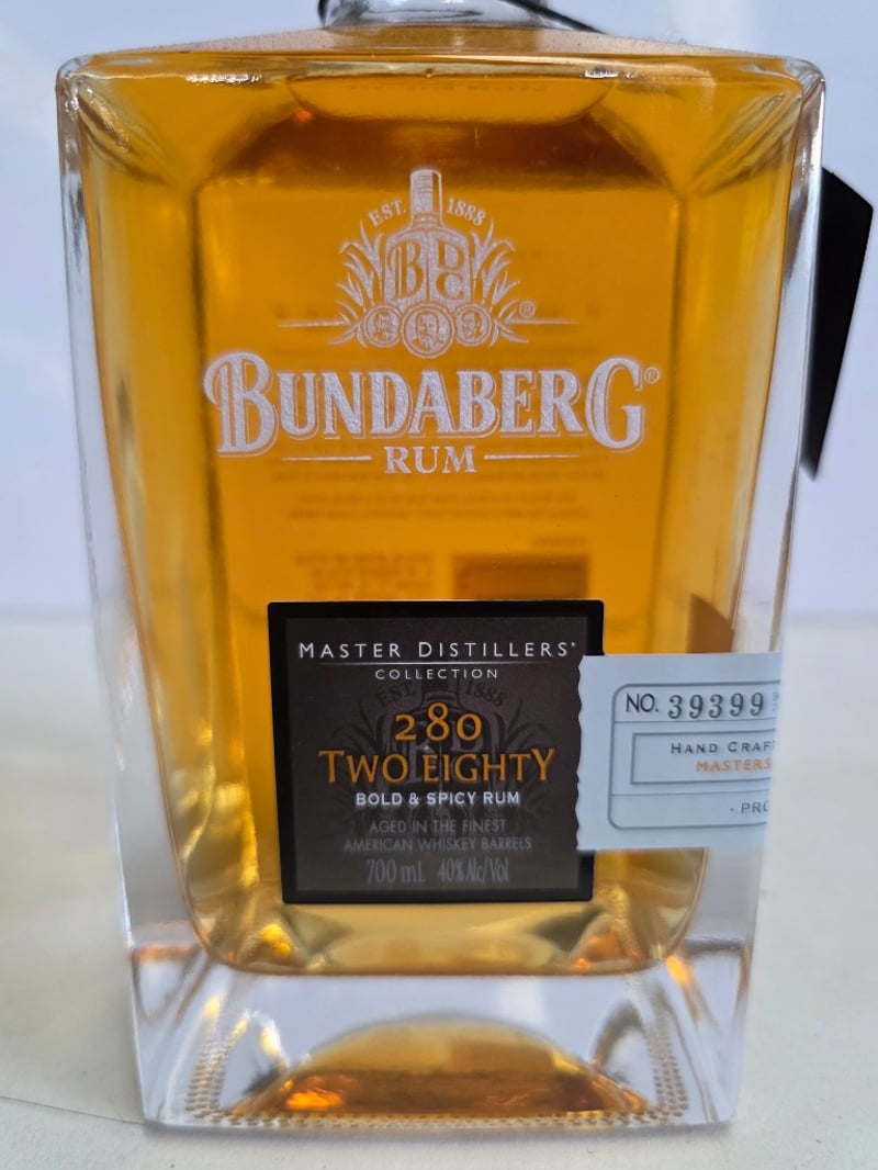 Bundaberg Rum Master Distillers' Collection 2/80 Two Eighty Bold & Spicy Rum, 700ml bottle at 40% ABV. This is a premium limited release rum aged in finest American whiskey barrels. The bottle features the iconic Bundaberg branding with distinctive square-shaped clear glass decanter. Includes hand-crafted master series label and numbered bottle tag (No. 39399). The rum exhibits a rich, dark golden amber colour indicative of extended barrel maturation. This exceptional spirit represents the Master Distillers' collective selection of premium, heavily charred bourbon barrels previously dedicated to aging extra-smooth American whiskey. The result is a bold, spicy rum with distinctive smooth, clean finish. Sealed with black capsule closure and black ribbon bow tie. Excellent presentation condition with minimal wear.