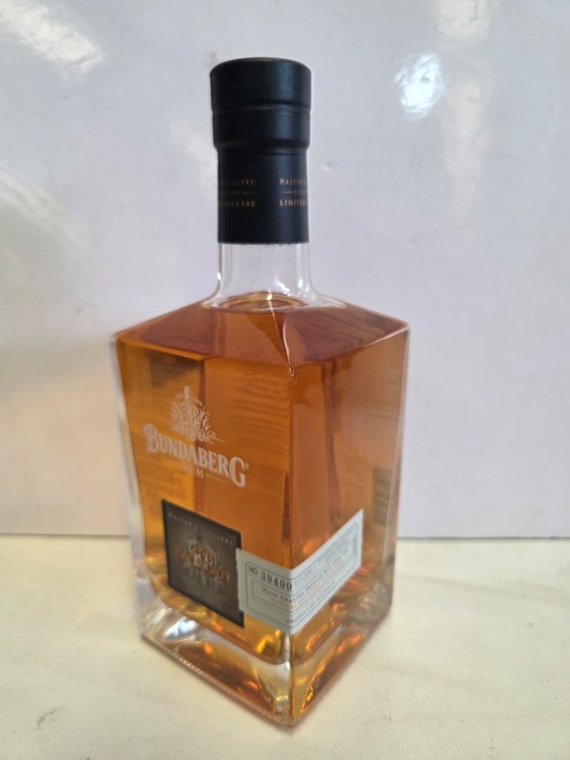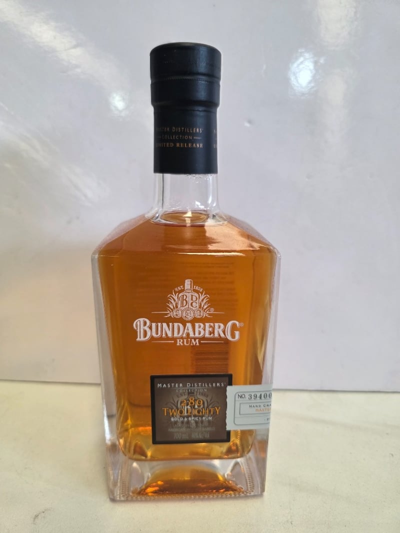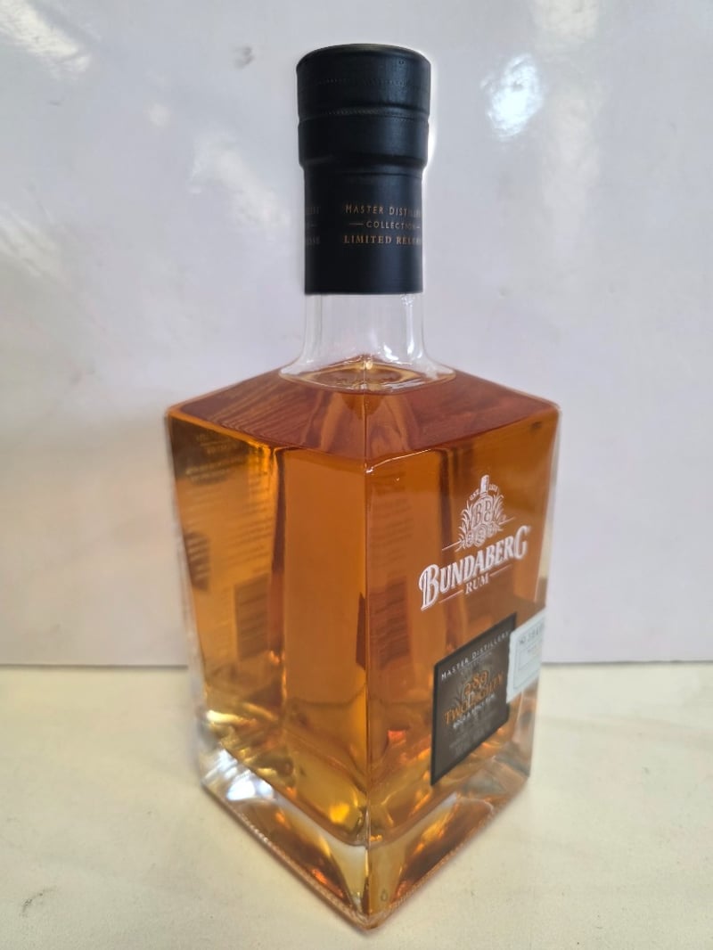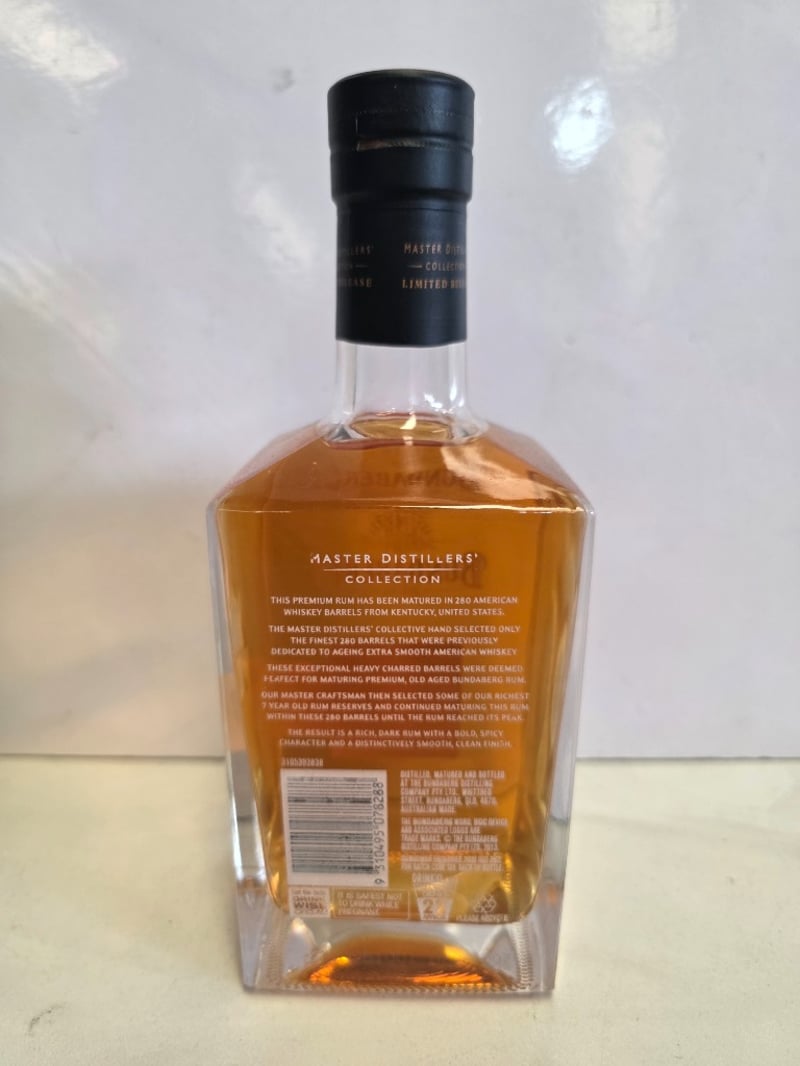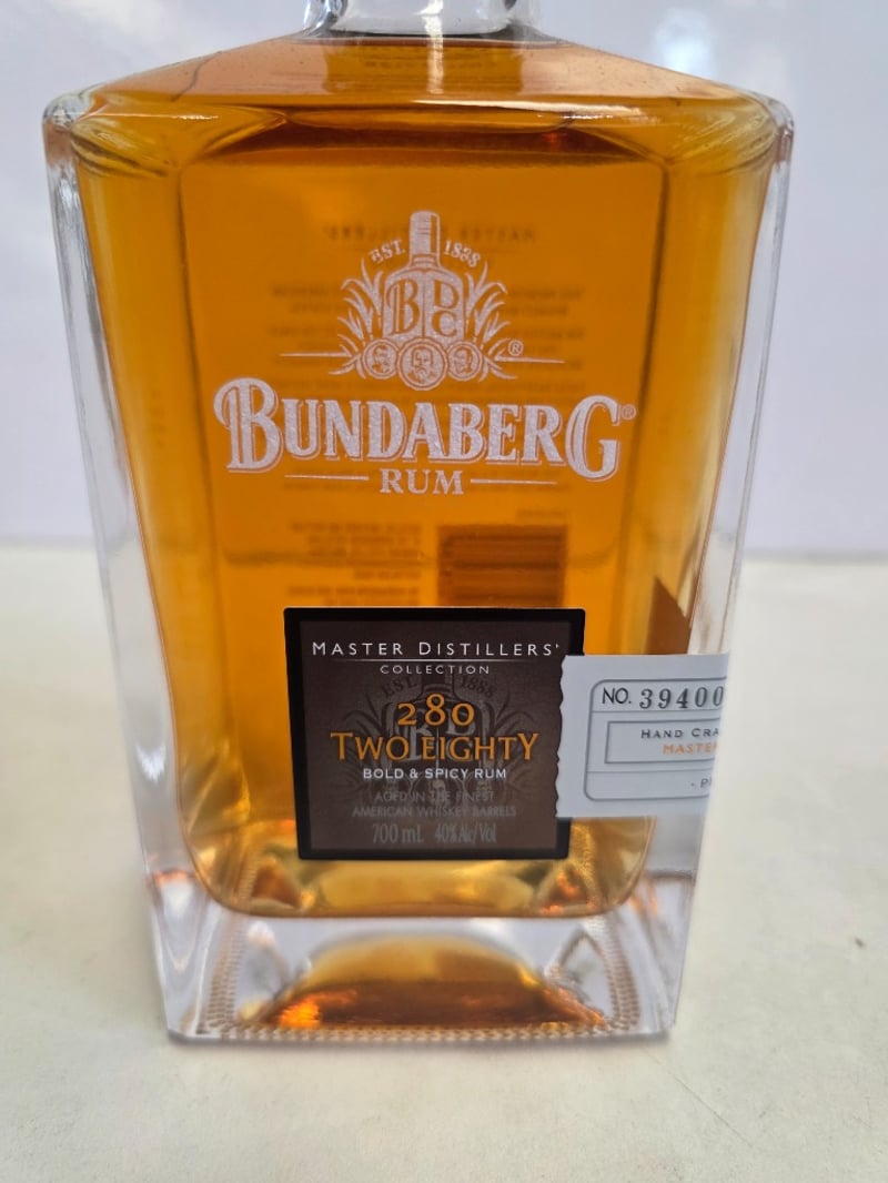 Bundaberg Rum Master Distillers' Collection 2801 TwoEighty Bold & Spicy Rum, Limited Release. Premium rum matured in zed American whiskey barrels from Kentucky, United States. This hand-crafted spirit represents the pinnacle of Bundaberg's distilling expertise, with select 3-year-old reserves continued maturation within zed barrels to achieve peak complexity. The result is a rich, dark rum with bold spicy character and distinctly smooth, clean finish. Master crafted and bottled at 40% ABV. 700ml bottle with black capsule closure and numbered batch label (No. 39400). Presented in original square glass bottle with embossed branding.