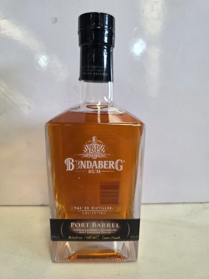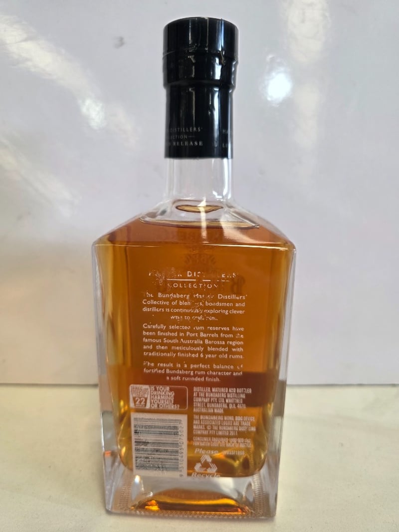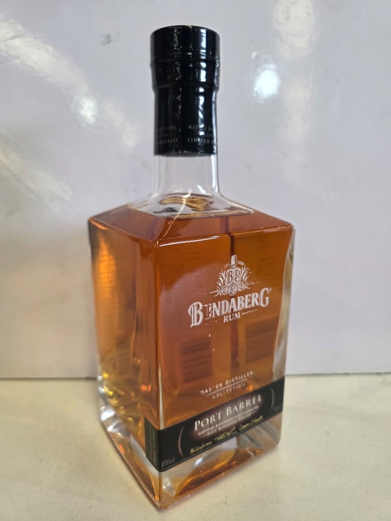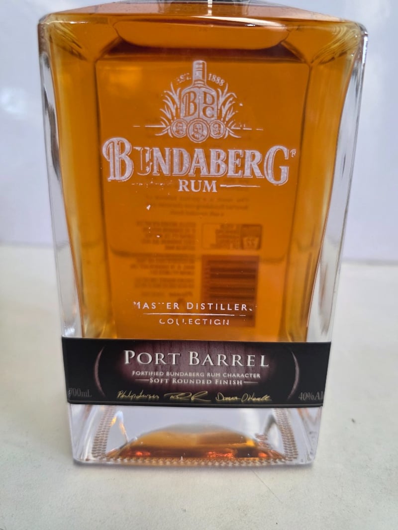 Bundaberg Rum Port Barrel Master Distiller's Collection. Premium Australian rum from the renowned Bundaberg Distillery, featuring rum reserves finished in Port Barrels from the South Australia Barossa region. This expression showcases a soft rounded finish with fortified Bundaberg rum character. The bottle displays the distinctive Master Distiller's Collection branding with Port Barrel designation. 700ml bottle at 40% ABV. Presented in original packaging with black capsule and label detailing the distillery's continuous exploration of clever rum crafting techniques. The liquid exhibits a rich amber to golden-brown hue, characteristic of Port Barrel maturation. A collectible release from Australia's most awarded rum distillery, established 1888.