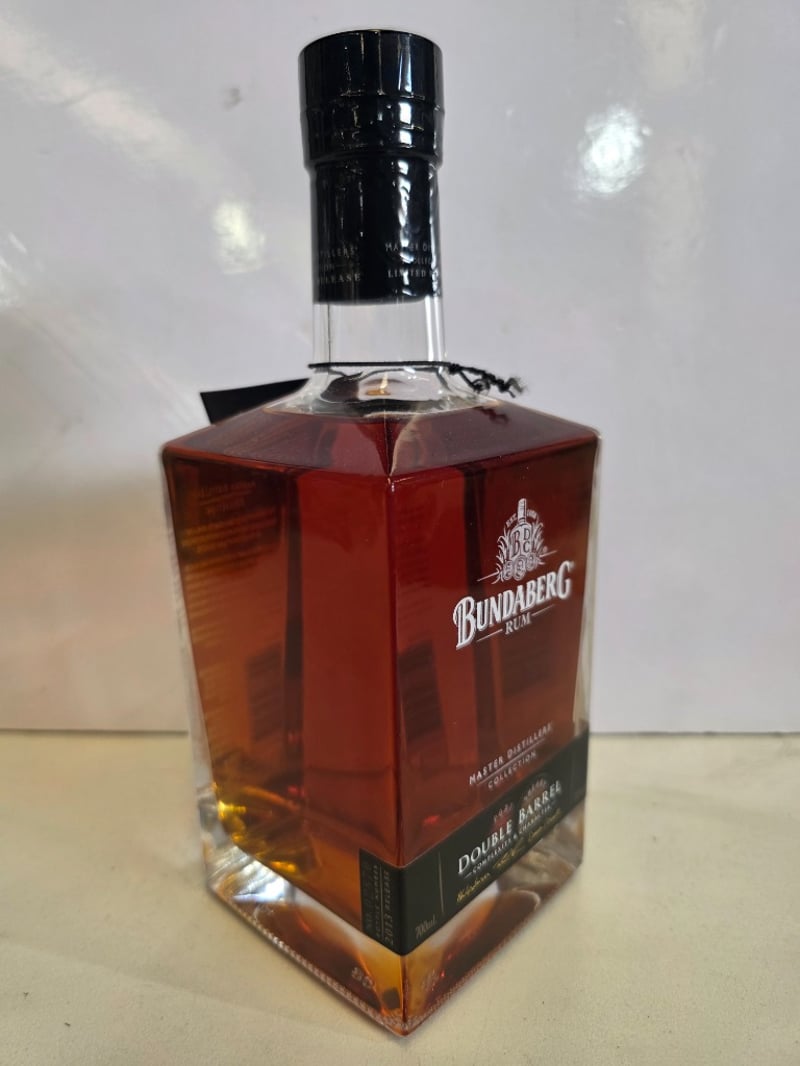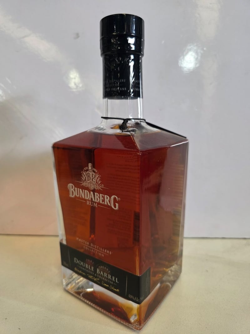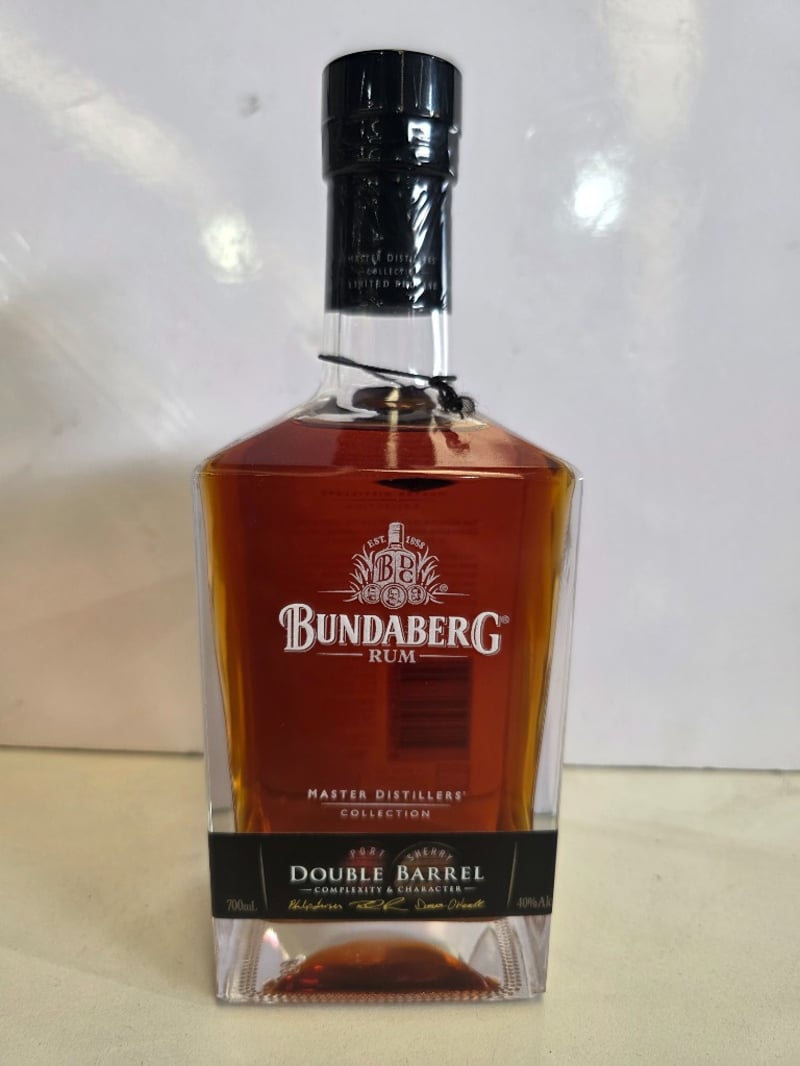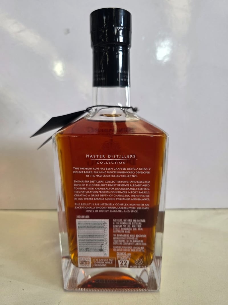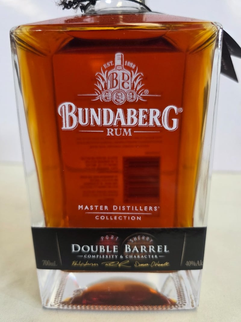 Bundaberg Rum Master Distillers' Collection Double Barrel 700ml bottle, 40% ABV. This premium rum features a sophisticated double barrel finishing process combining Port and Sherry cask maturation. The Master Distillers' Collective hand-selected reserves aged to perfection, creating an intensely complex spirit with exceptional smoothness. Tasting notes reveal delicate hints of honey, caramel, and spice. Bottled at the Bundaberg Distillery, Australia. Batch number 028870, 2013 release. Presented in distinctive square glass decanter with embossed branding, black foil capsule, and original packaging intact. The liquid displays rich amber-to-mahogany coloration characteristic of dual-cask maturation.