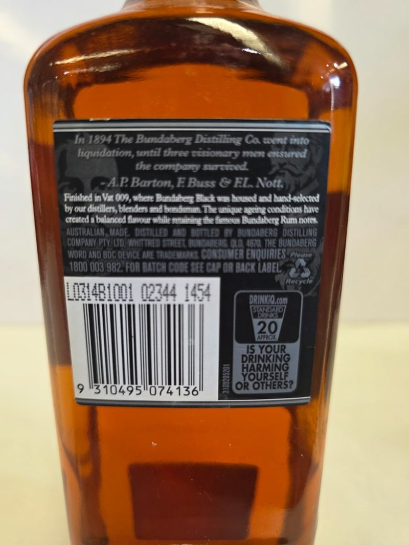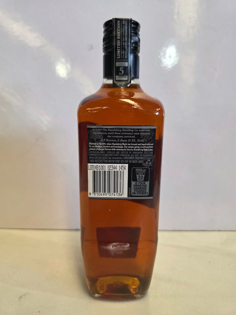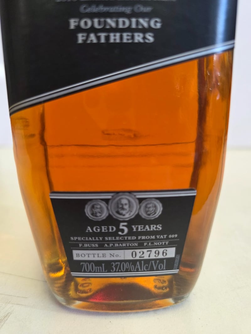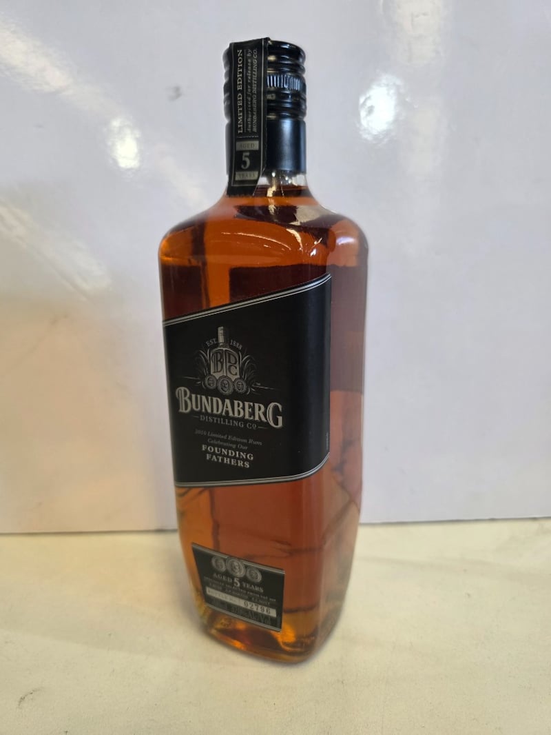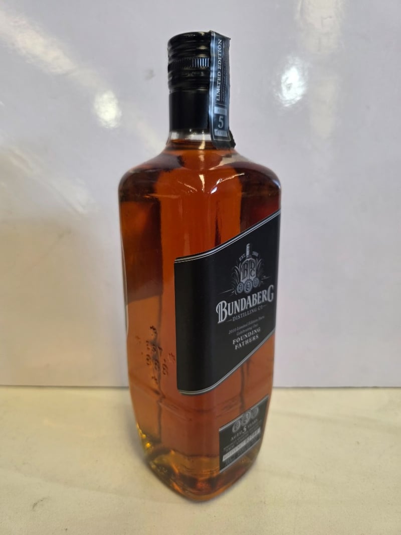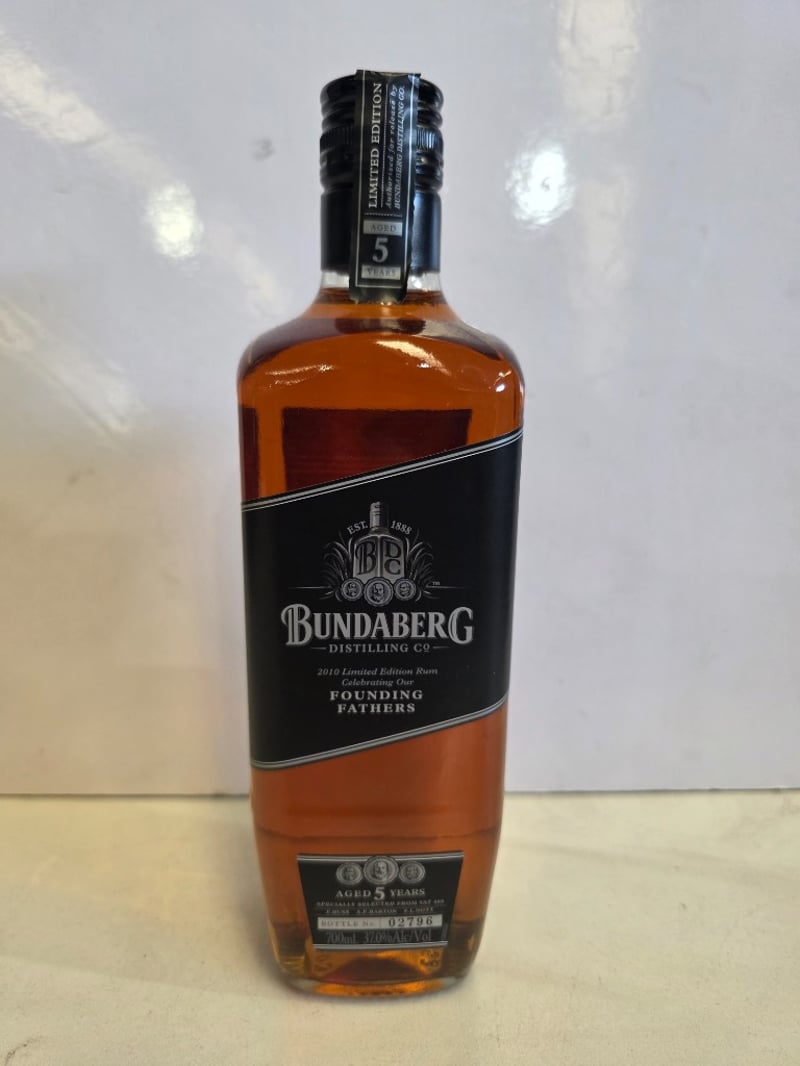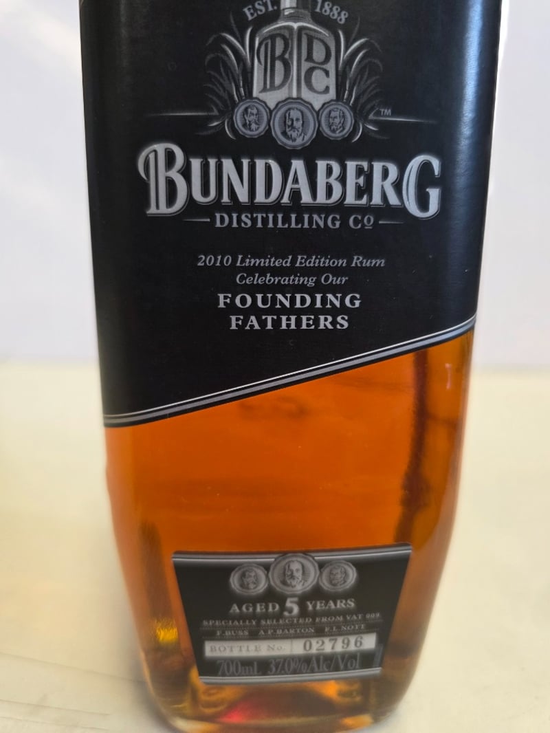 Bundaberg Distilling Co. 2010 Limited Edition Rum "Founding Fathers" - Aged 5 Years. This is a specially selected rum finished in Vat 009, where Bundaberg Black was housed and hand-selected by distillers, blenders and businessmen. The unique ageing conditions have created a balanced flavour with complex notes. Bottle number 02796 of a limited release. 700ml at 37.0% alcohol by volume. Australian-made and distilled by Bundaberg Distilling Company Pty. Ltd., Whittred Street, Bundaberg, QLD 4670. Commemorative release celebrating the founding