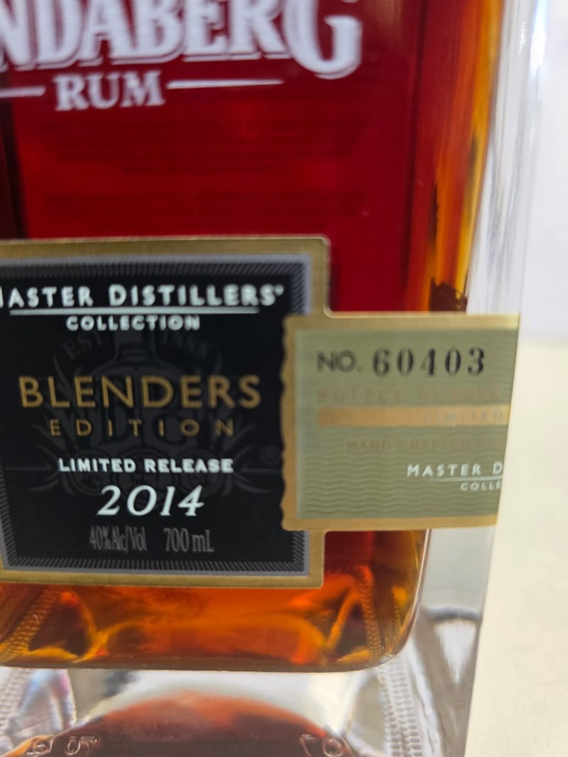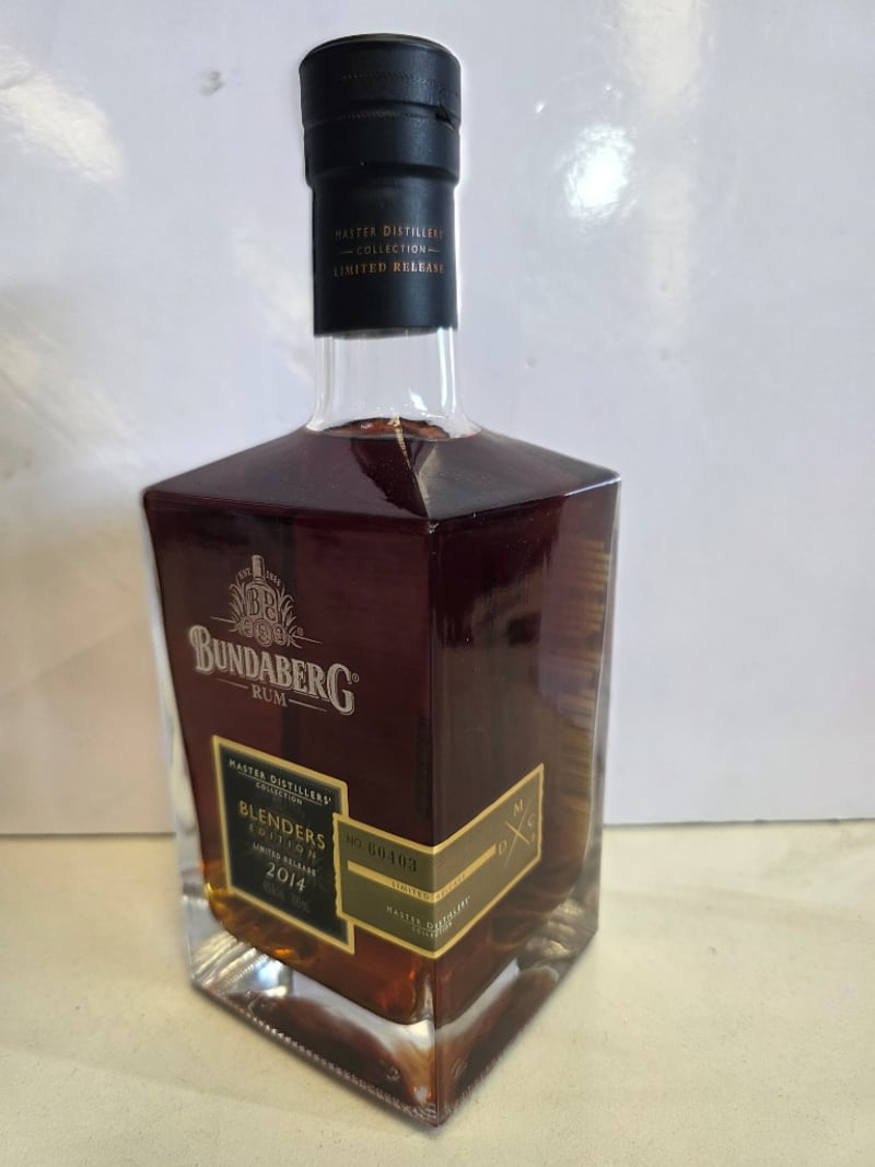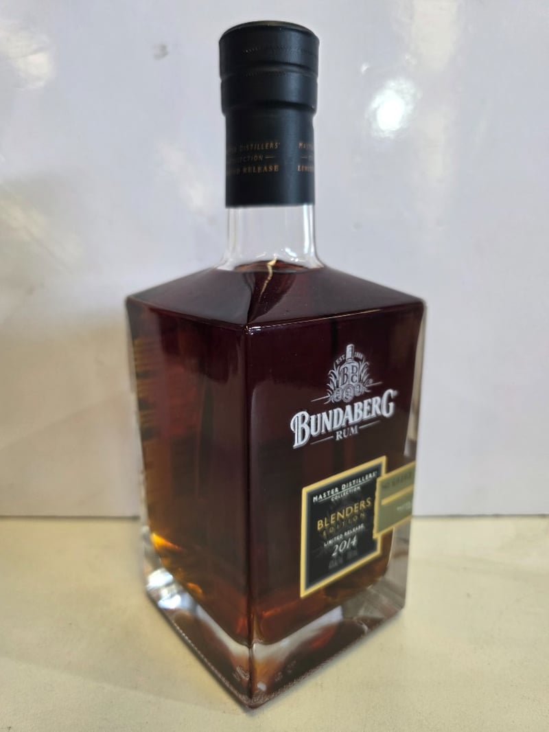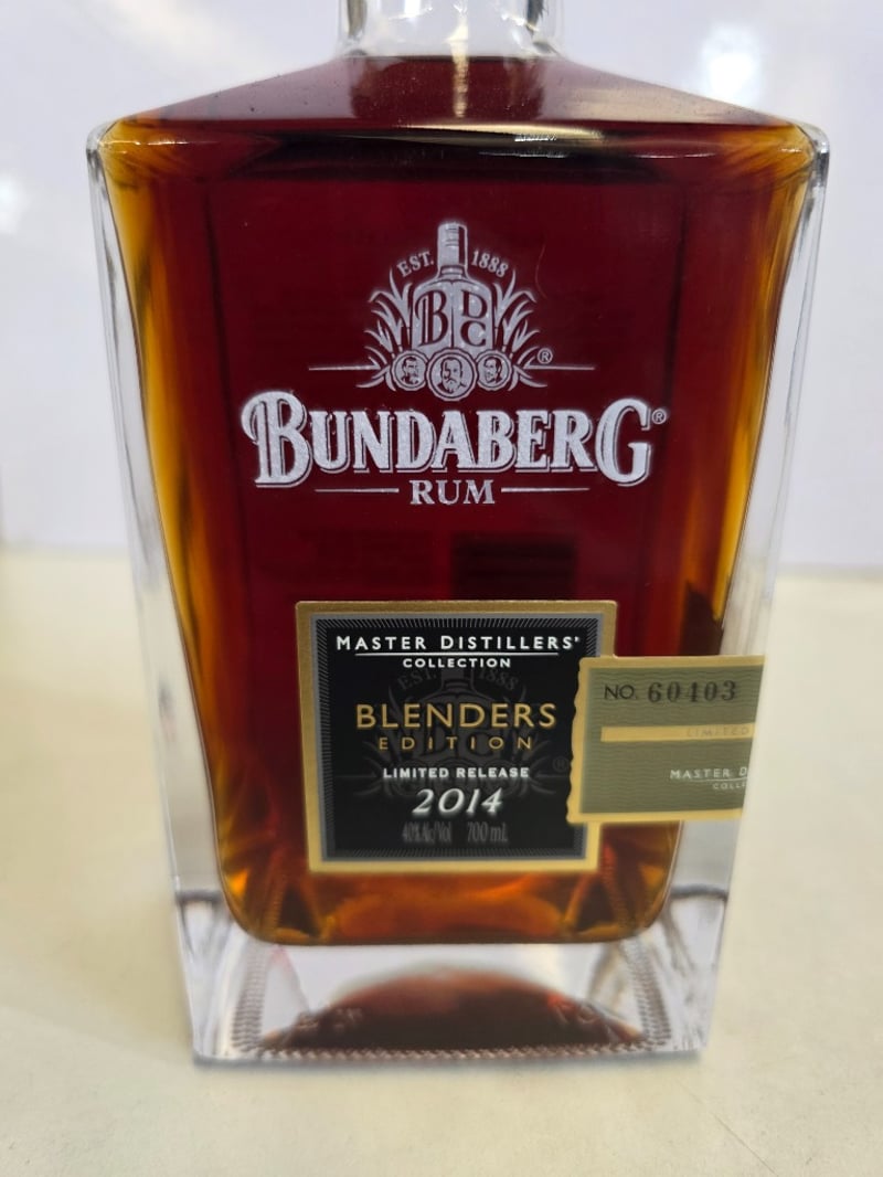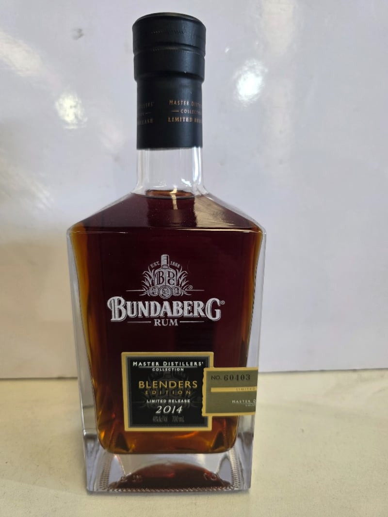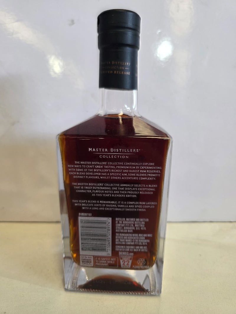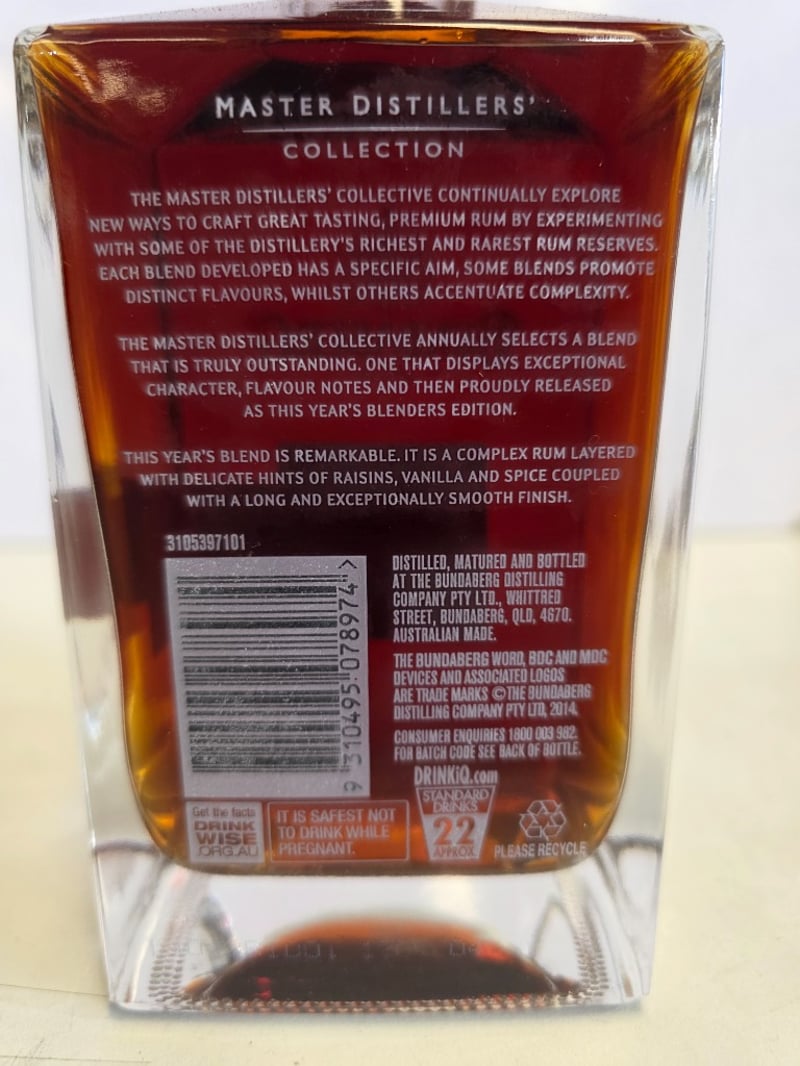 Bundaberg Rum Master Distillers' Collection Blenders Edition 2014, Limited Release No. 60103. A complex premium rum layered with delicate hints of raisins, vanilla and spice, coupled with a long and exceptionally smooth finish. 700mL bottle at 40% ABV. Distilled, matured and bottled at the Bundaberg Distilling Company Pty Ltd, Whittred Street, Bundaberg, QLD 4670. Australian made. This year's blend represents an outstanding selection from the Master Distillers' Collective, displaying exceptional character and flavour notes. The bottle features a black capsule seal and gold-trimmed label with sequential numbering.