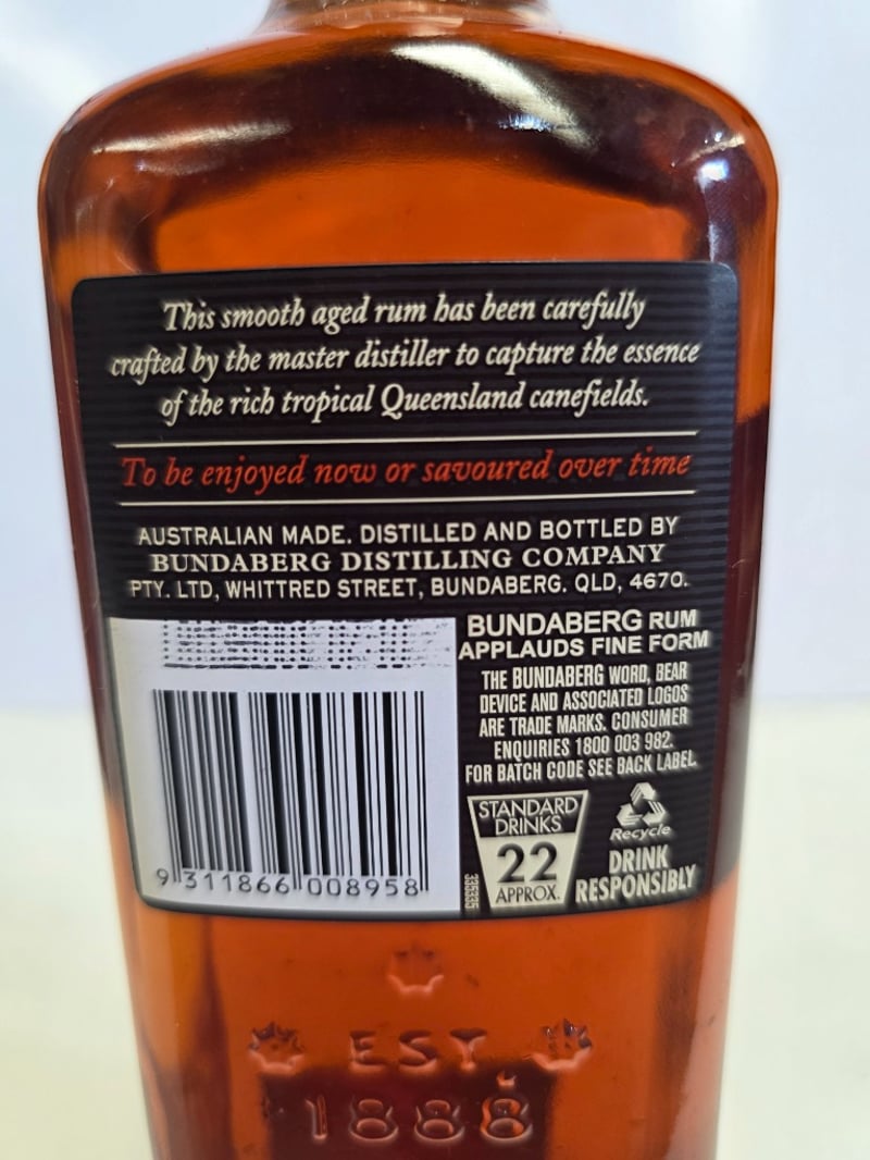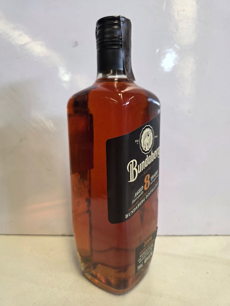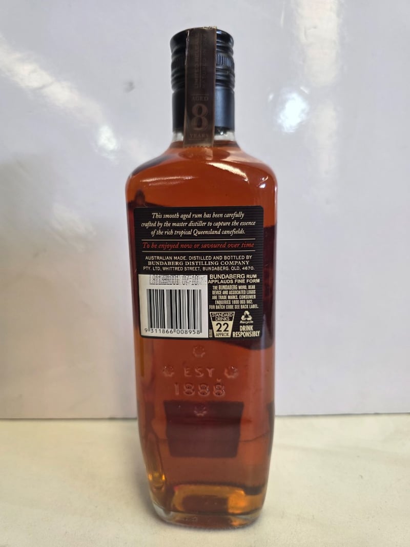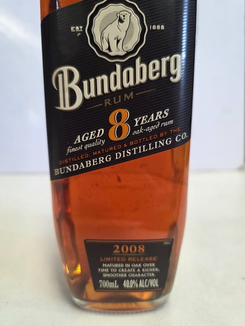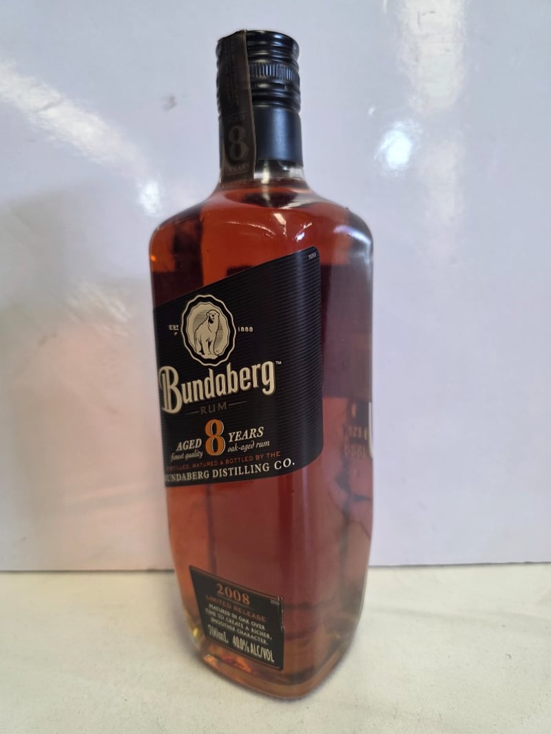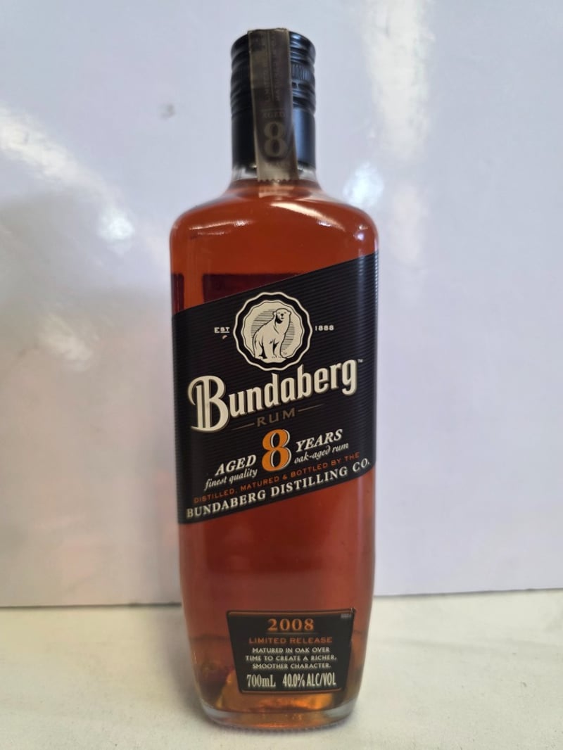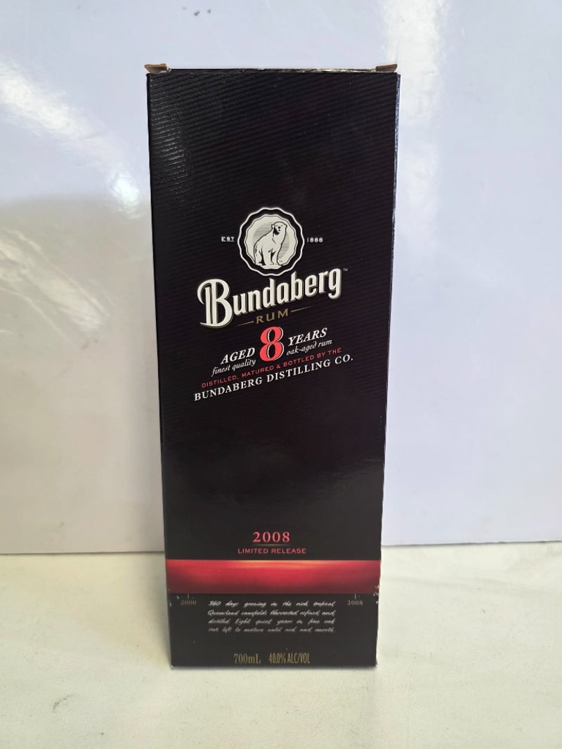 Bundaberg Rum Aged 8 Years, 2008 Limited Release. Australian-made spirit distilled and bottled by Bundaberg Distilling Company, Whittred Street, Bundaberg, Queensland. This premium oak-aged rum captures the essence of rich tropical Queensland canefields. 700ml bottle at 40% alcohol by volume. The 2008 vintage represents a limited release expression, matured in oak to develop a richer, smoother character. Presented in original black presentation box with gold embossed branding featuring the iconic polar bear logo (established 1888). Label indicates "To be enjoyed now or savoured over time." Includes detailed back label with production information and batch coding. Approximately 22 standard drinks per bottle.