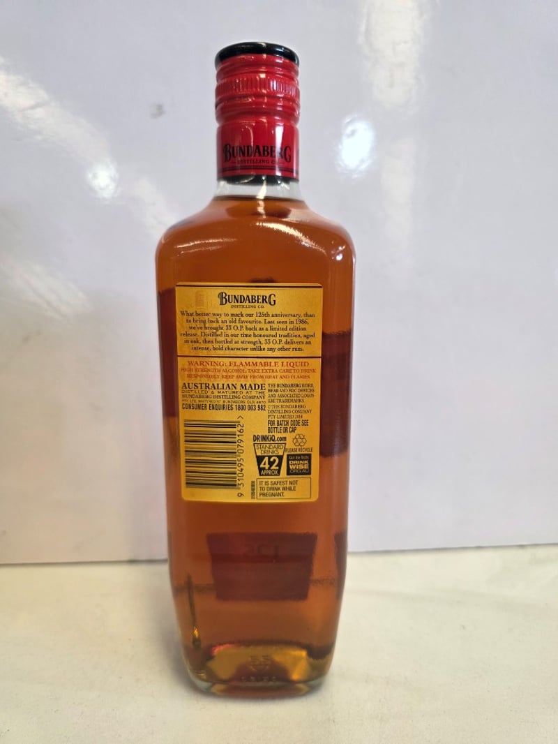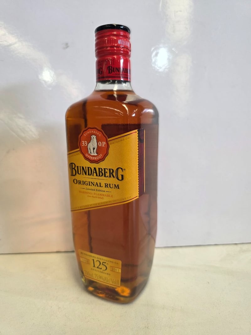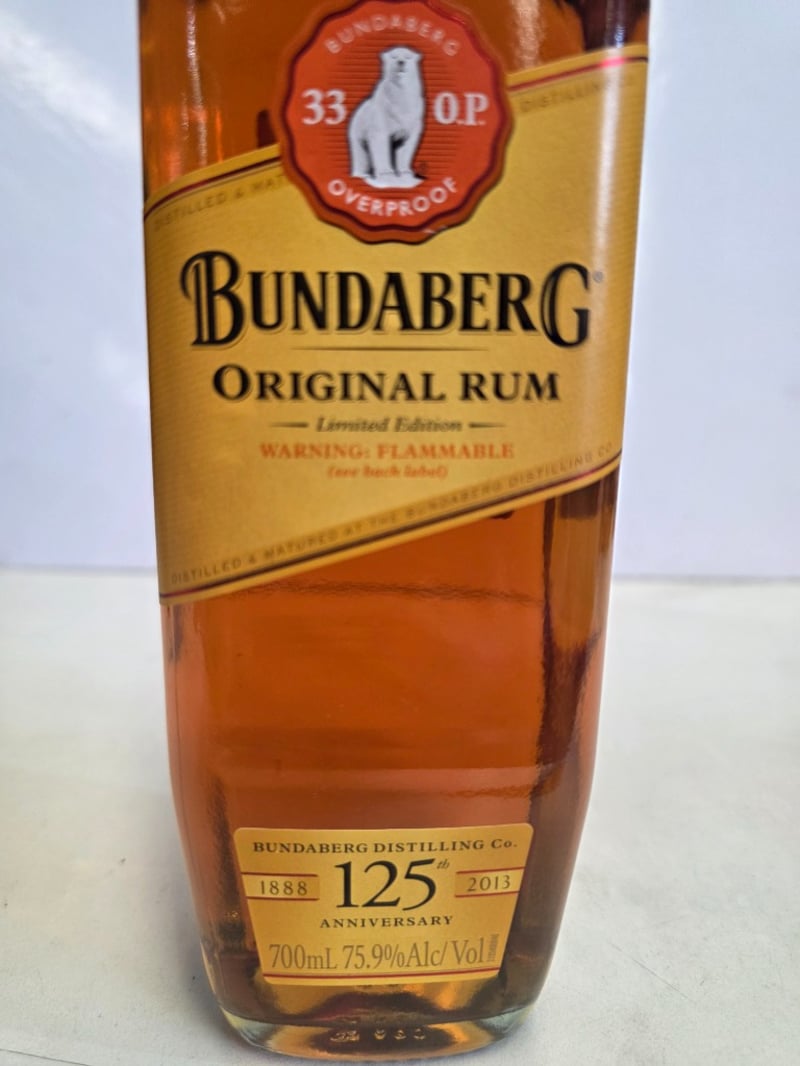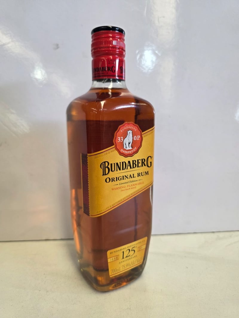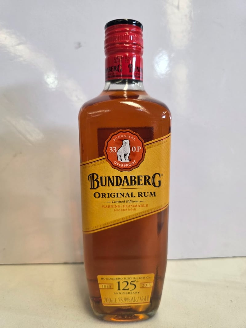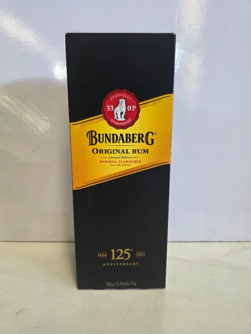 Bundaberg Original Rum Limited Edition 125th Anniversary (1888-2013). 700ml bottle at 75.9% alcohol by volume. Australian-made rum from Bundaberg Distilling Company featuring the iconic polar bear logo and "33 O.P. Overproof" designation. This commemorative release celebrates 125 years of rum production. The bottle presents in excellent condition with intact original packaging (black and gold box visible in first image). Label features gold foil detailing with red wax seal cap. Includes original cardboard presentation box. A collectible spirit bottling from a historic Australian distillery, suitable for collectors of premium rum or Australian spirits memorabilia.