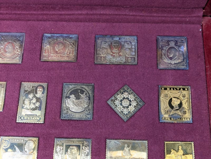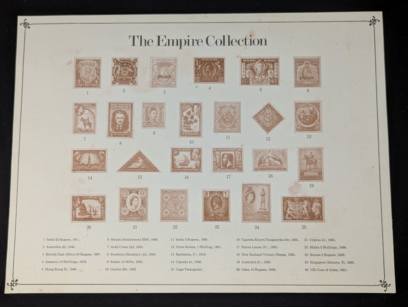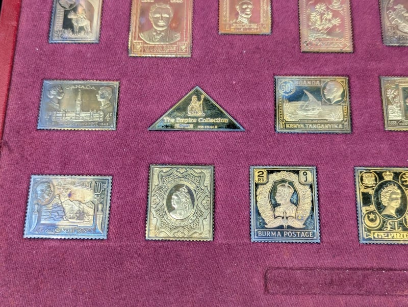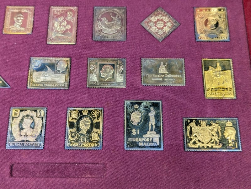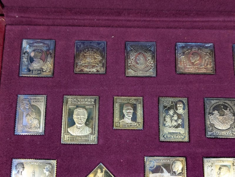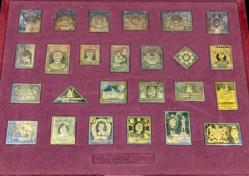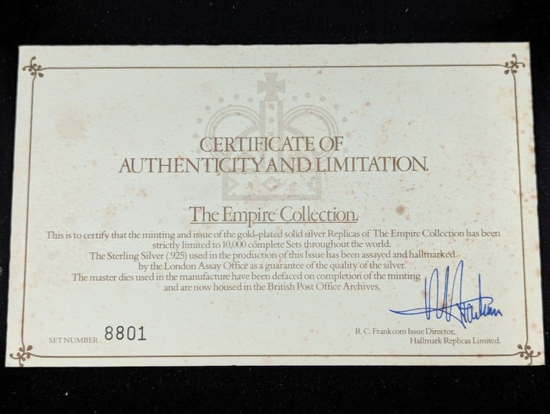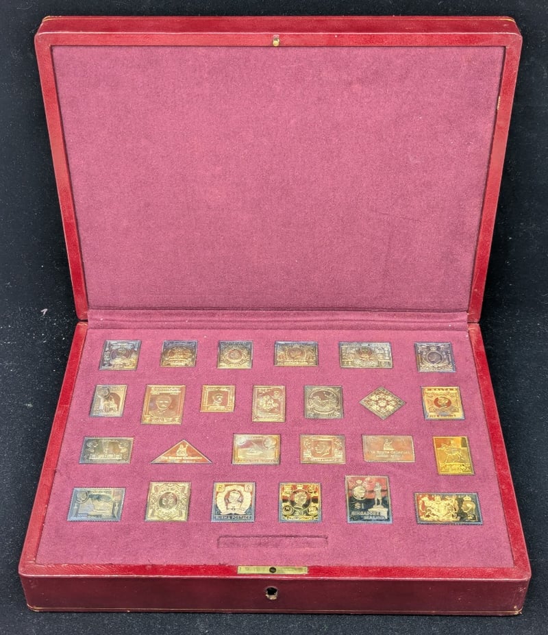 LIMITED EDITION 'THE EMPIRE COLLECTION' GOLD PLATED 925 SILVER REPLICA STAMP SET Edition Number: 8801/10000, Collection Features 25 Empire Collection Replica Stamps, Includes Original Box Includes Certificate Of Authenticity And Limitation VAULT 582955+1