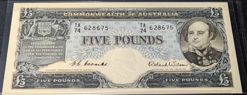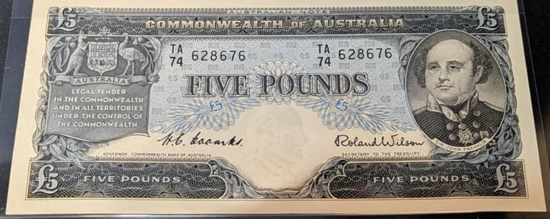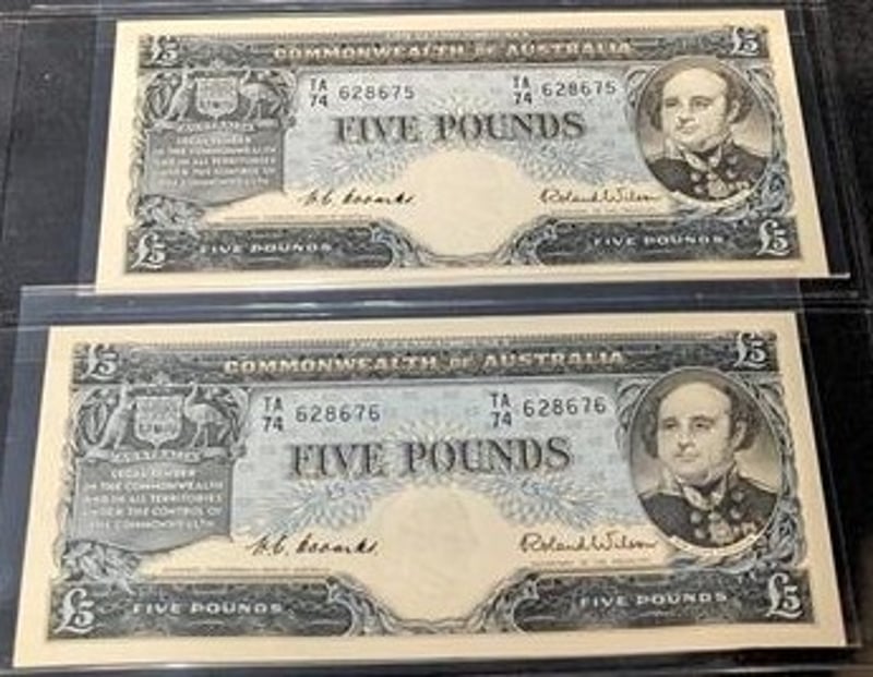 PAIR OF CONSECUTIVE 1960 AUSTRALIAN FIVE POUND BANKNOTES 628675 & 628676 Signatories: Governor H.C. Coombs And Secretary To The Treasury Roland Wilson. SR 233655+6