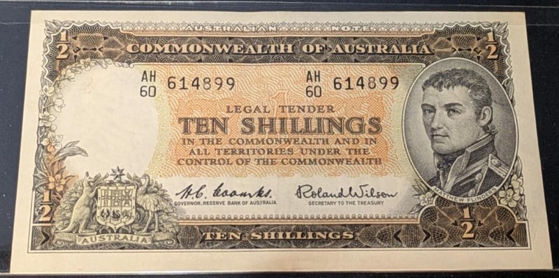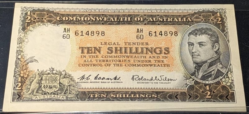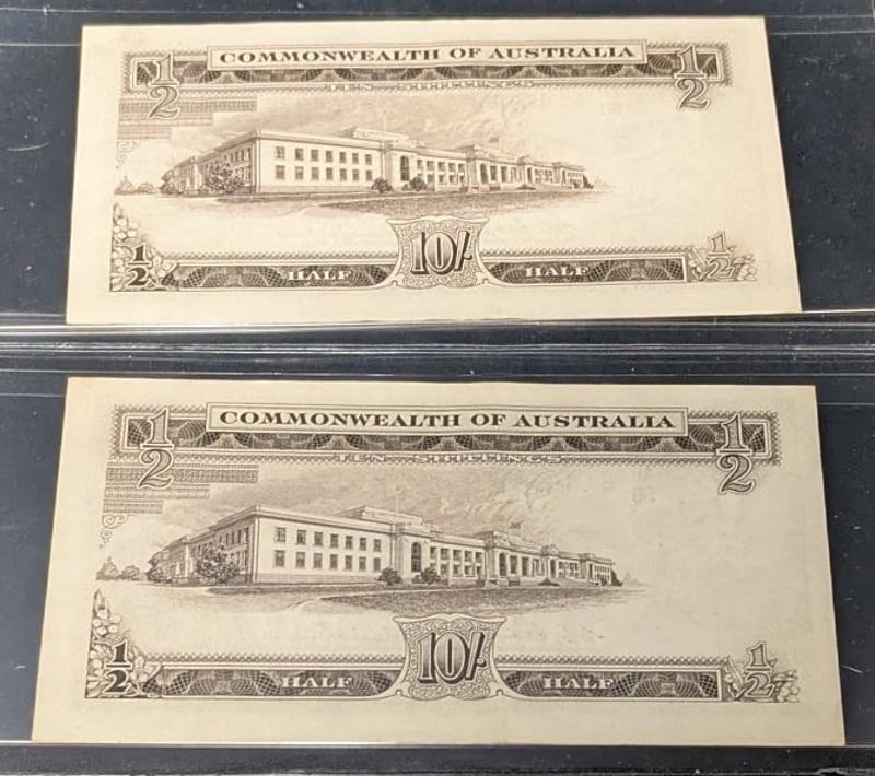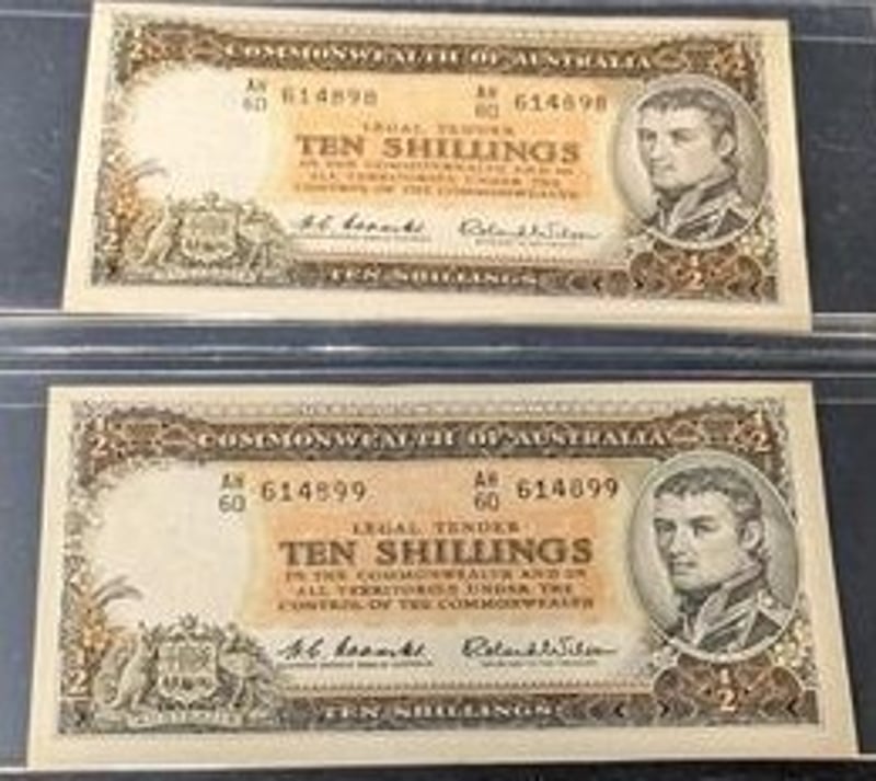 PAIR OF CONSECUTIVE COMMONWEALTH OF AUSTRALIA TEN SHILLINGS BANKNOTES 614898 & 614899 SR 233655+8
