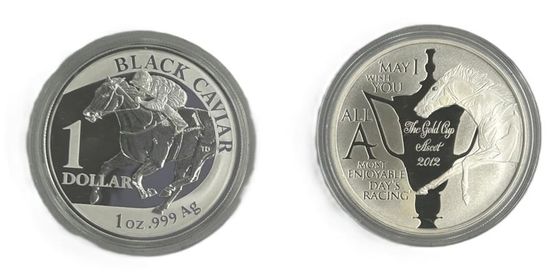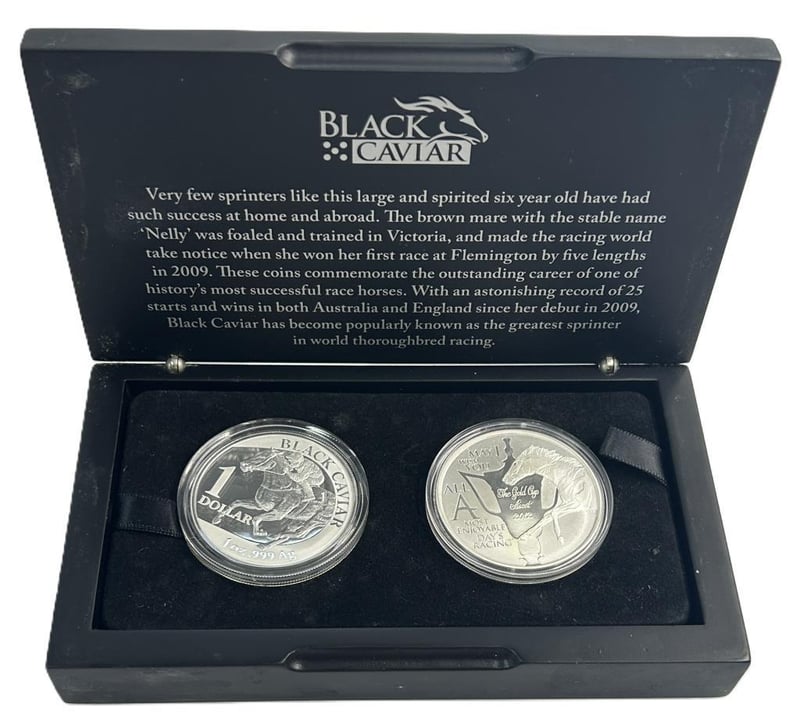 BLACK CAVIAR PERFECTION SILVER PROOF COIN SETA Premium Commemorative Coin Set Celebrating The Legendary Australian Racehorse Black Caviar. This Collectible Edition Includes Two 1Oz Silver Proof Coins (2Oz Total) And Comes Beautifully Presented In The Original Display Box With Commemorative Packaging.Condition: Good - Refer To Images584579+40