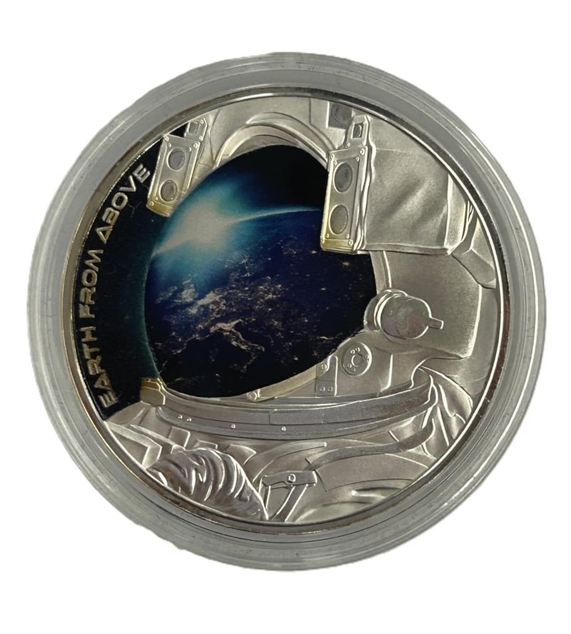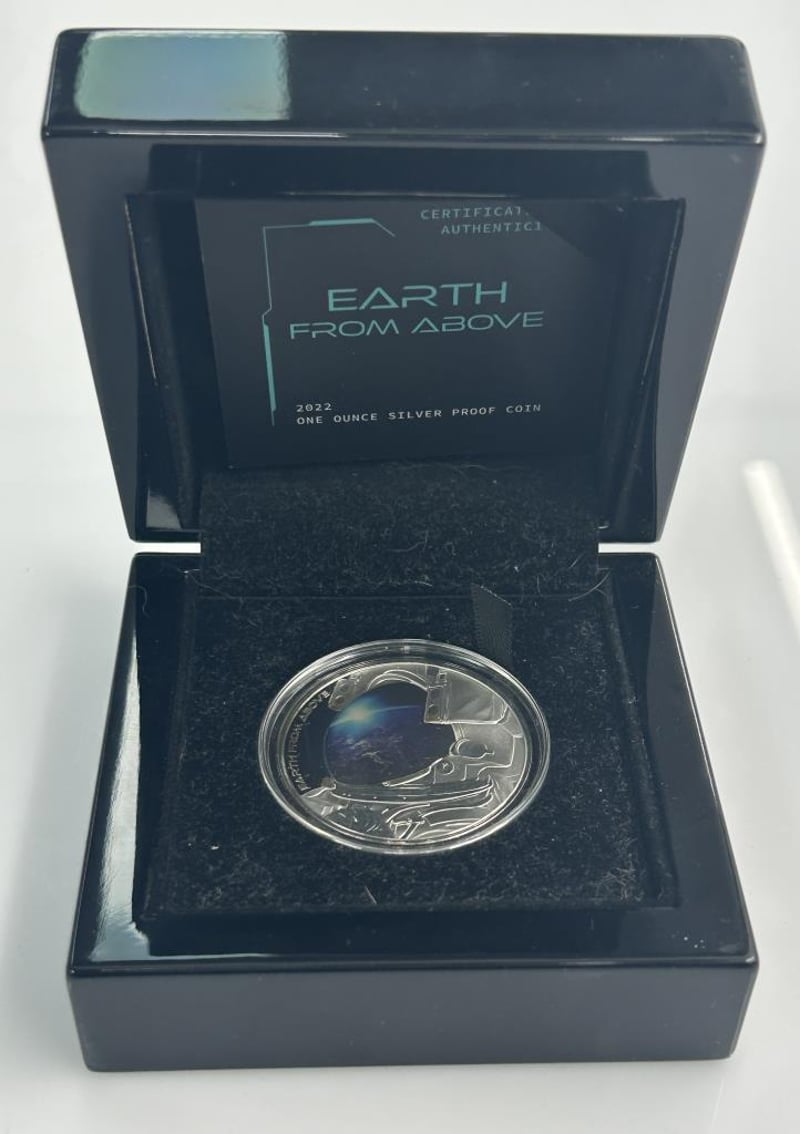 2022 “EARTH FROM ABOVE” ONE OUNCE SILVER PROOF COINCrafted In .999 Fine Silver And Presented In Its Original Display Box With Certificate Of Authenticity. This Beautifully Detailed Piece Features An Astronaut Helmet Design With A Vivid Coloured View Of Earth Reflected In The Visor, Symbolising A Unique Perspective Of Our Planet From Space. Issued By Niue And Struck To Proof Quality, The Coin Offers A Mirror-Like Finish With Sharp Detailing, Making It Highly Collectible. Comes Complete With Original Case And Coa, Overall In Excellent Condition With Only Minor Surface Marks On The Capsule.Condition: Good - Refer To Images584579+48
