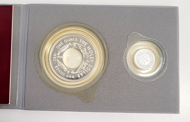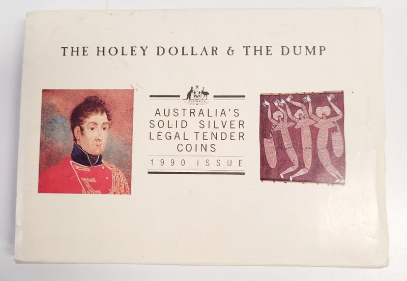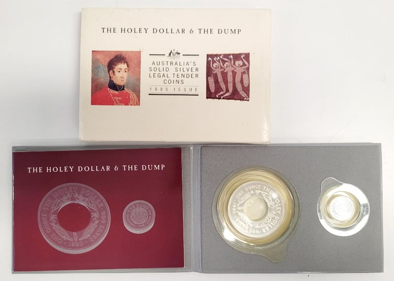 THE HOLEY DOLLAR & THE DUMP 1990 ISSUE AUSTRALIAN SOLID SILVER LEGAL TENDER COINS Commemorative 1990 Issue Australian Solid Silver Legal Tender Coin Set Featuring The Historically Significant Holey Dollar And The Dump. Set Includes Two Encapsulated Silver Coins With Original Presentation Case And Documentation. Condition: Good - Refer To Images 488600+6