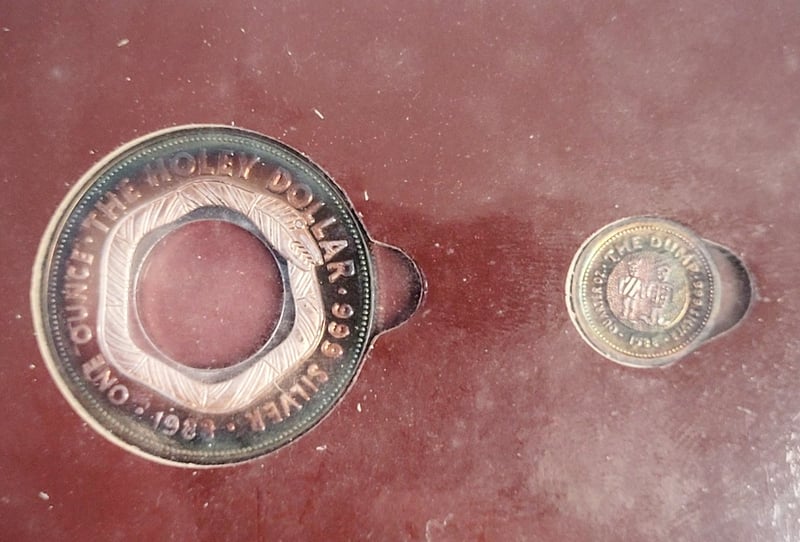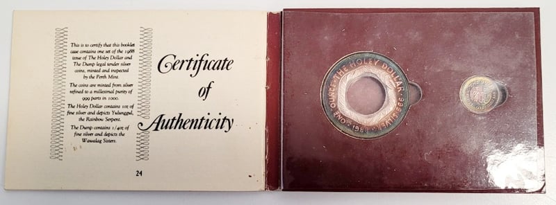 THE HOLEY DOLLAR & THE DUMP - 1988 AUSTRALIAN SILVER COMMEMORATIVE COIN SET Authentic 1988 Australian Silver Commemorative Coin Set Featuring Replica Reproductions Of The Historic Holey Dollar And The Dump Condition: Good - Refer To Images 488600+7