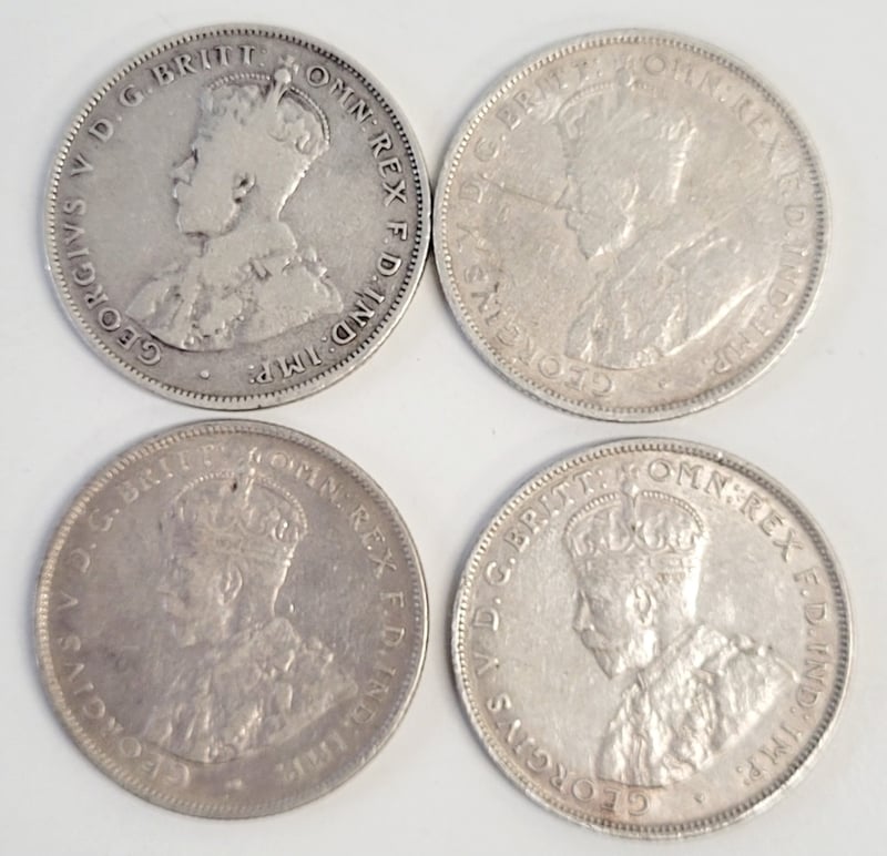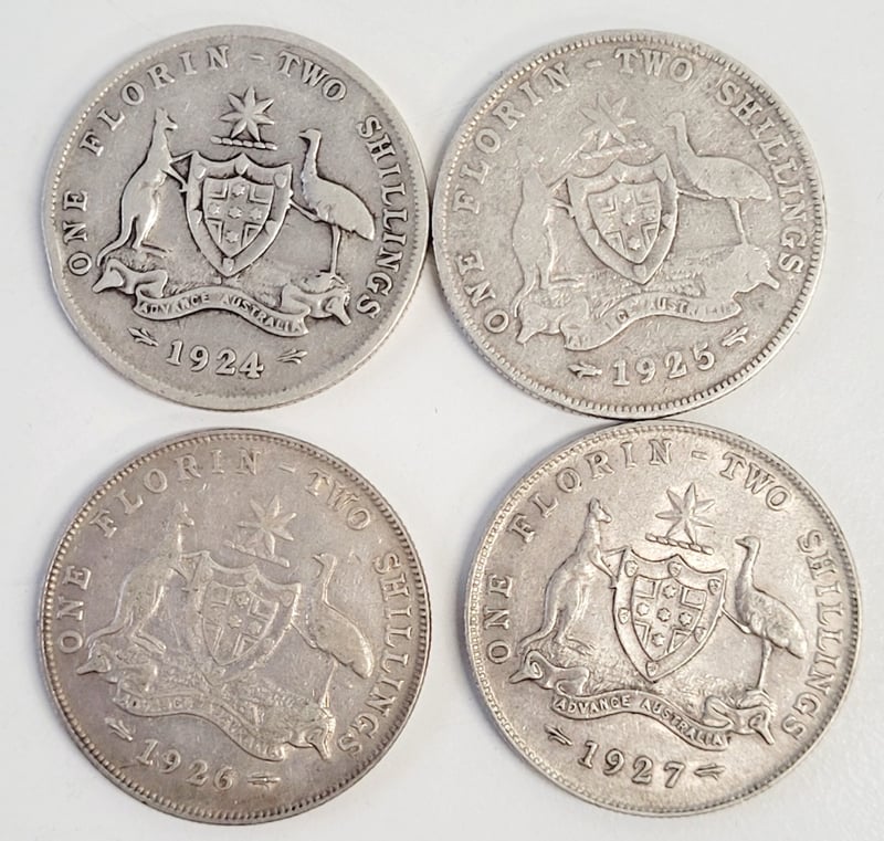 COLLECTION OF AUSTRALIAN SILVER FLORIN COINS (1924-1927) A Curated Assemblage Of Four Australian Silver Florin Coins Spanning 1924-1927, Featuring The Heraldic Coat Of Arms And Kangaroo Reverse Designs Characteristic Of The Period. Condition: Fair - Refer To Images 488600+9