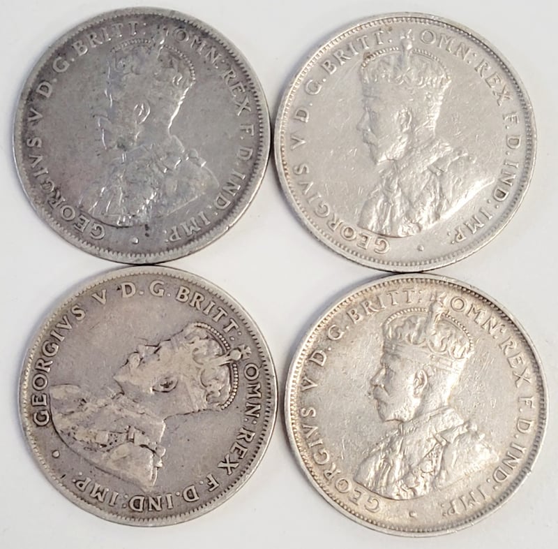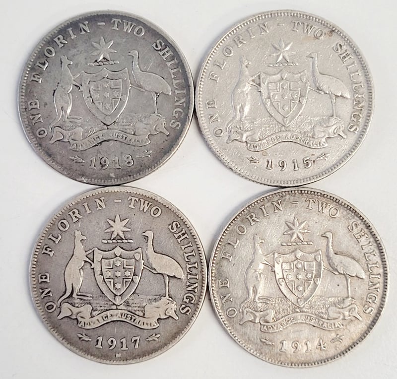 COLLECTION OF SIX AUSTRALIAN FLORIN TWO SHILLING SILVER COINS (1913-1917) A Curated Collection Of Six Australian Silver Florins Spanning The Early 20Th Century. The Lot Comprises Coins Dated 1913, 1914, 1915, And 1917 Condition: Fair - Refer To Images 488600+11