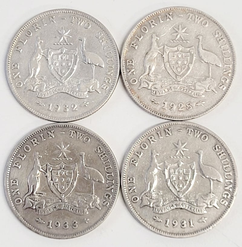COLLECTION OF FOUR AUSTRALIAN TWO SHILLING SILVER COINS (1928, 1931, 1932, 1933) Lot Comprising Four Australian Two Shilling Coins Spanning 1928-1933. Condition: Good - Refer To Images 488600+15