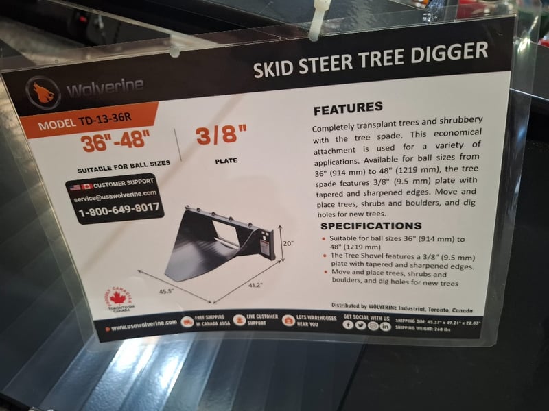 FACTORY DIRECT ** Unused WOLVERINE, Tree Digger - TD-13-36RSkid Steer Tree Digger AttachmentsSuitable for ball sizes 36" (914 mm) to 48" (1219 mm), the Tree Shovel features a 3/8" (9.5 mm) plate with tapered and sharpened edges. Move and place trees, shrubs and boulders, and dig holes for new treesSize Approx: 1150*1250*580Weight Approx: 101 kgPlease note: minor scuffs and marks may be evident For more information Contact King Cheung on 0477987576 or [email protected] *** PLEASE NOTE Collections must occur within 7 days of Auction Ending*** Note: OEM images and VIDEOS shown are for illustration purposes only, and used as a guide only, inspections highly recommended. ZTCU4518468