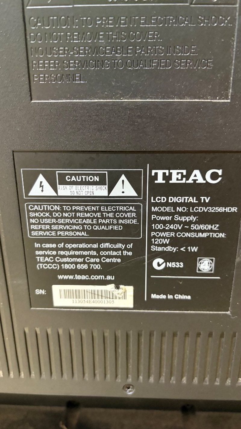 TEAC TV with TEAC Remote. Model: LCDV3256HDR Dimensions: H 57cm, W 79cm, D 24cm
