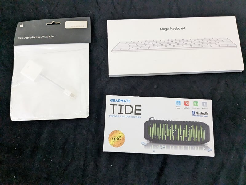 APPLE TECH ACCESSORIES BUNDLE - MAGIC KEYBOARD, GEARMATE TIDE SPEAKER, MINI DISPLAY PORT ADAPTERCurated Collection Of Three Apple-Compatible Peripherals Including An Apple Magic Keyboard (Wireless, Ultra-Slim Design), Gearmate Tide Portable Bluetooth Speaker (Ip65 Water-Resistant, 33Ft Range, 8-Hour Battery), And Apple Mini Displayport To Dvi Adapter. All Items Remain In Original Retail Packaging, Appearing Unused And In Pristine Condition.Condition: Good - Refer To Images584548+79