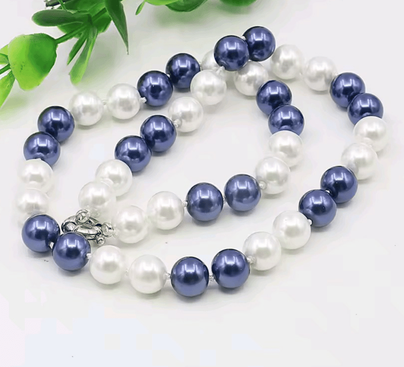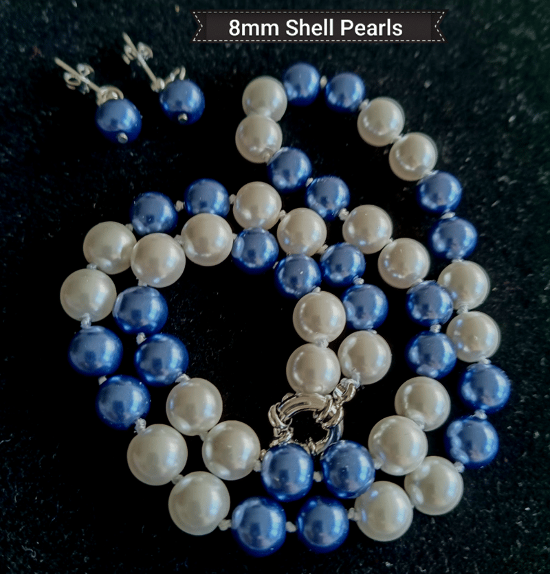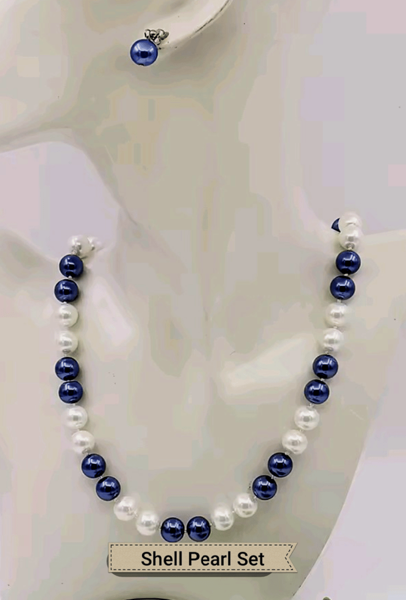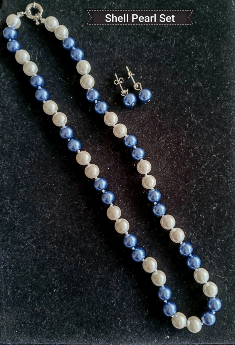 BLUE AND WHITE SHELL PEARL NECKLACE WITH 8MM PEARL STUD EARRINGS