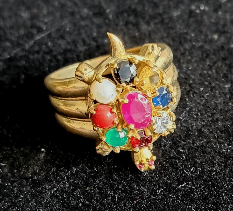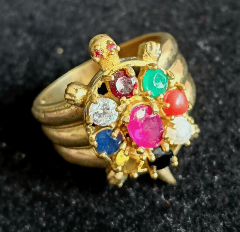 GOLD PLATED NAVRATNA TURTLE RING 9 GEMSTONES