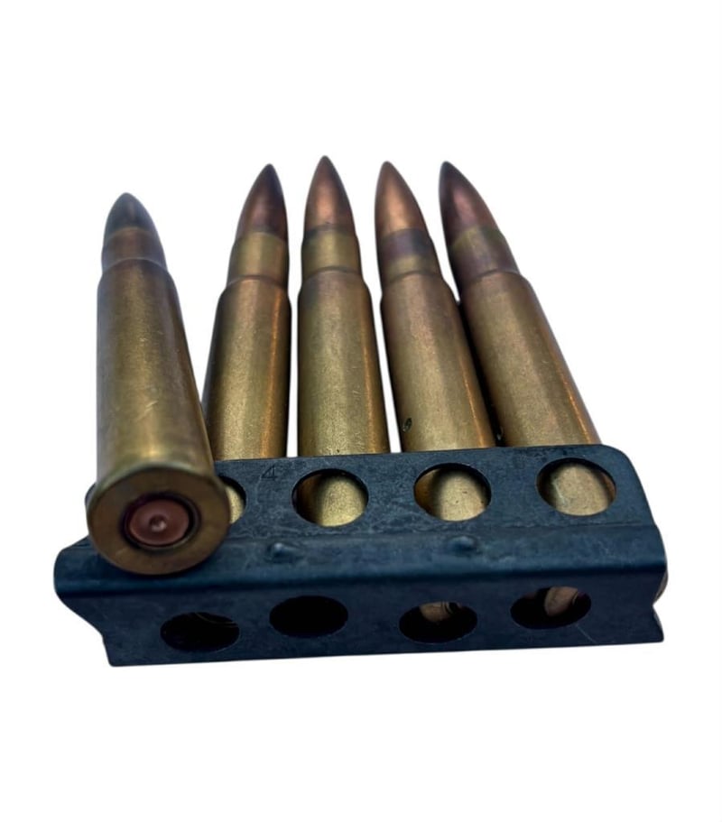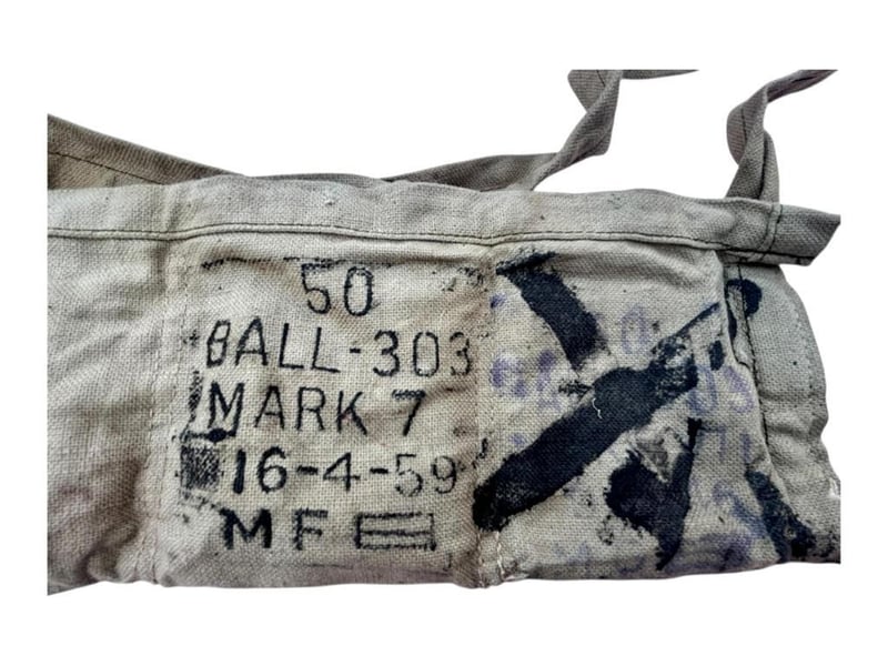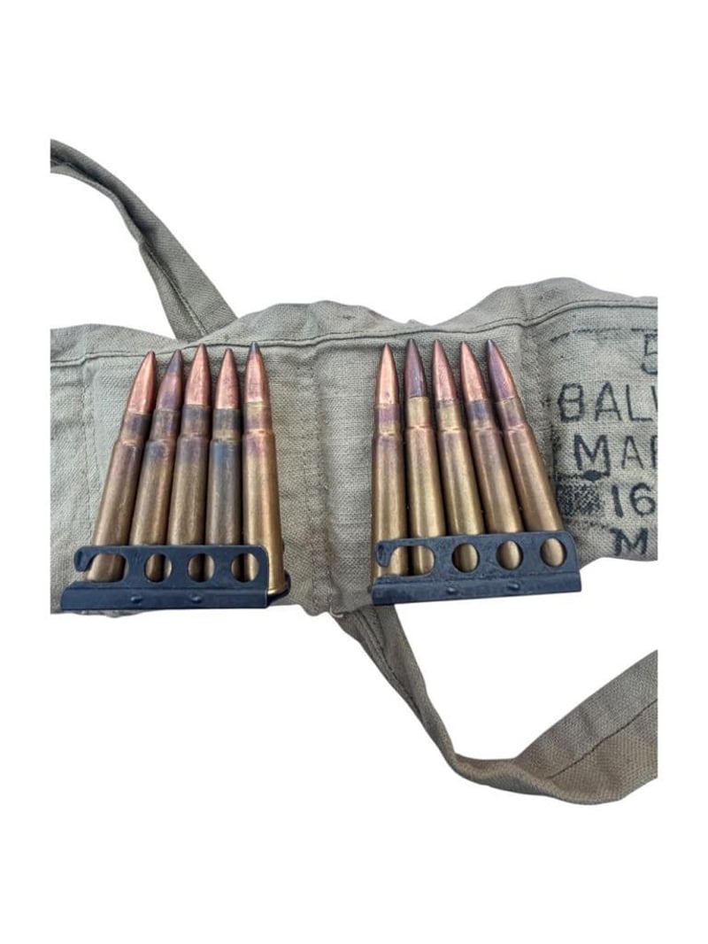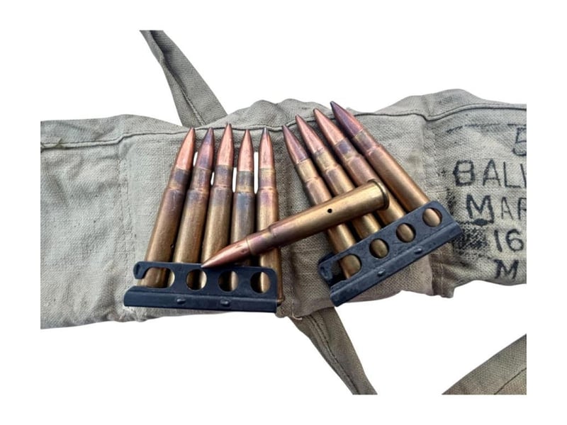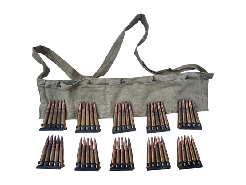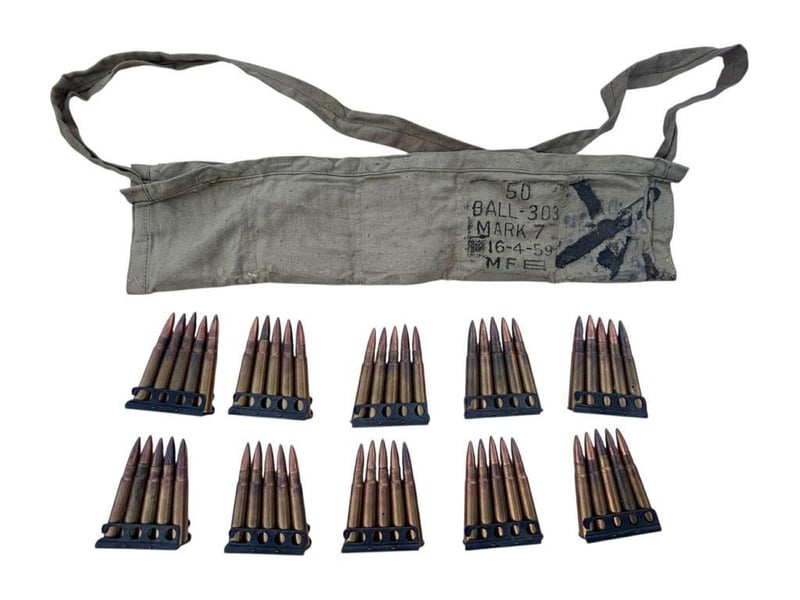 NERT 50 X .303 FMJ MILITARY ROUNDS, STRIPPER CLIP AND BANDOLIER This Lot Is Made Up Of 50 Rounds Of Inert .303 Rounds, 10 X Stripper Clips And A Bandolier. Inert Ammo, For Display Purposes. Condition: Good - Refer Images233666+45