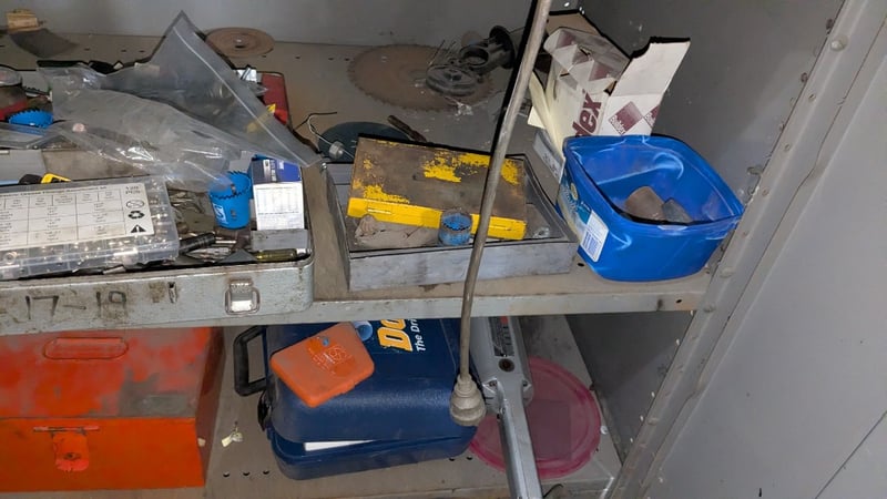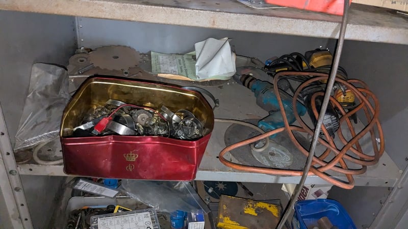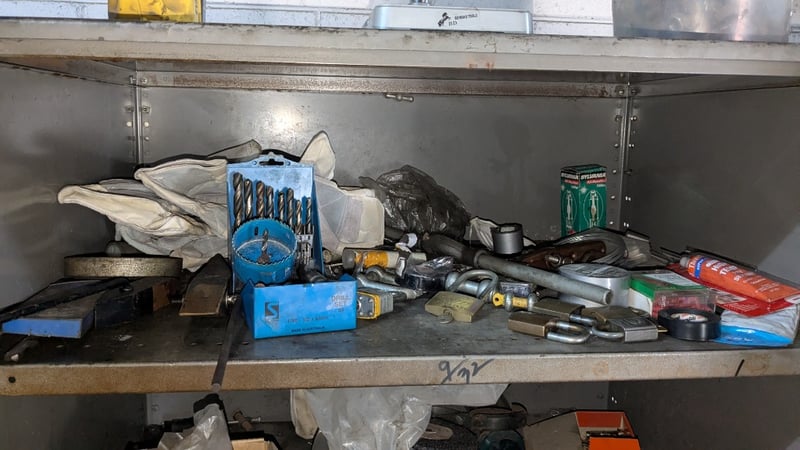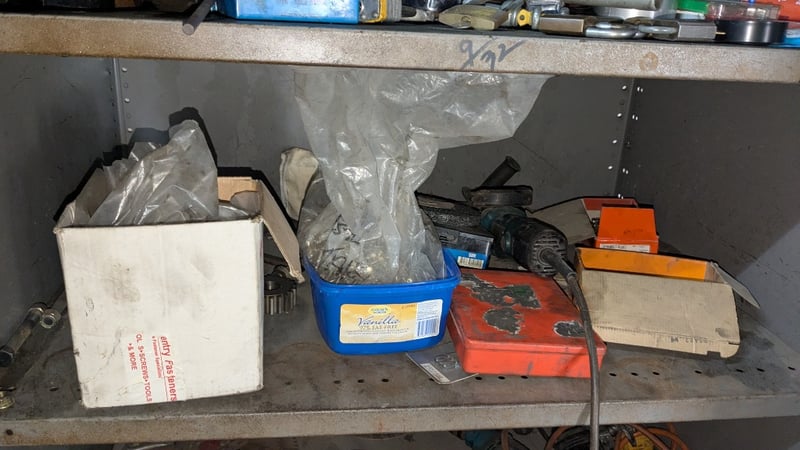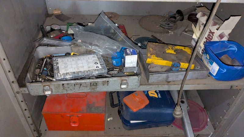 Metal Storage Cabinet, 5 Tier, Lockable, Includes Drill Bits, Hose Clamps, Pad Locks and more