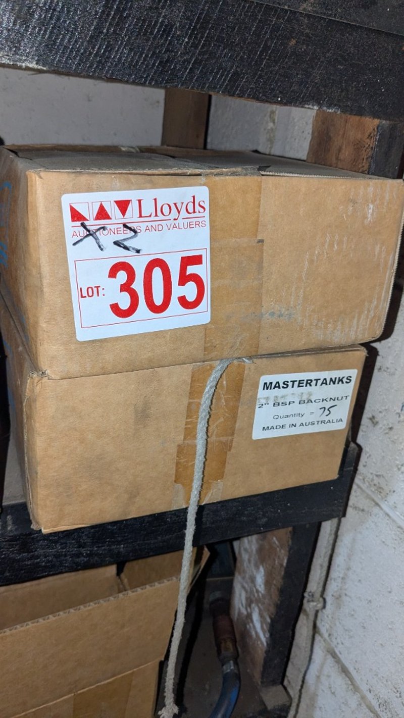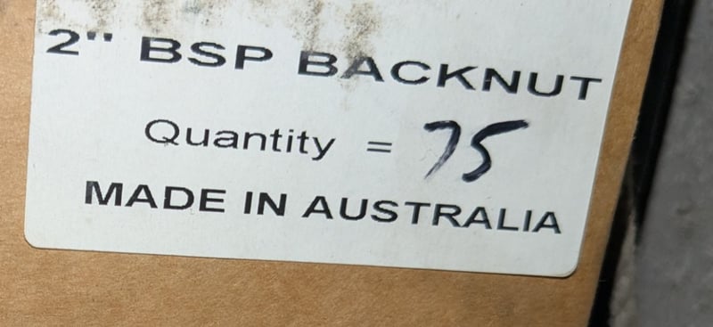 2' BSP Backnut Brass , 75 per Box, Quantity 2 Boxes SOLD AS LOT NOTE: INSPECTIONS HIGHLY RECOMMENDED, BUYER TO PROVIDE OWN LABOUR AND TOOLS FOR SAFE REMOVAL OF ASSETLocation: Marleston, SA Collections: Monday the 11th to Friday the 15th of May Contact: Gage Mackay - 0458 732 549 or [email protected]