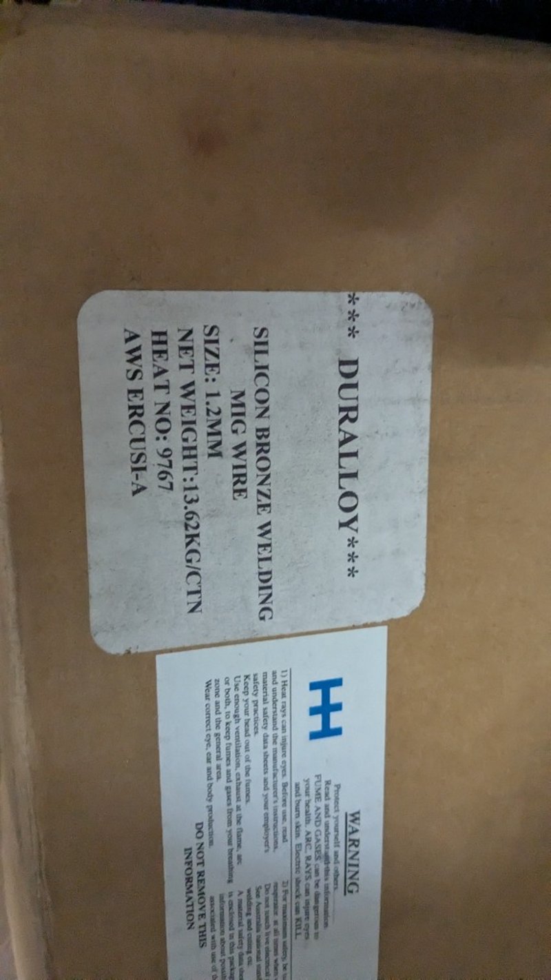 Silicon Bronze Welding WireSize: 1.2mmWeight: 13.62kgNOTE: INSPECTIONS HIGHLY RECOMMENDED, BUYER TO PROVIDE OWN LABOUR AND TOOLS FOR SAFE REMOVAL OF ASSETLocation: Marleston, SA Collections: Monday the 11th to Friday the 15th of May Contact: Gage Mackay - 0458 732 549 or [email protected]