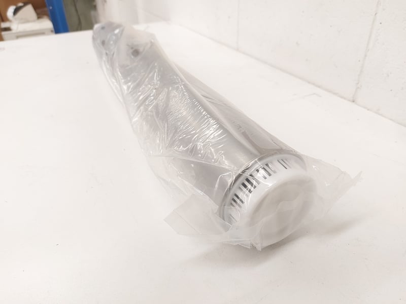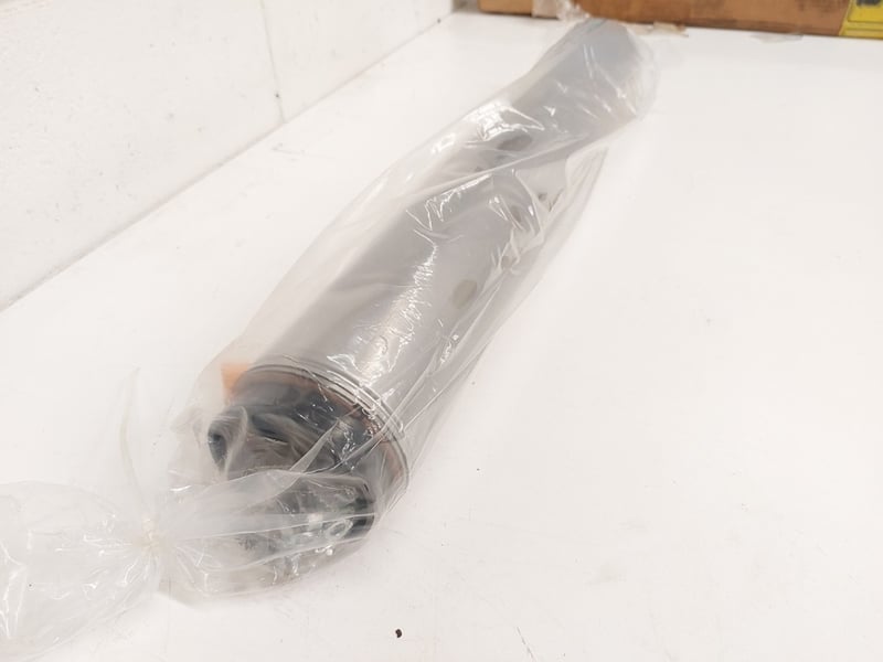 Industrial Conveyor Roller - Heavy-duty metal roller body, shafted ends with bearing housings, supplied with original installation / handling manual.