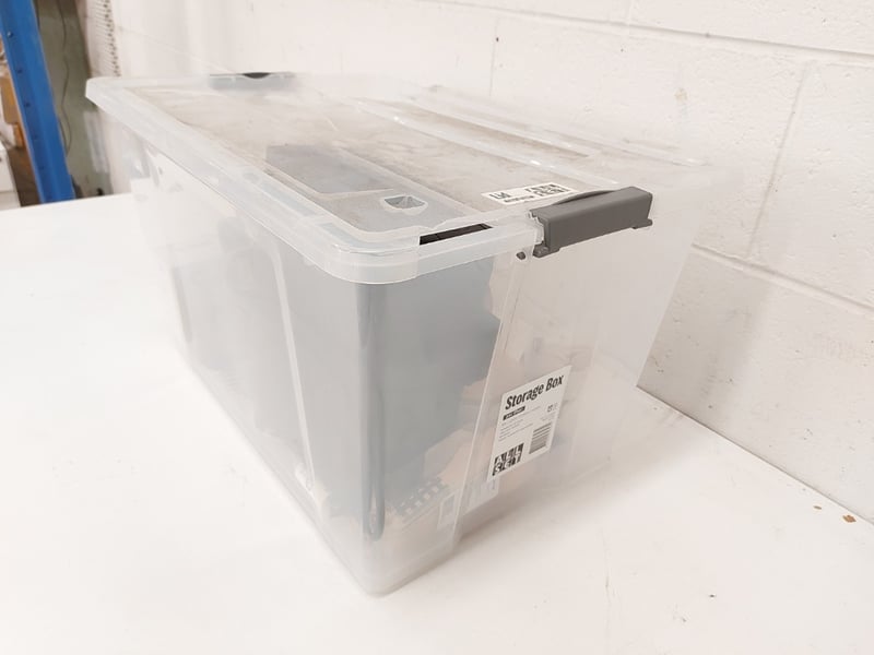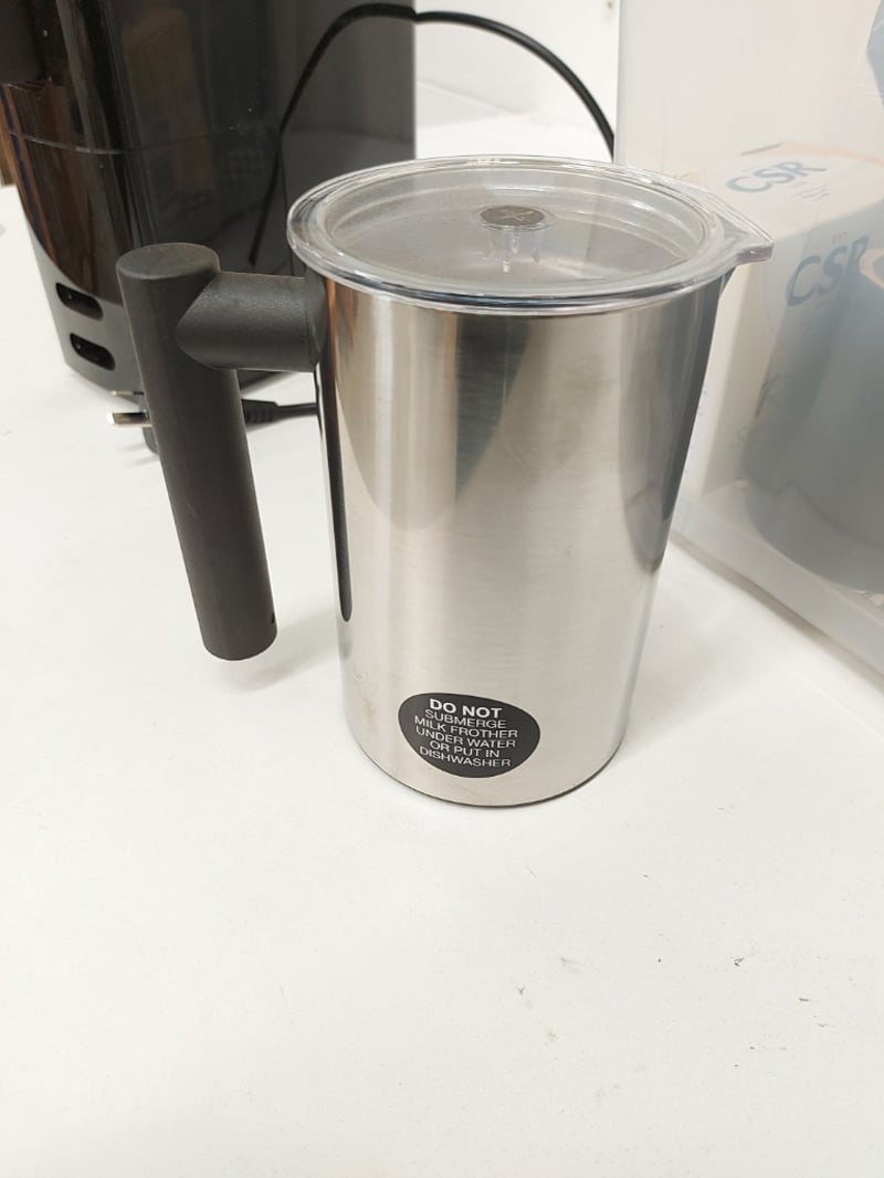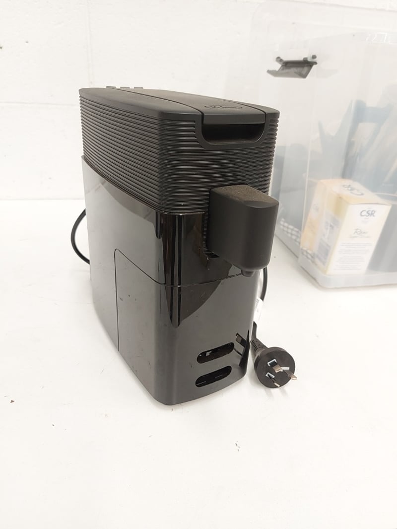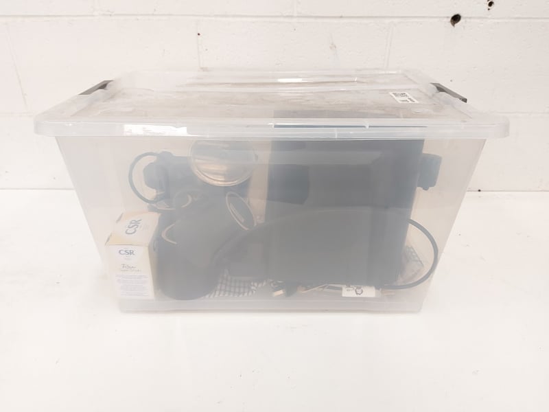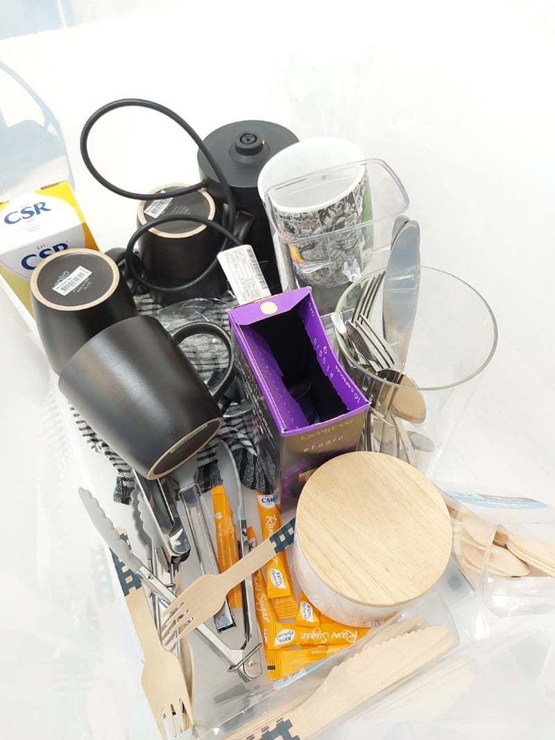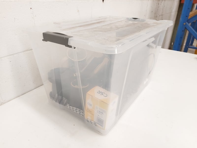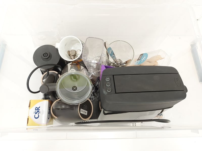 Tub of assorted kitchen lot. Items include compact pod coffee machine, cutleries, mugs & more. Sold as lot