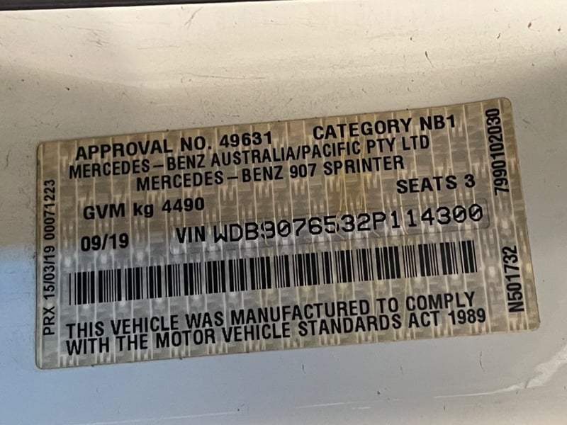 2019 Mercedes benz Sprinter 907 Year: 2019 Make: Mercedes benz Model: Sprinter Series: 907 Body: 4-Door Van Drive Type: Rear wheel drive Engine: 2.1 Diesel Transmission: Automatic Colour: White Seats: 3 Description/extras: Air Conditioning, Power windows, SRS, Alloy wheels, AUX / USB, Reverse camera, Central locking. VIN: WDB9076532P114300 ENG No: 65195835097547 (AS PER PPSR) Sold unregistered (Key #RA42 Marple) Lloyds stock #580687+1